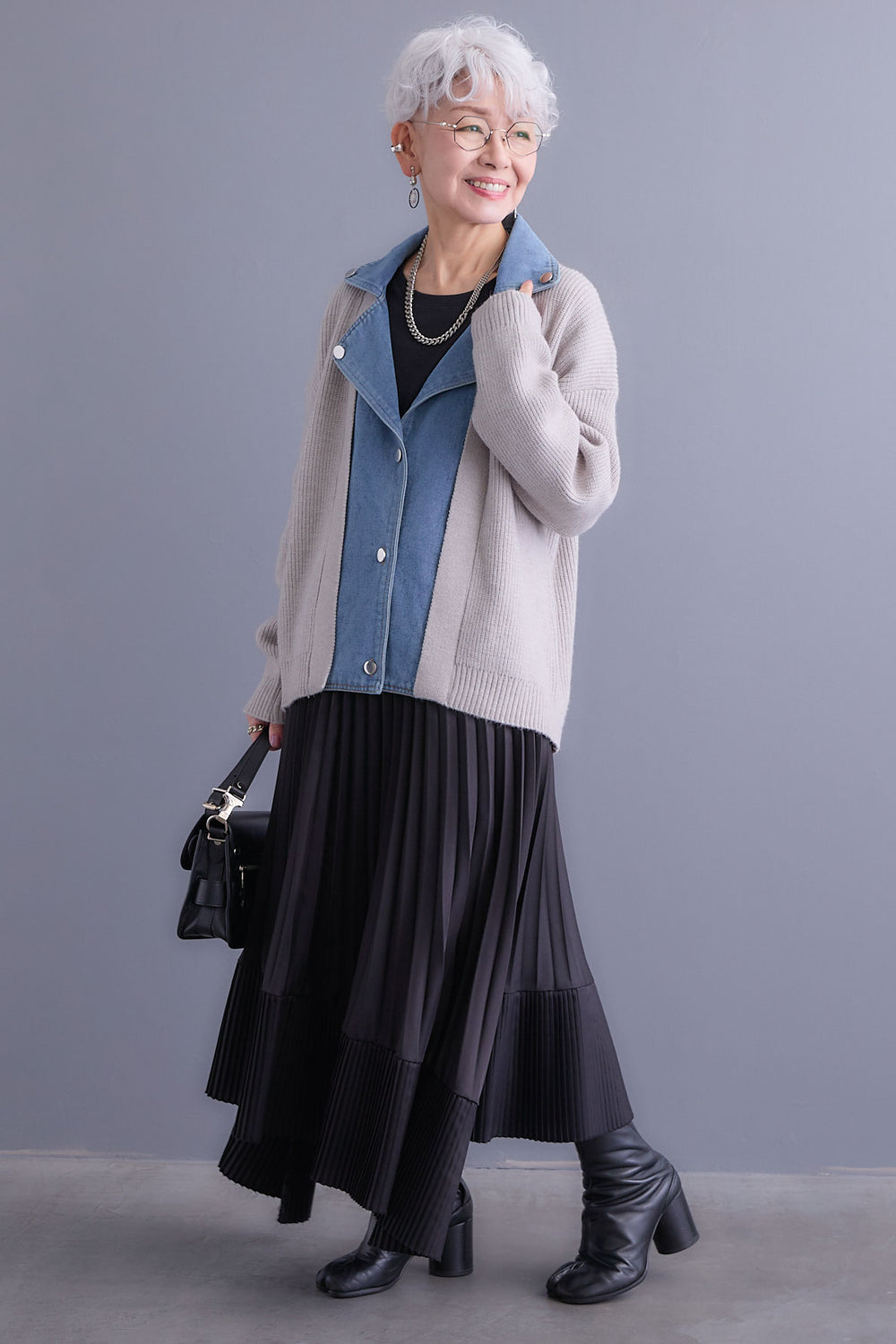 【SET】デニムライダースニットカーディガン+アシンメトリープリーツスカート(2set)