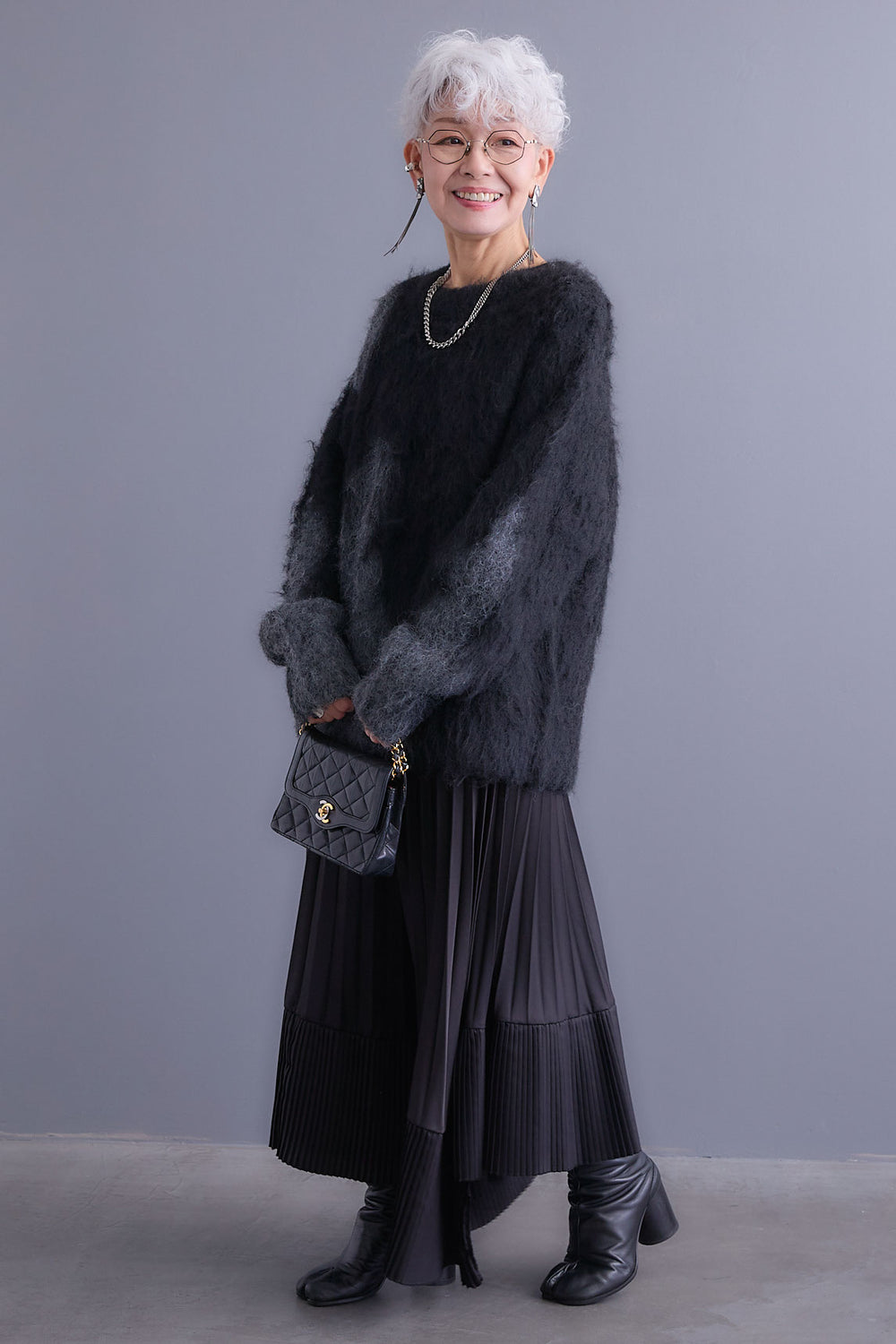 【SET】アシンメトリーオーバーニット+ツイードロングチェスターコート+アシンメトリープリーツスカート(3set)