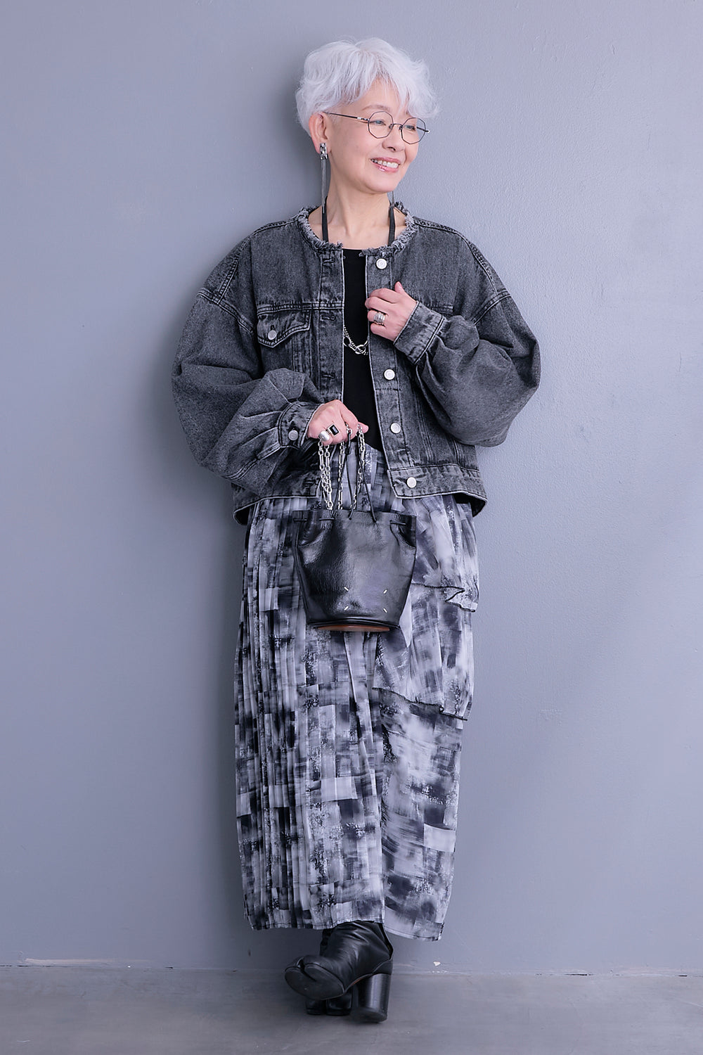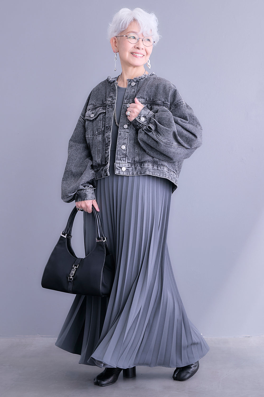 【SET】ボリュームスリーブノーカラーデニムジャケット+プリーツストレッチロングワンピース(2set)