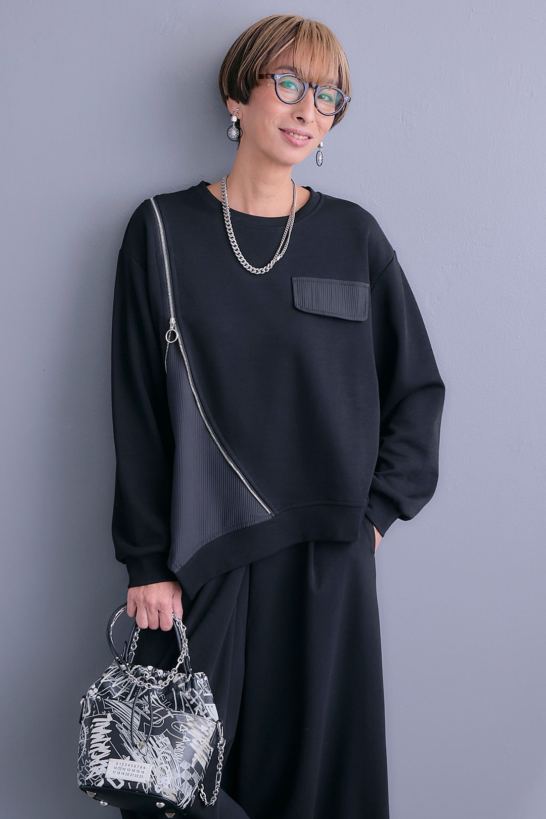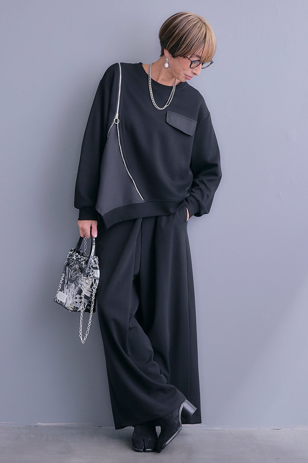 【SET】ショルダーZIPアシメデザインプルオーバー+ラップワイドモードパンツ(2set)