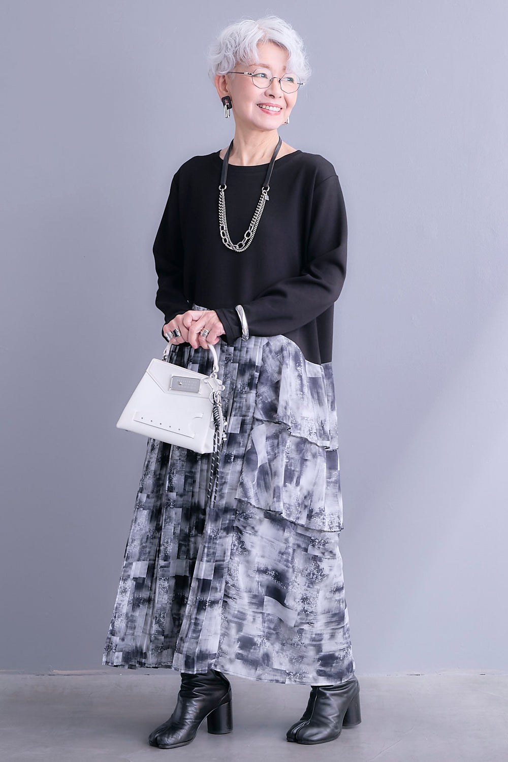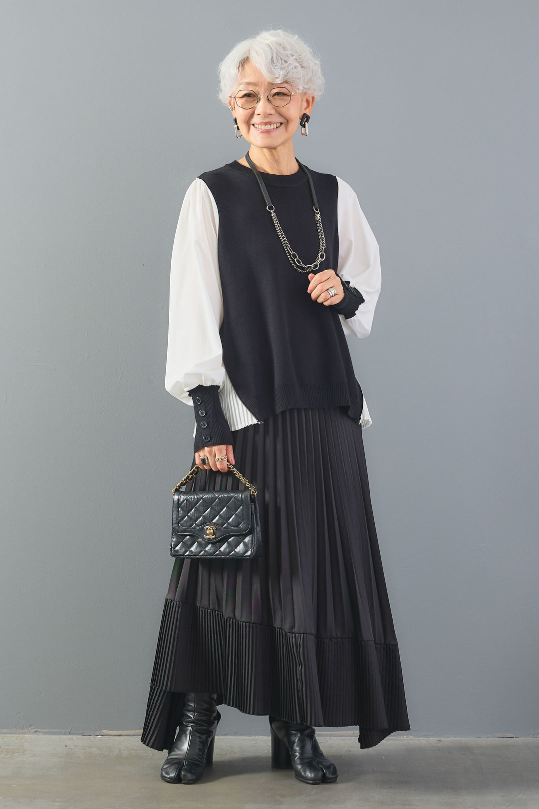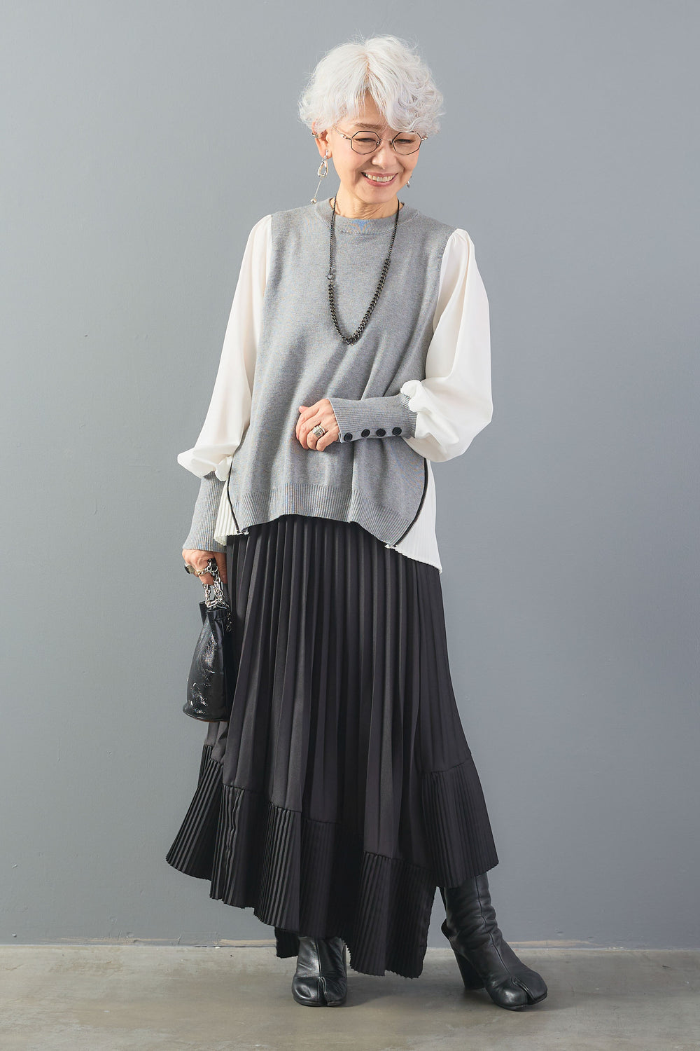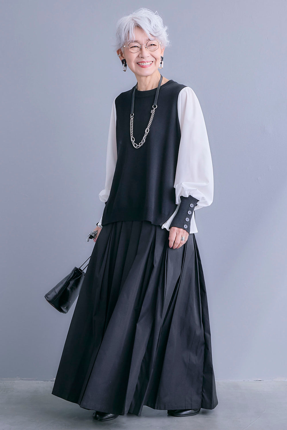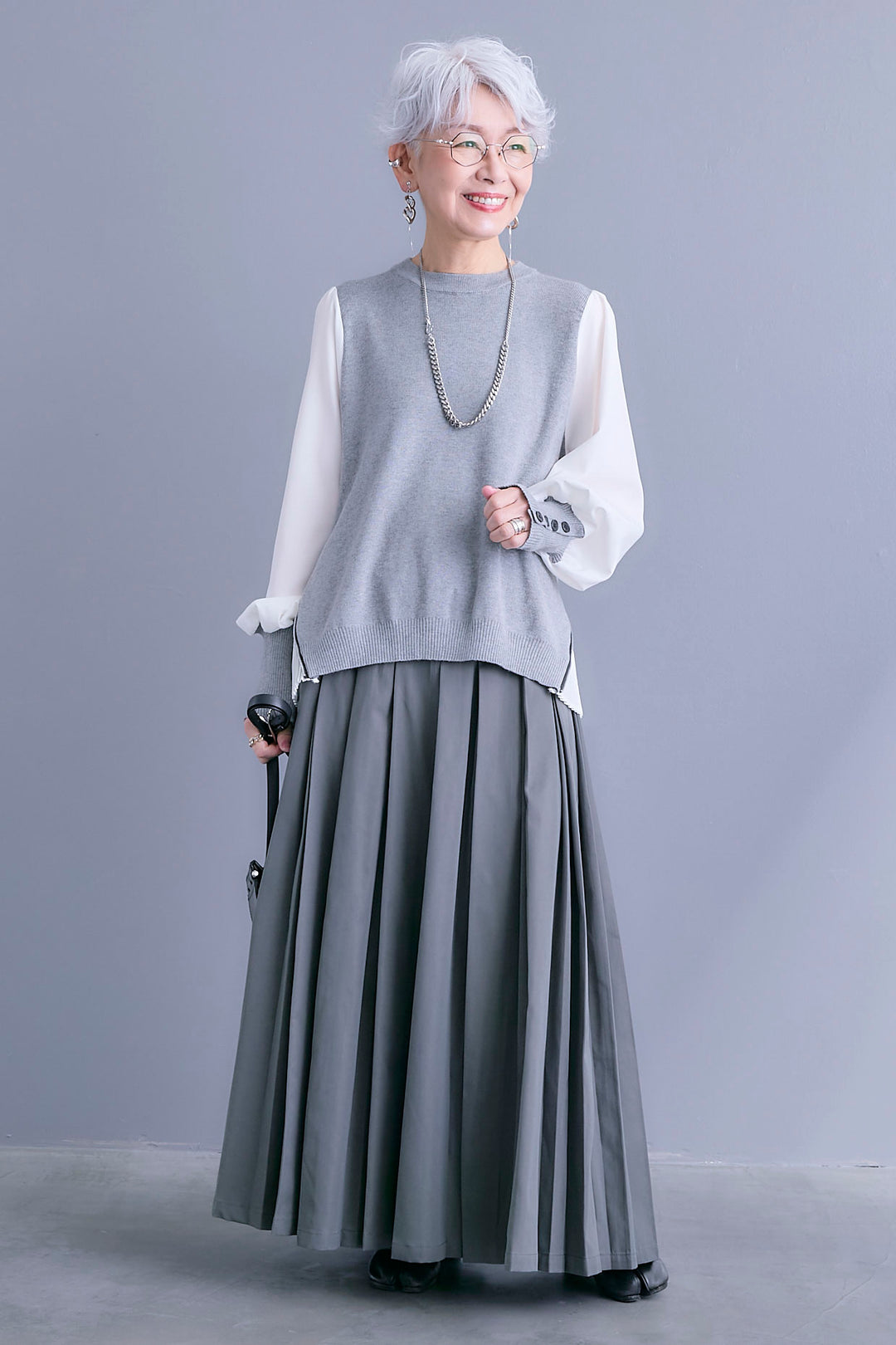 【SET】ZIPサイドプリーツニットコンビプルオーバー+シャークスキンWタックプリーツスカート(2set)