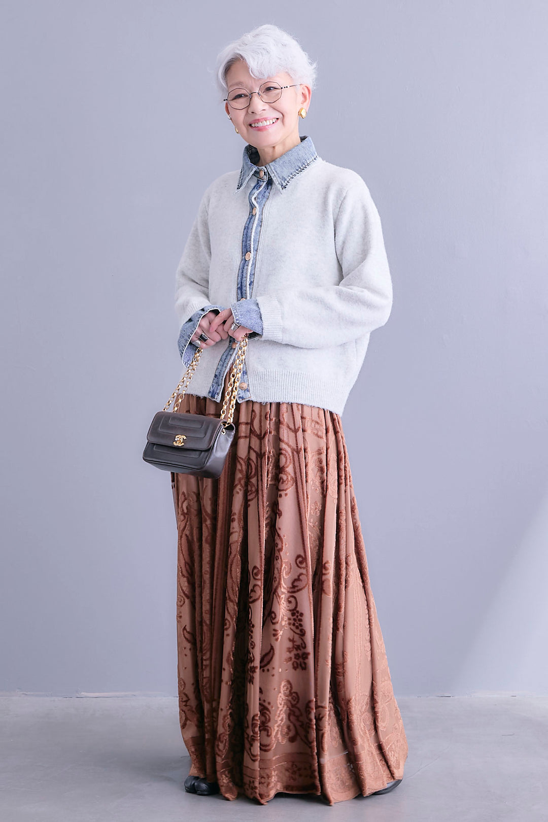 【SET】デニムコンビニットカーディガン+フロッキージャガードチュールロングスカート(2set)