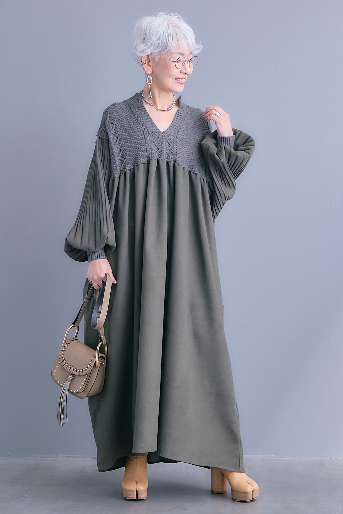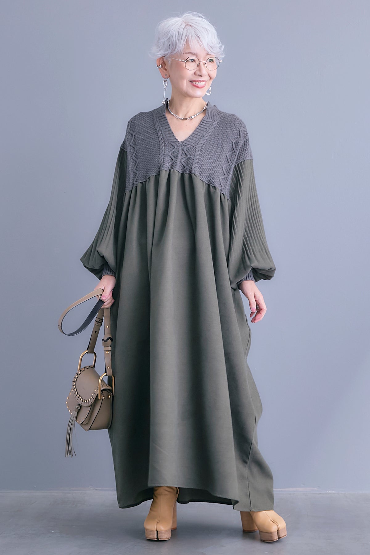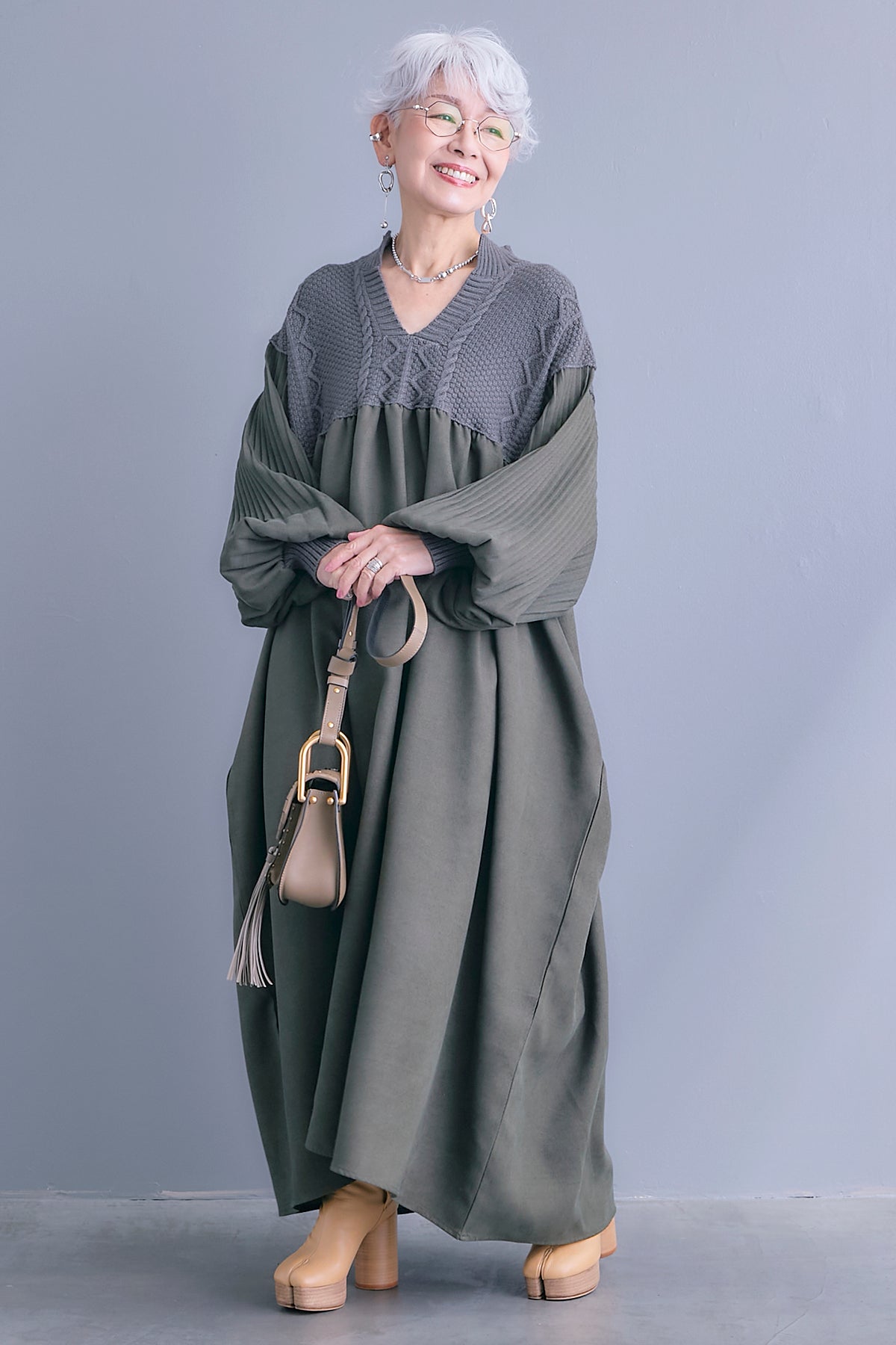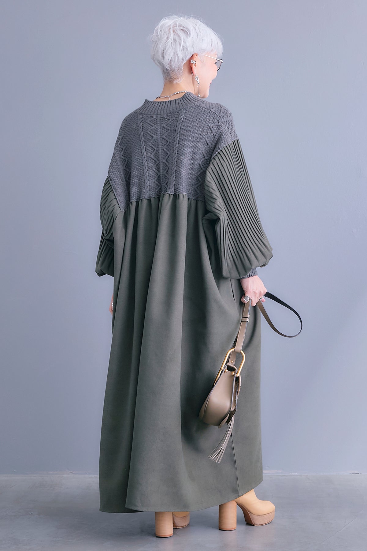 ニットとコーデュロイを切り替えた、異素材コンビが印象的なキーネックワンピース。上身頃は編み柄を効かせたニット素材で、程よい立体感と表情をプラス。スカート部分は落ち感のあるコーデュロイ素材を採用し、ゆったりとした分量感が自然なドレープを描きます。キーネックデザインが首元をすっきり見せ、1枚で着映えするバランスに仕上げたアイテムです。