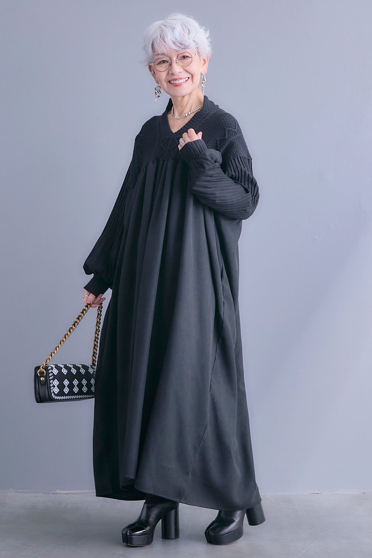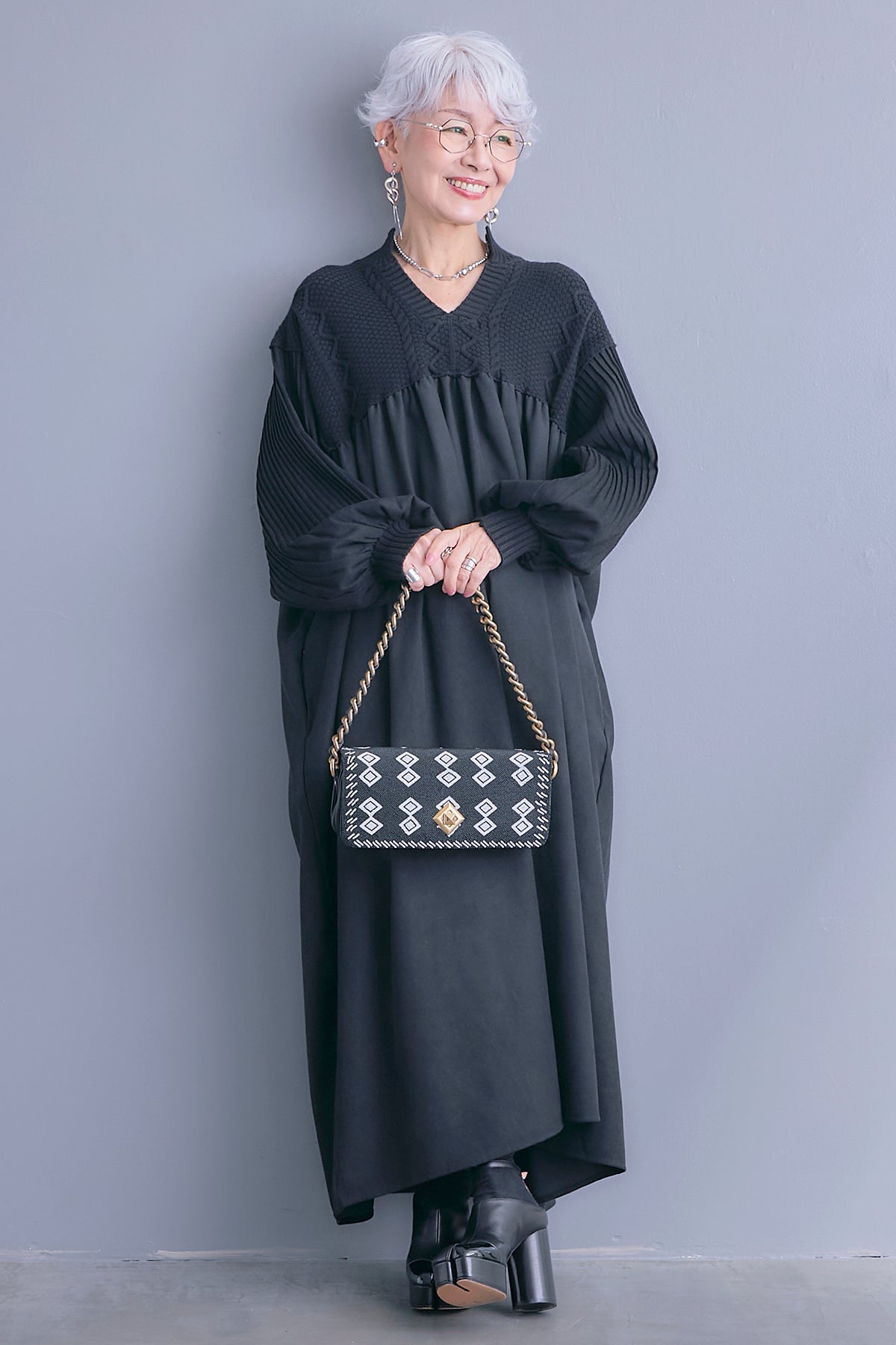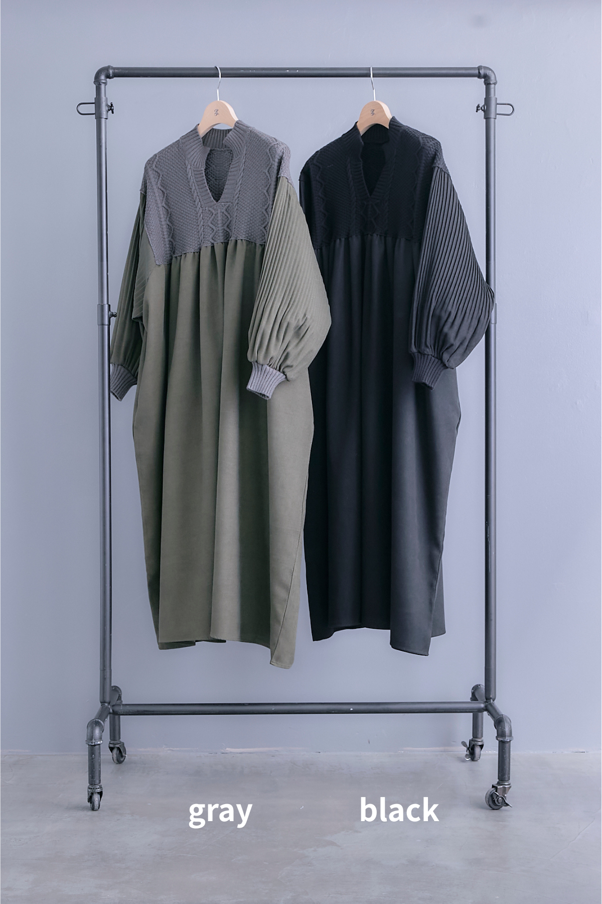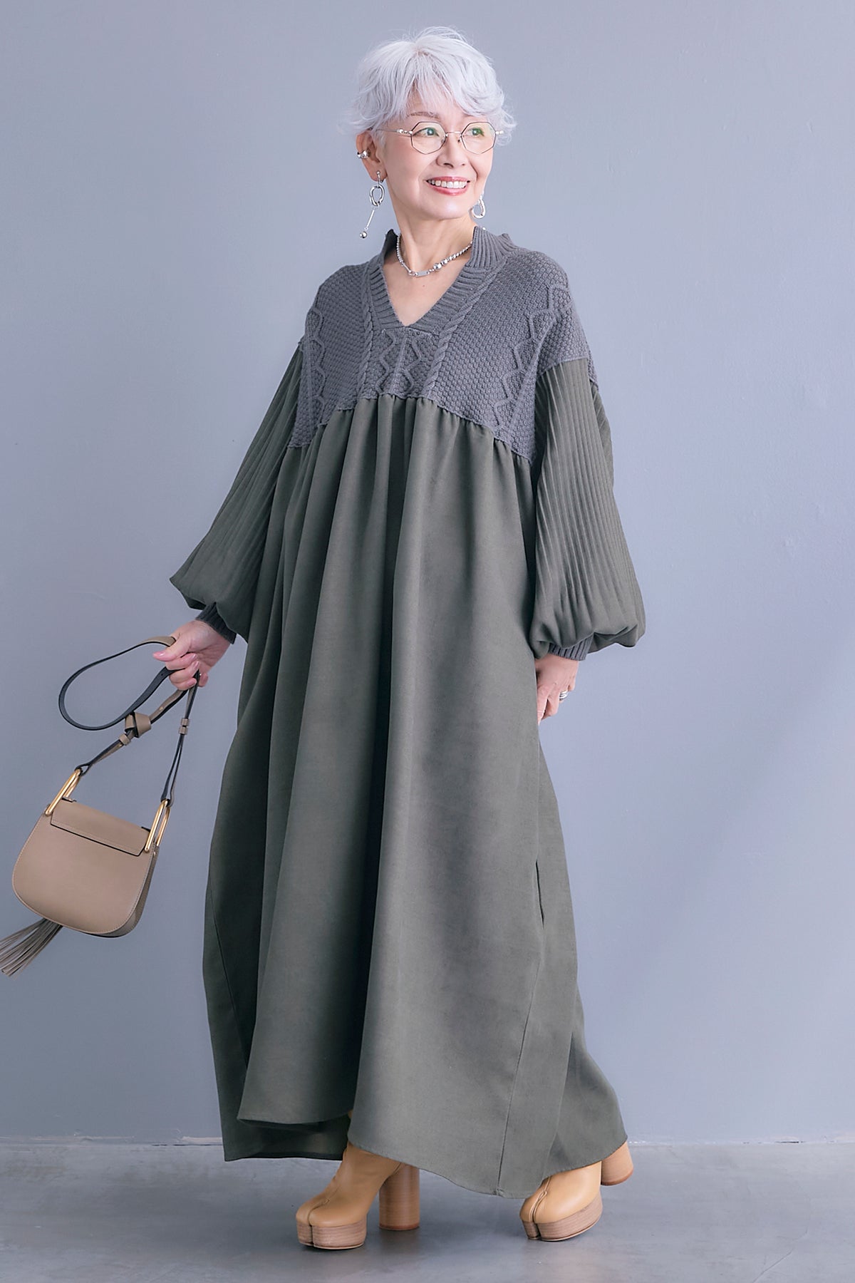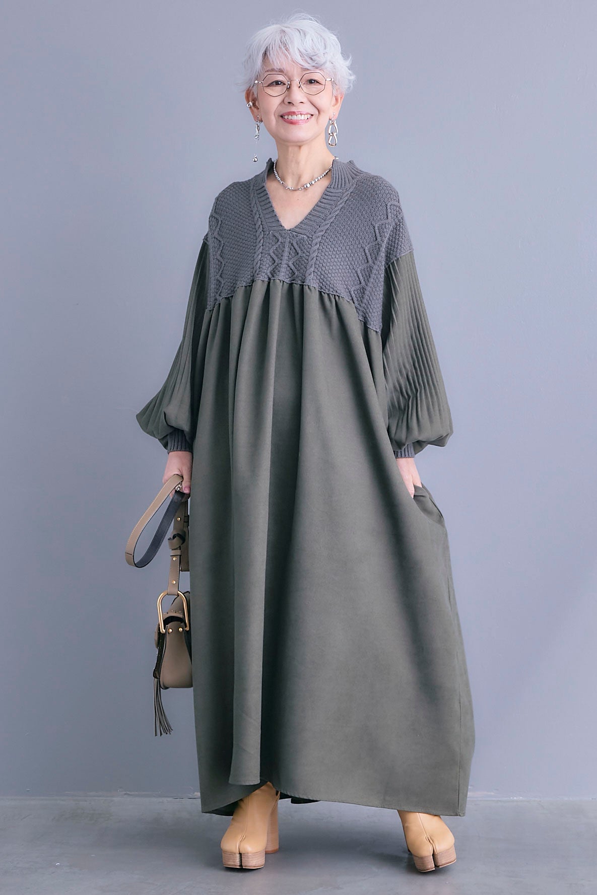 ニットとコーデュロイを切り替えた、異素材コンビが印象的なキーネックワンピース。上身頃は編み柄を効かせたニット素材で、程よい立体感と表情をプラス。スカート部分は落ち感のあるコーデュロイ素材を採用し、ゆったりとした分量感が自然なドレープを描きます。キーネックデザインが首元をすっきり見せ、1枚で着映えするバランスに仕上げたアイテムです。