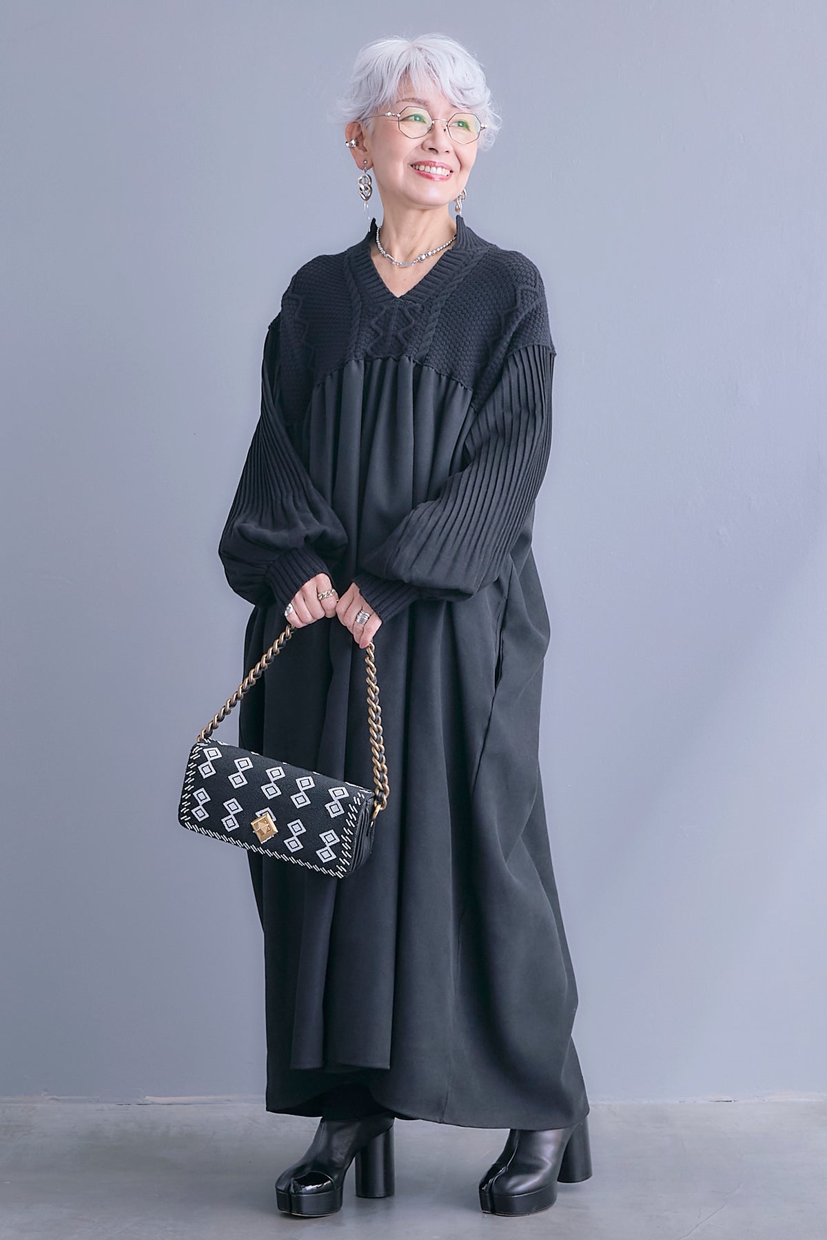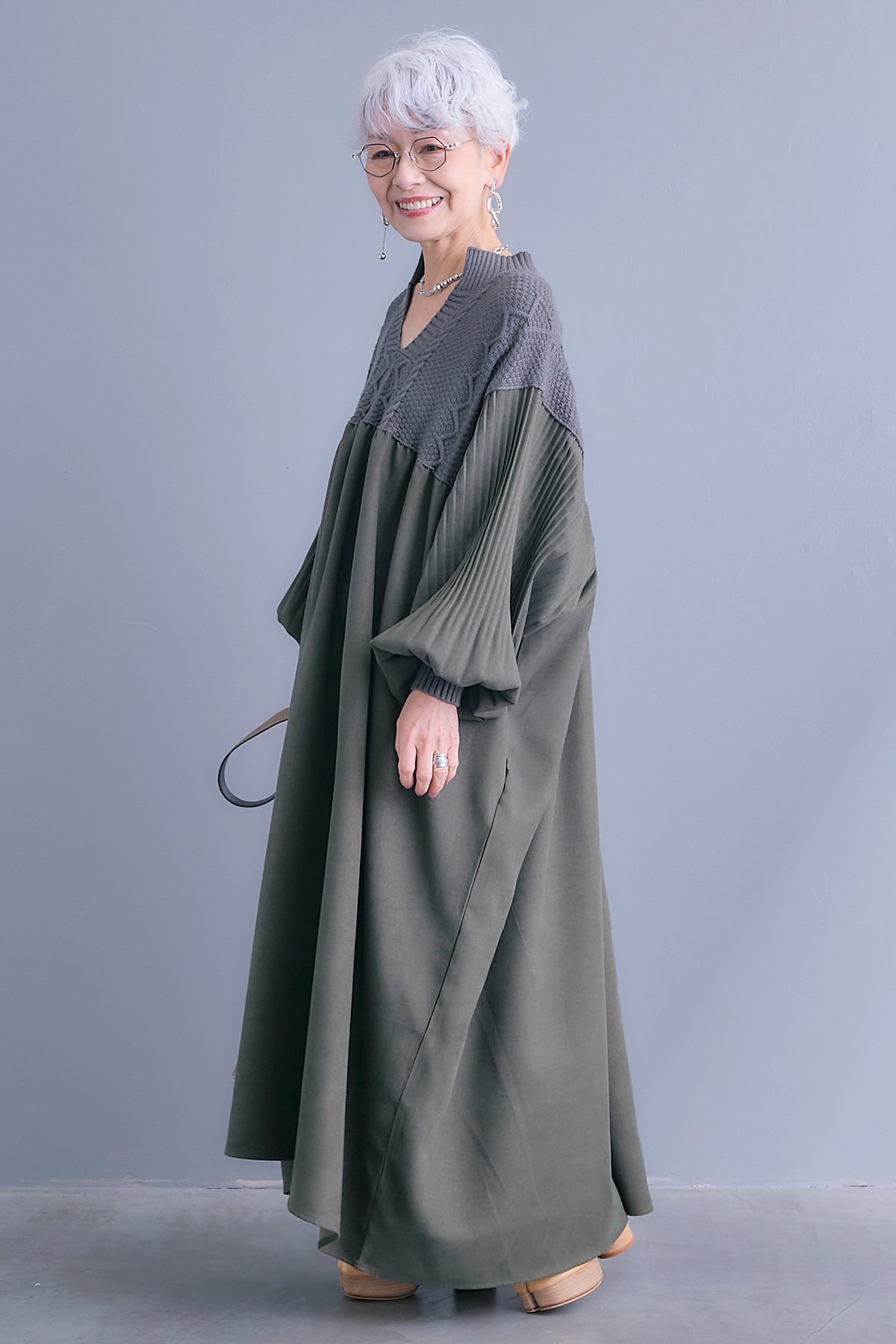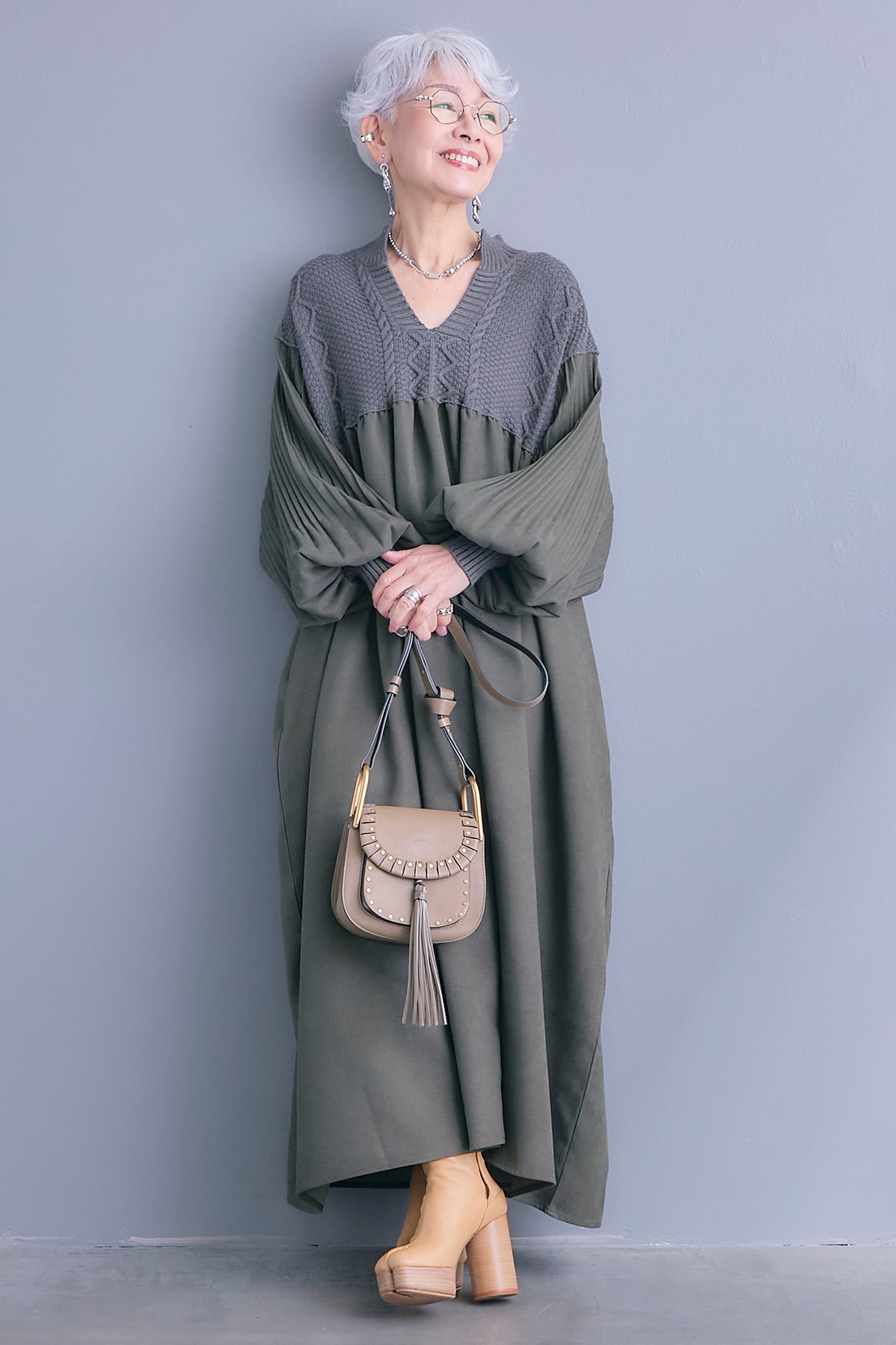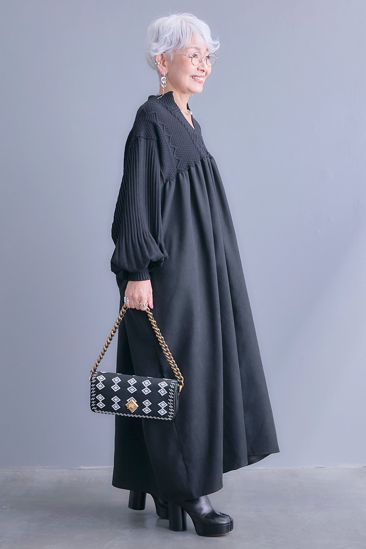 ニットとコーデュロイを切り替えた、異素材コンビが印象的なキーネックワンピース。上身頃は編み柄を効かせたニット素材で、程よい立体感と表情をプラス。スカート部分は落ち感のあるコーデュロイ素材を採用し、ゆったりとした分量感が自然なドレープを描きます。キーネックデザインが首元をすっきり見せ、1枚で着映えするバランスに仕上げたアイテムです。