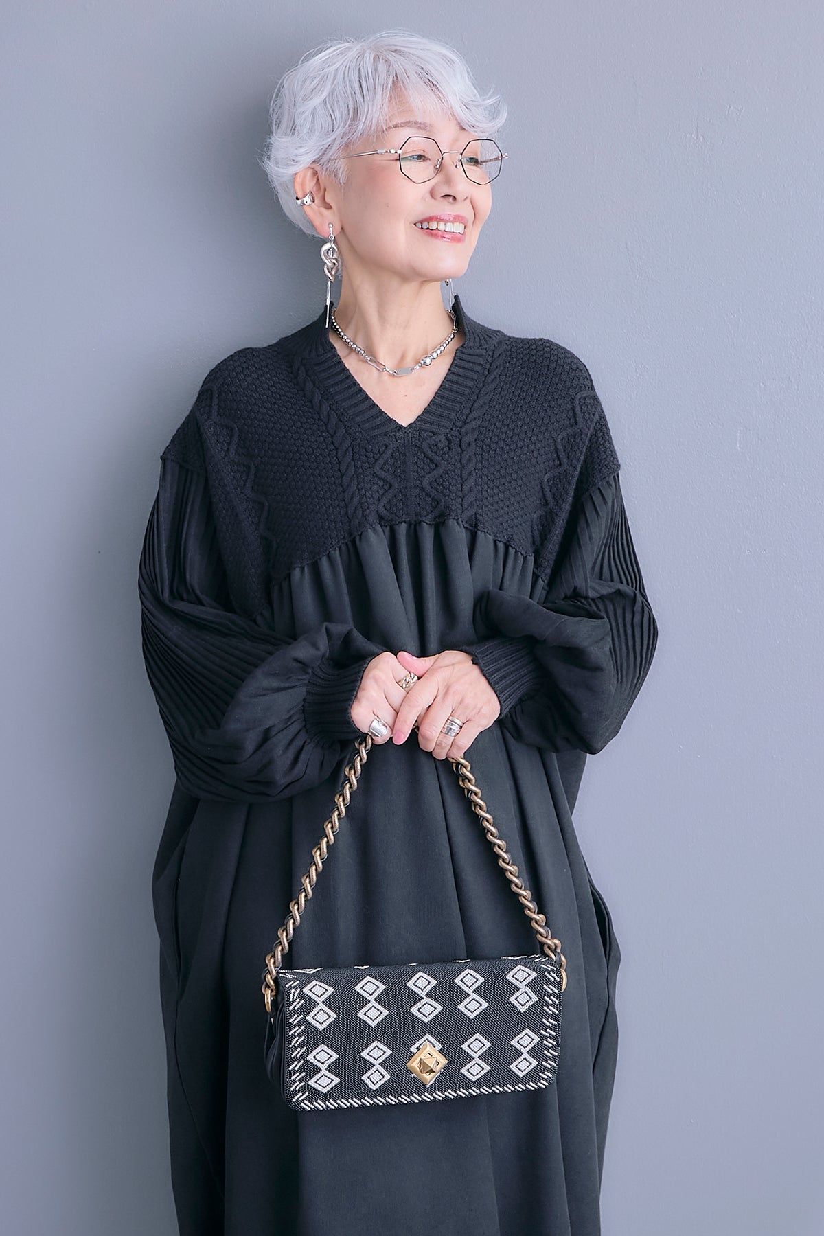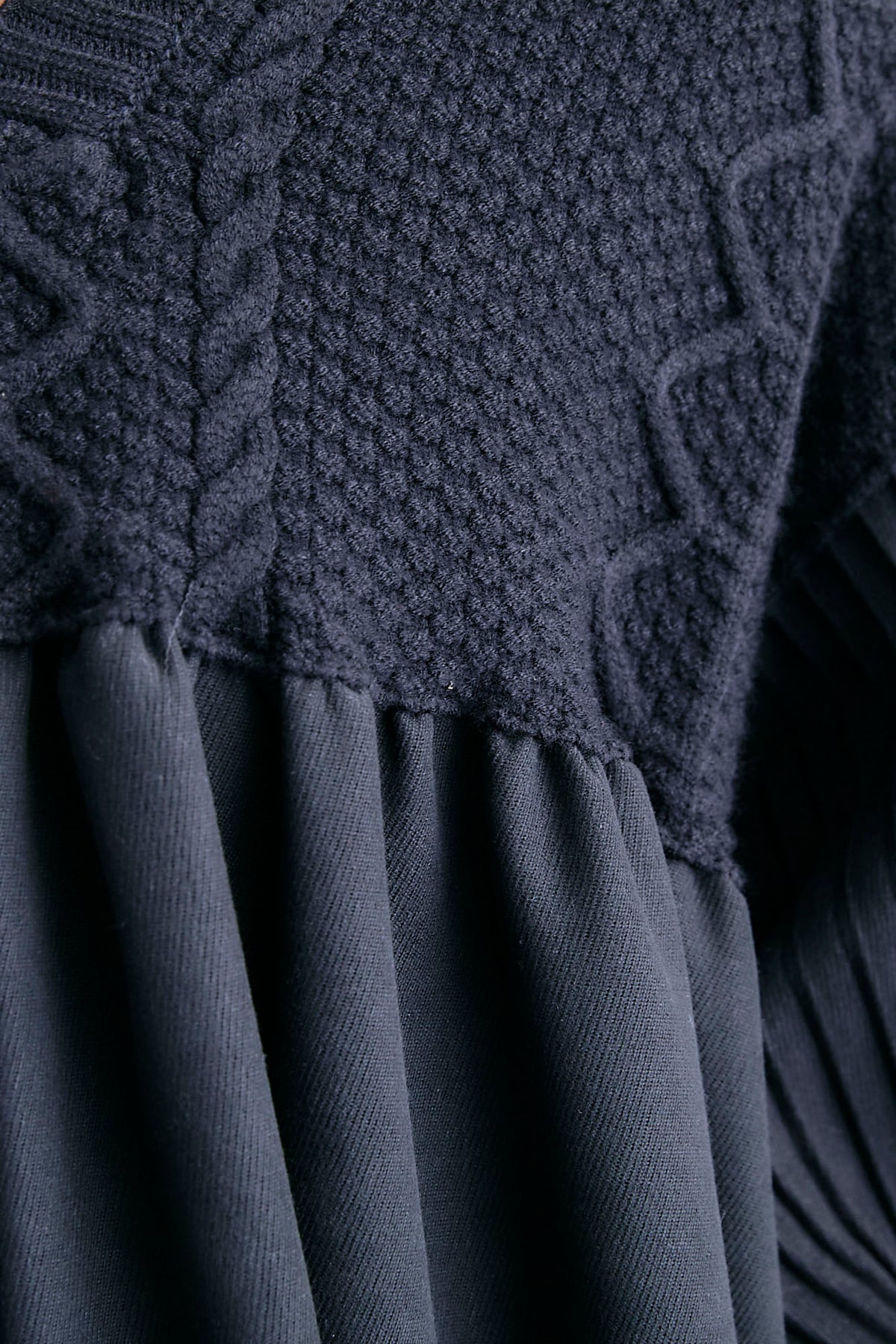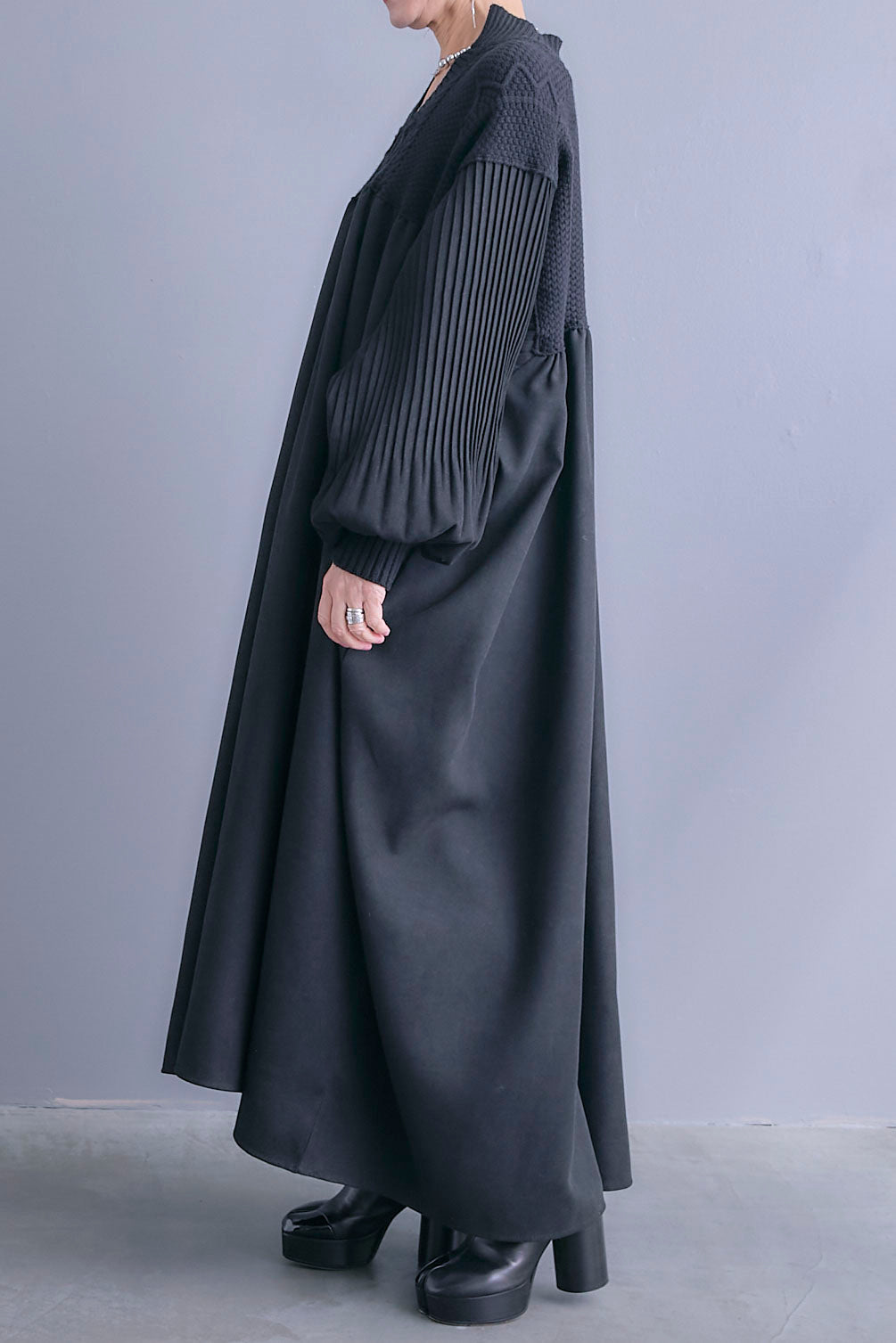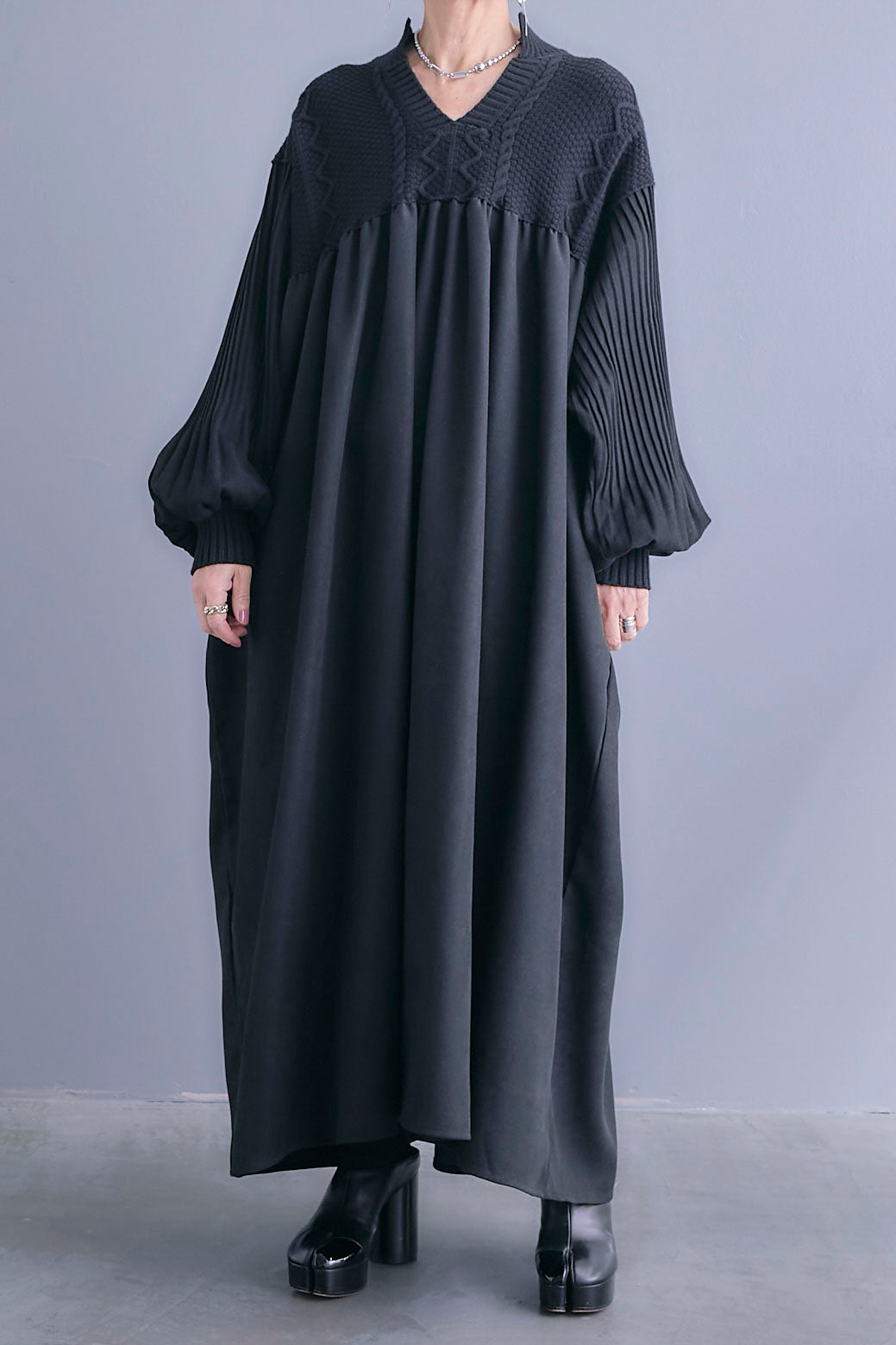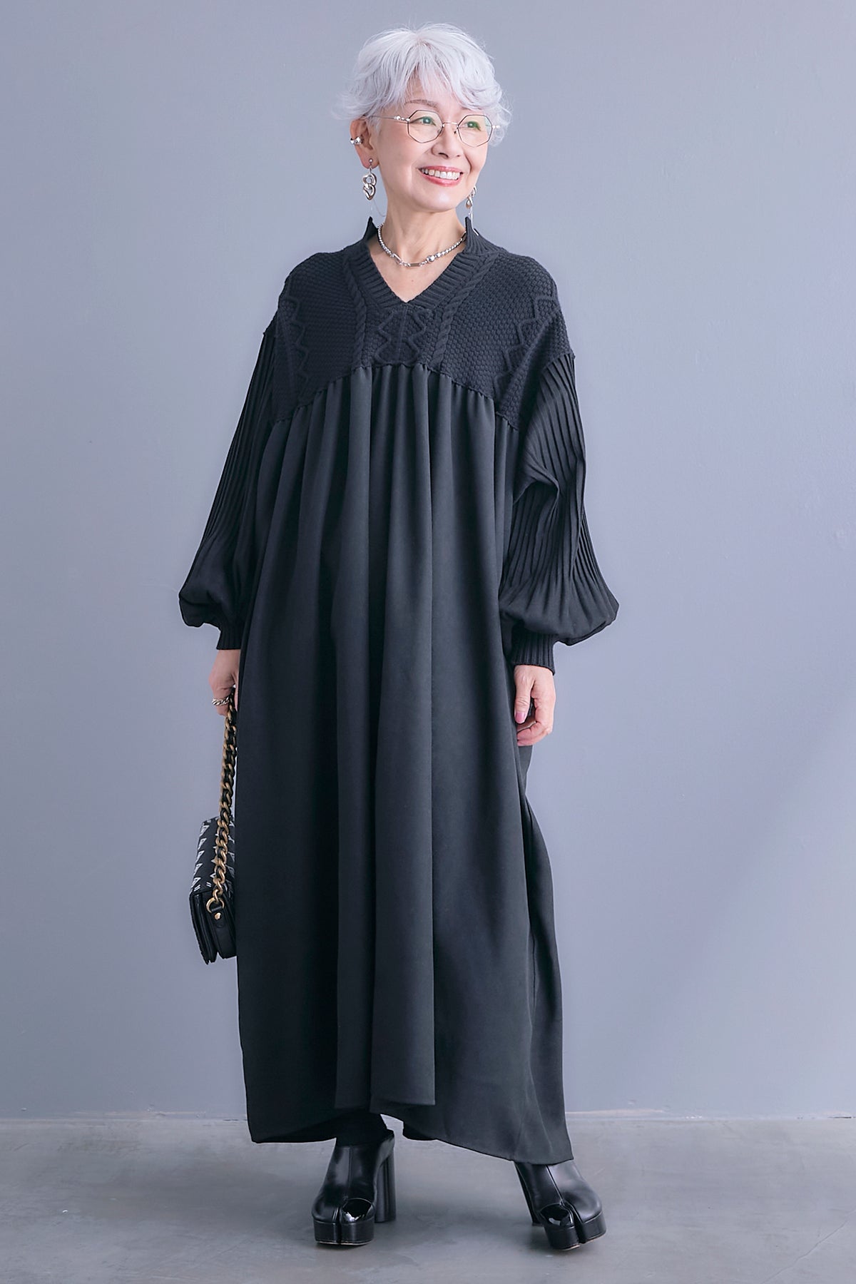 ニットとコーデュロイを切り替えた、異素材コンビが印象的なキーネックワンピース。上身頃は編み柄を効かせたニット素材で、程よい立体感と表情をプラス。スカート部分は落ち感のあるコーデュロイ素材を採用し、ゆったりとした分量感が自然なドレープを描きます。キーネックデザインが首元をすっきり見せ、1枚で着映えするバランスに仕上げたアイテムです。