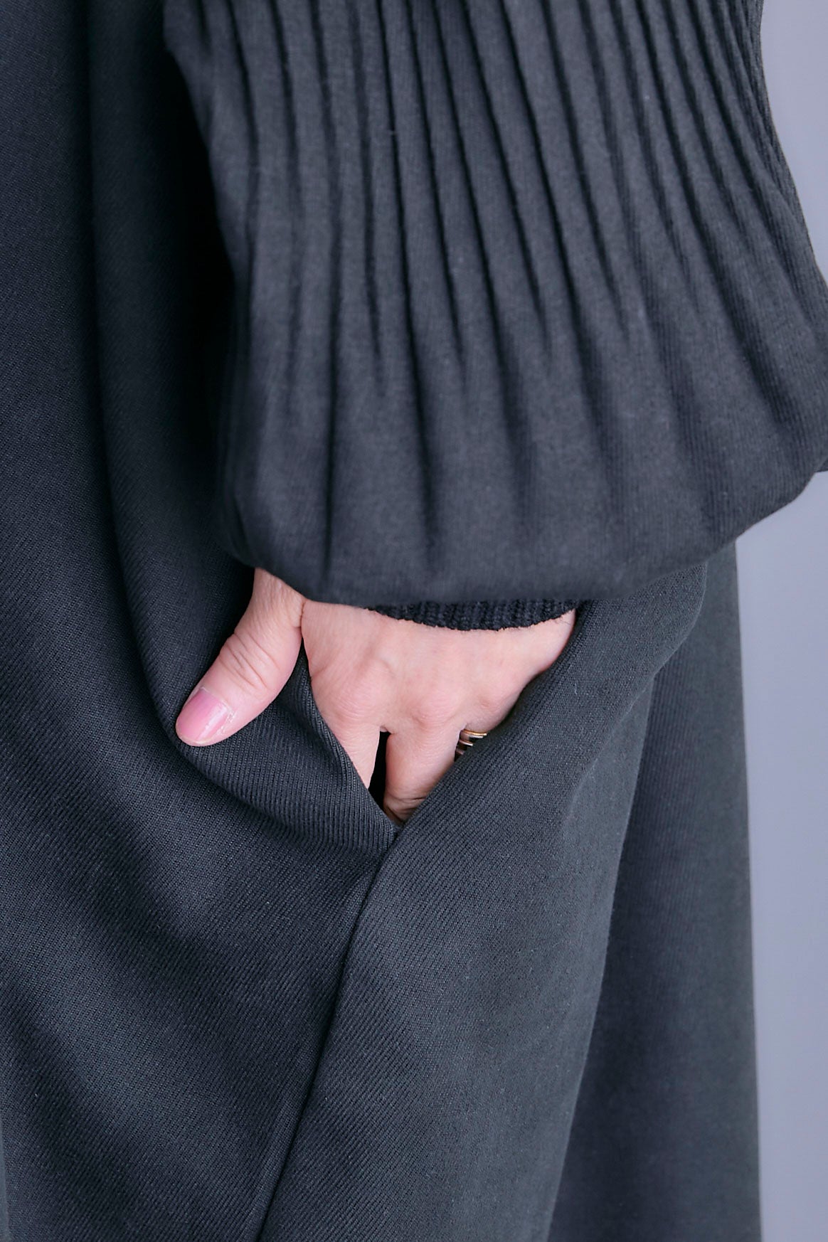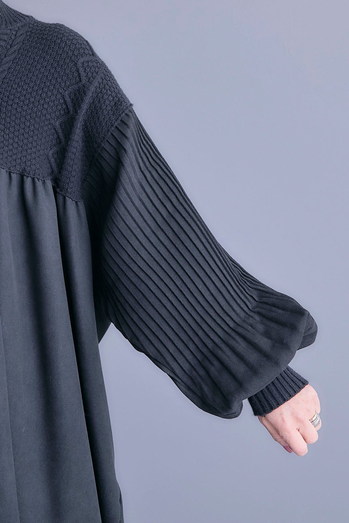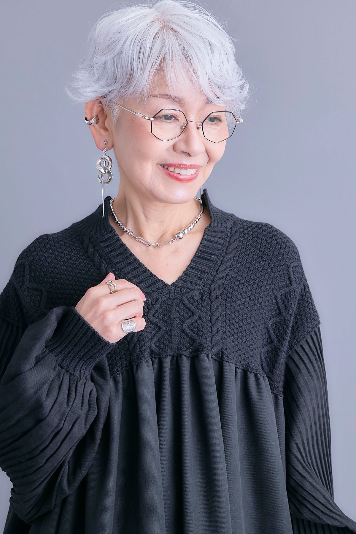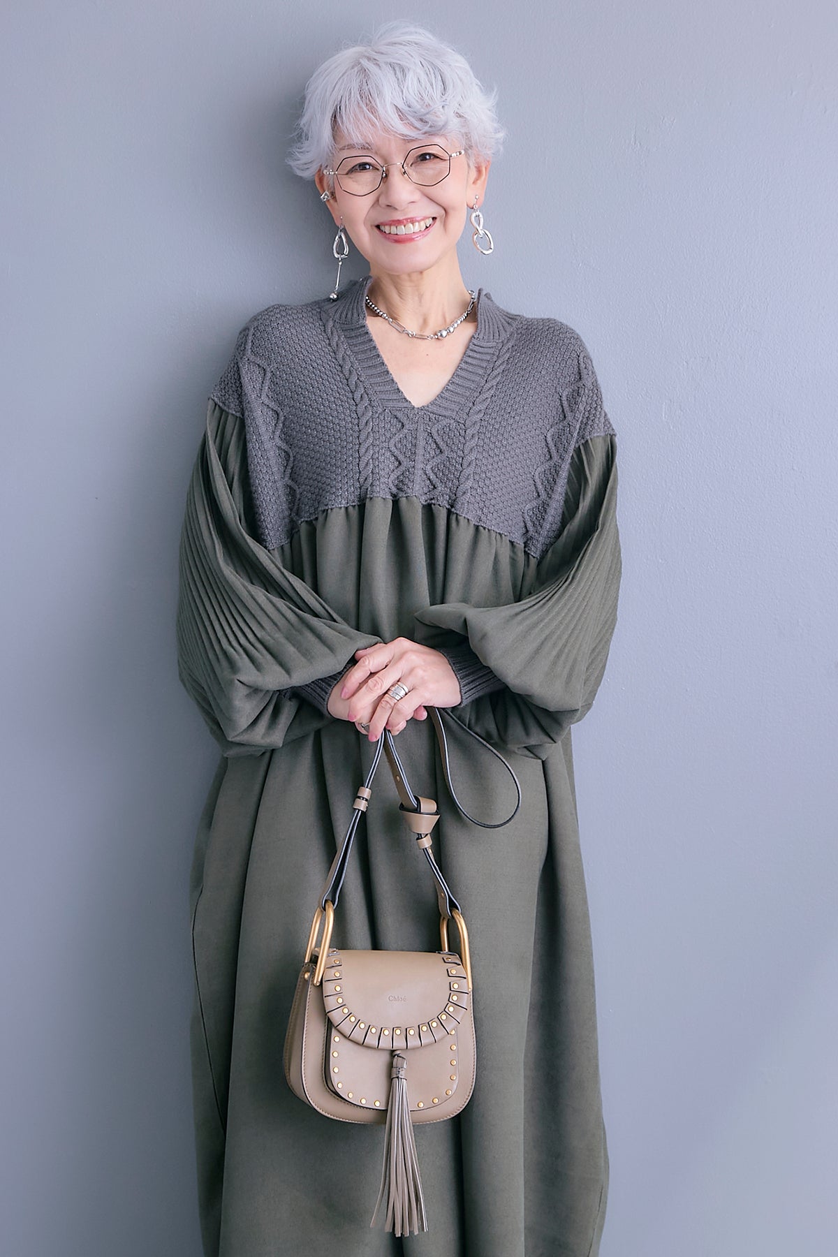 ニットとコーデュロイを切り替えた、異素材コンビが印象的なキーネックワンピース。上身頃は編み柄を効かせたニット素材で、程よい立体感と表情をプラス。スカート部分は落ち感のあるコーデュロイ素材を採用し、ゆったりとした分量感が自然なドレープを描きます。キーネックデザインが首元をすっきり見せ、1枚で着映えするバランスに仕上げたアイテムです。