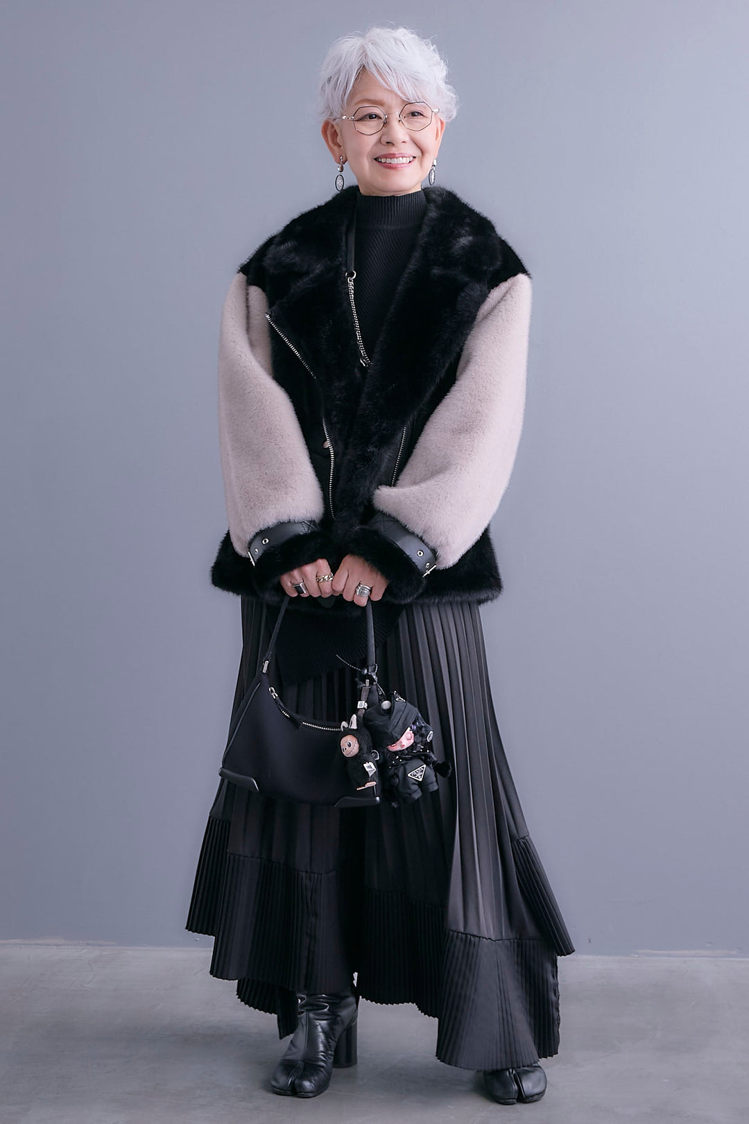 【SET】アシンメトリーオーバーニット+ライダースドッキングエコファージャケット+アシンメトリープリーツスカート(3set)