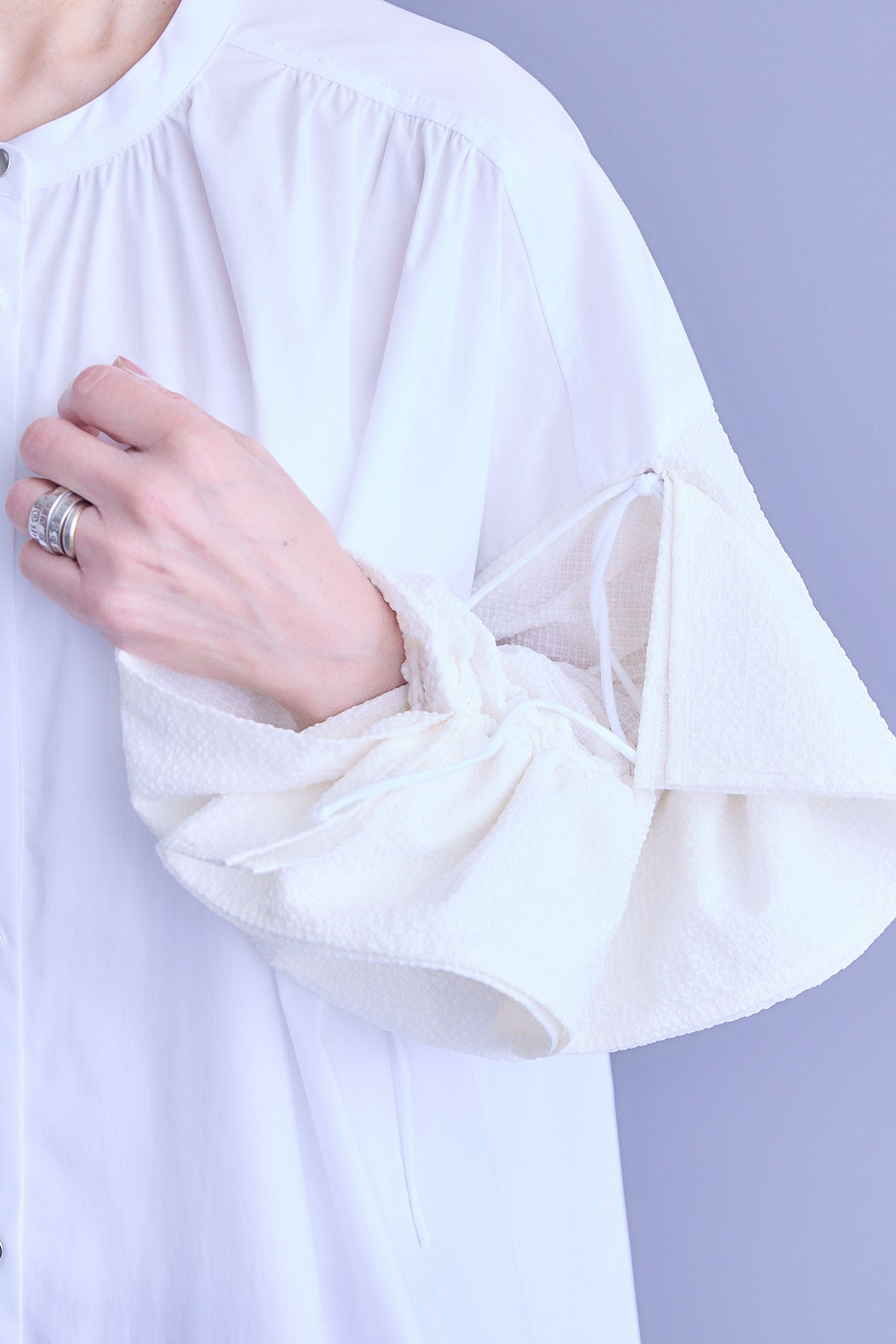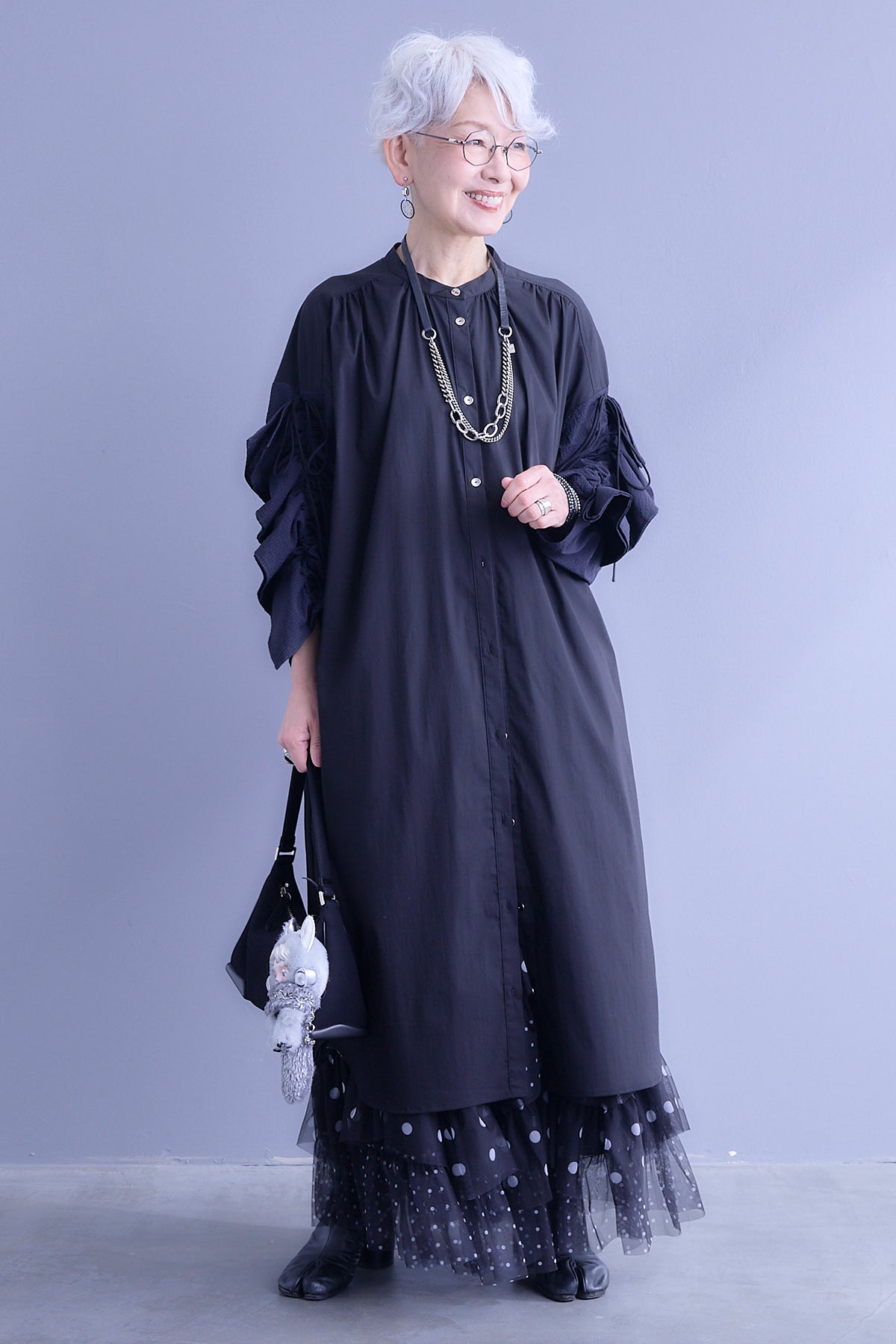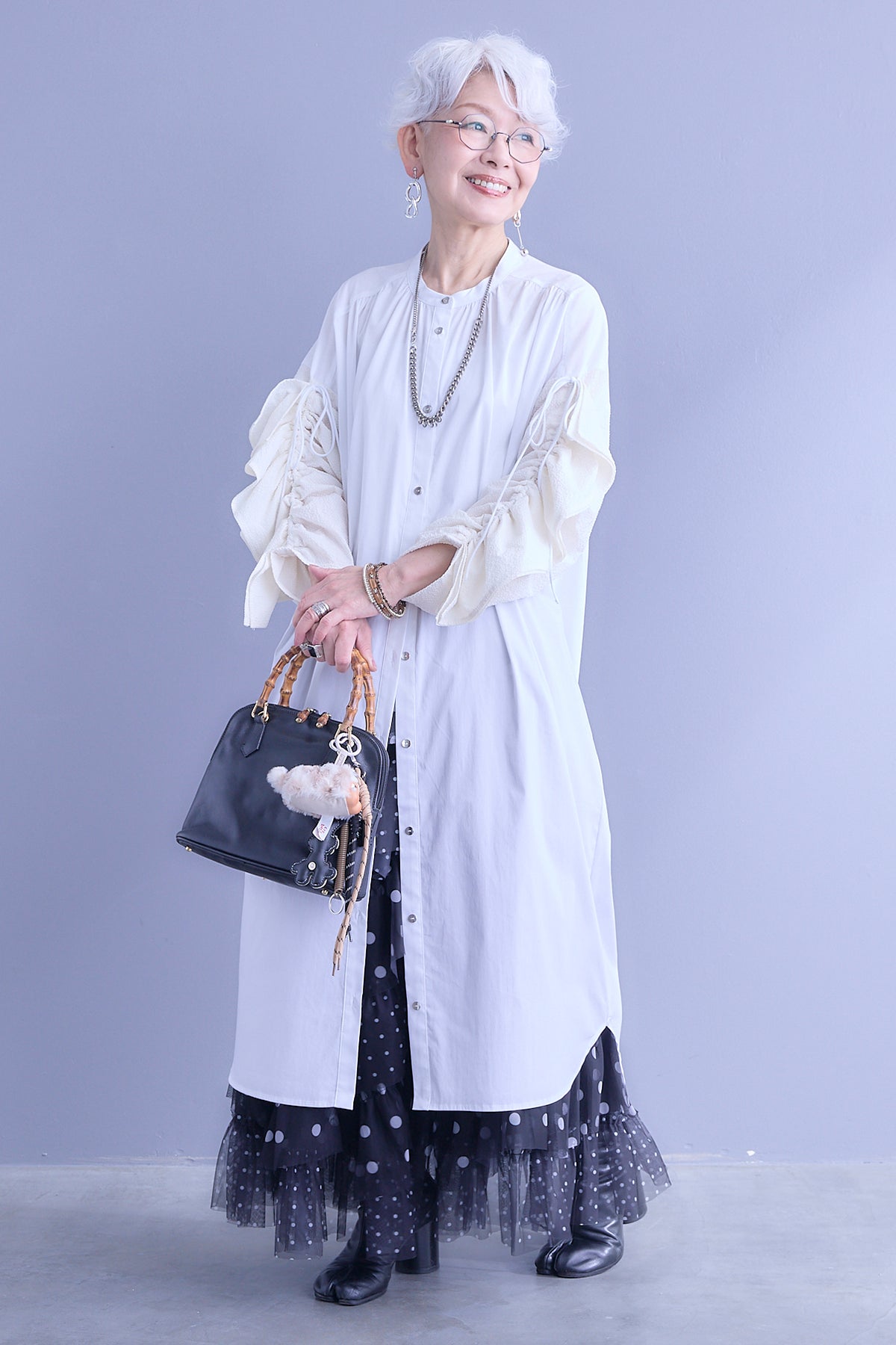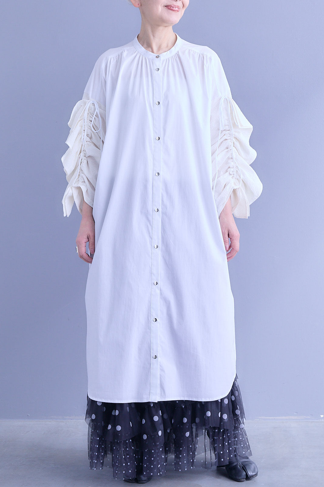 立体感のあるドローストリングスリーブが印象的なシャツワンピース。袖のシルエットを調整することで表情に変化が生まれ、シンプルながら存在感のある一枚に仕上がります。ゆとりのあるフォルムで体のラインを拾いにくく、前開き仕様で羽織りとしても活躍。パンツやスカートとのレイヤードも楽しめ、幅広いスタイリングに取り入れやすいアイテムです。