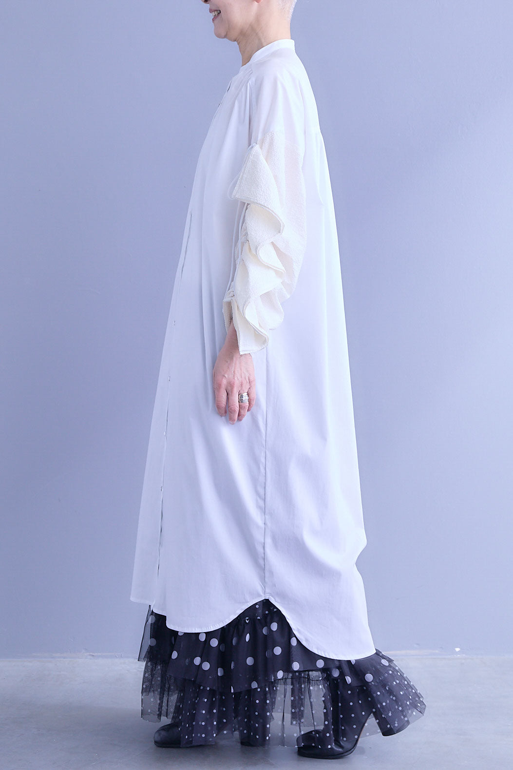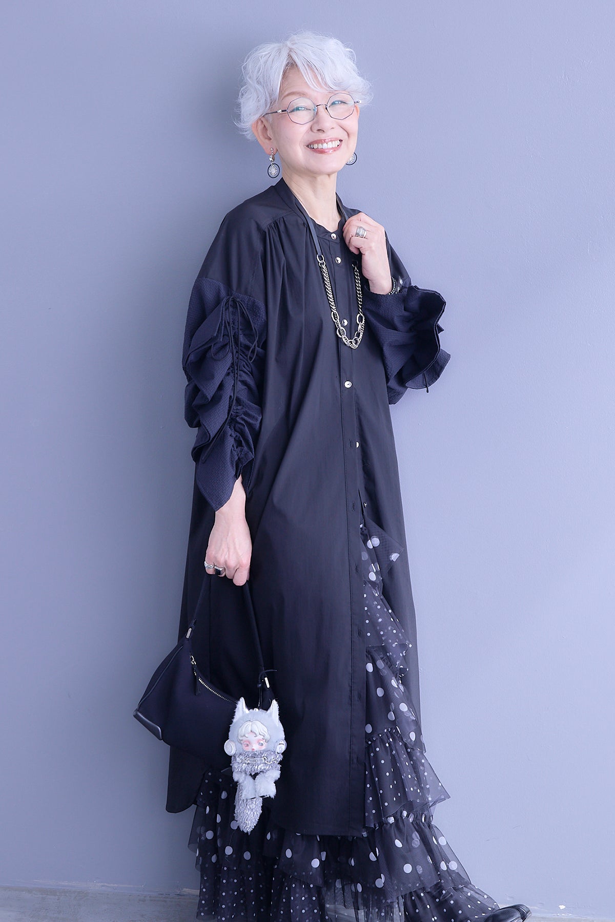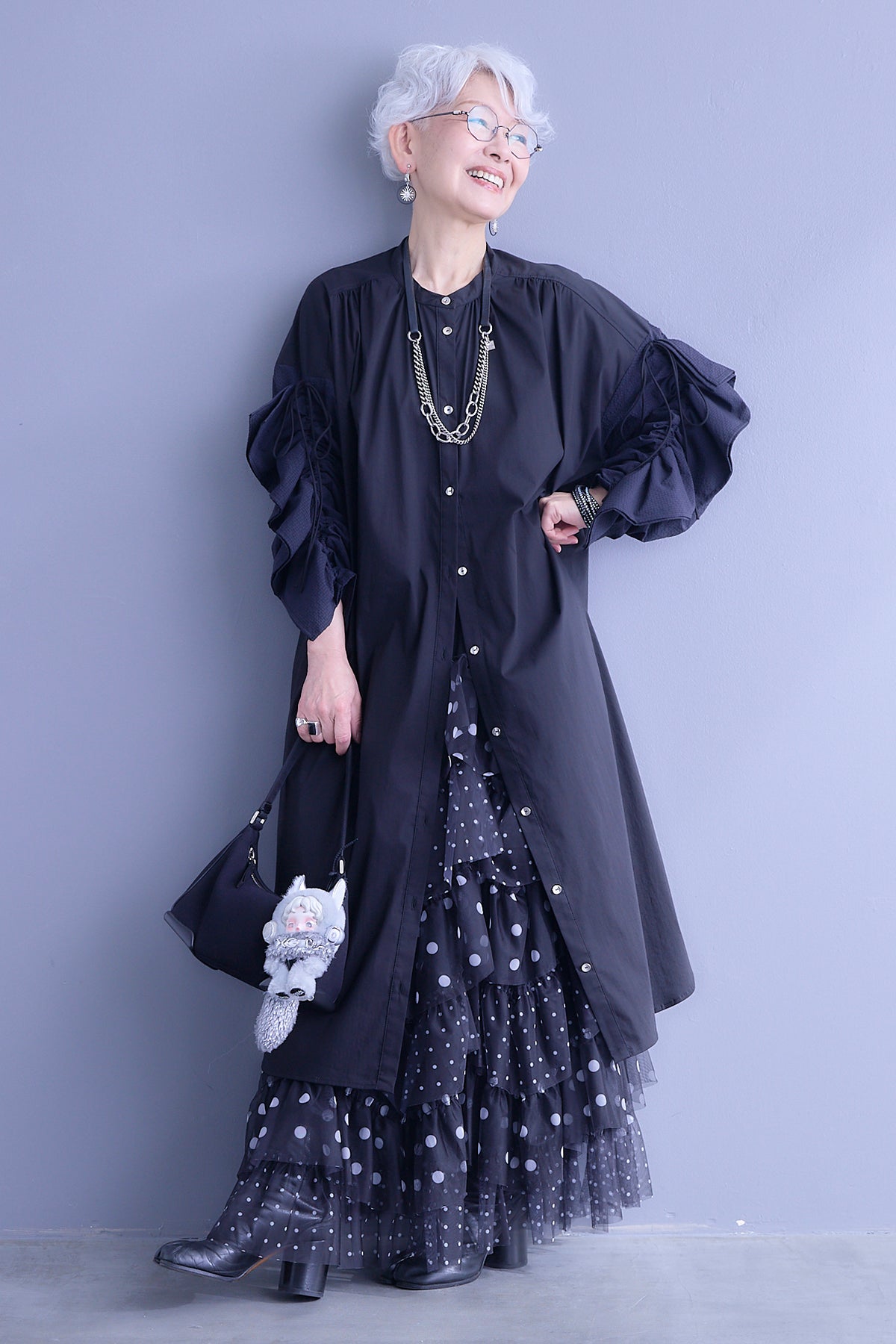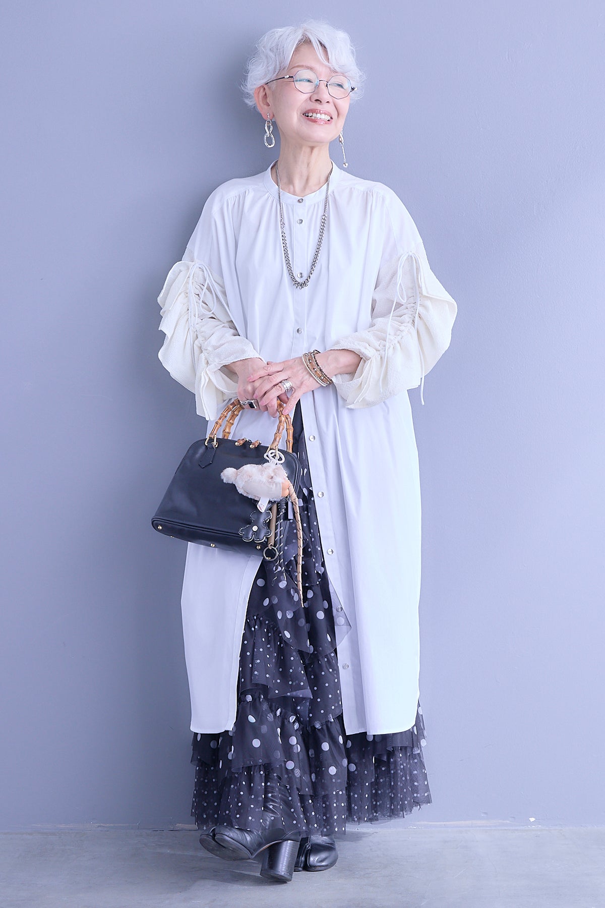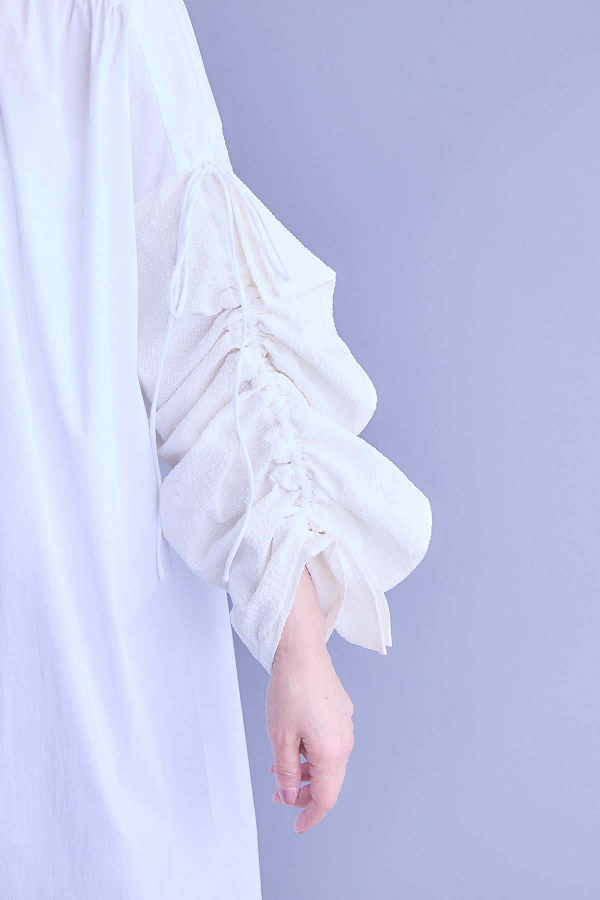 立体感のあるドローストリングスリーブが印象的なシャツワンピース。袖のシルエットを調整することで表情に変化が生まれ、シンプルながら存在感のある一枚に仕上がります。ゆとりのあるフォルムで体のラインを拾いにくく、前開き仕様で羽織りとしても活躍。パンツやスカートとのレイヤードも楽しめ、幅広いスタイリングに取り入れやすいアイテムです。