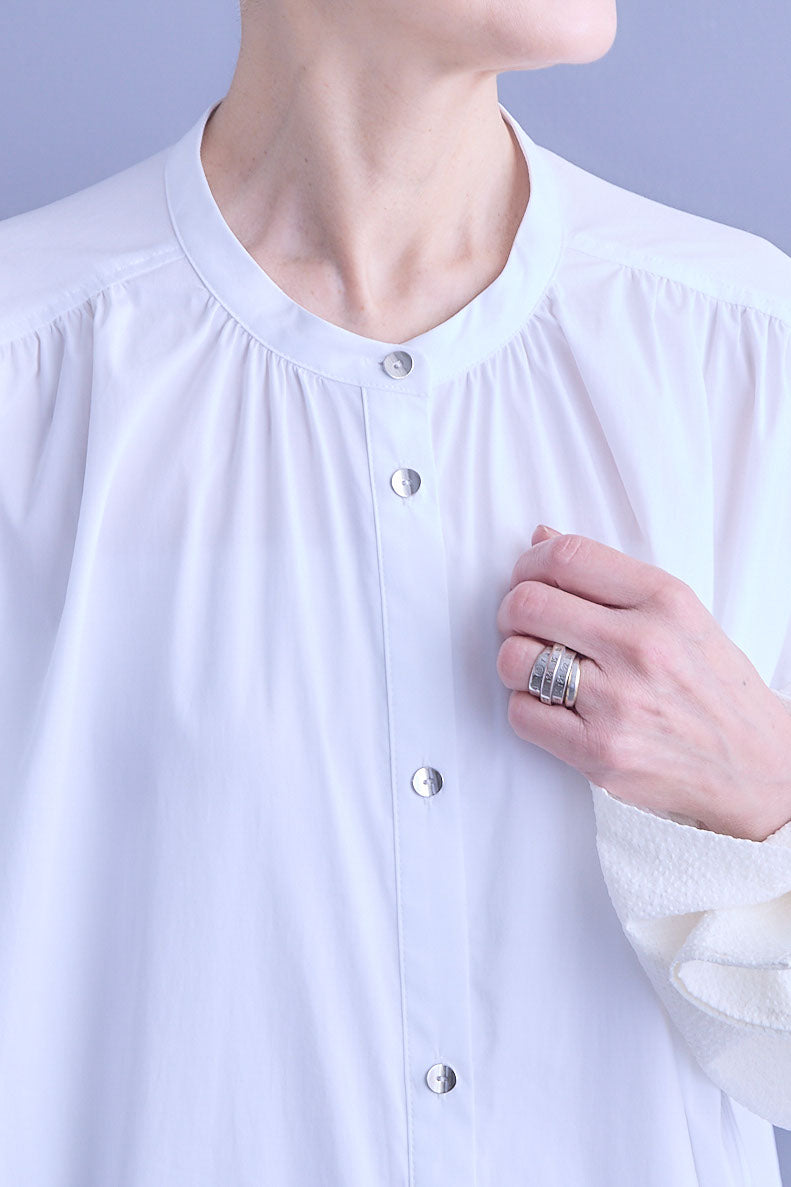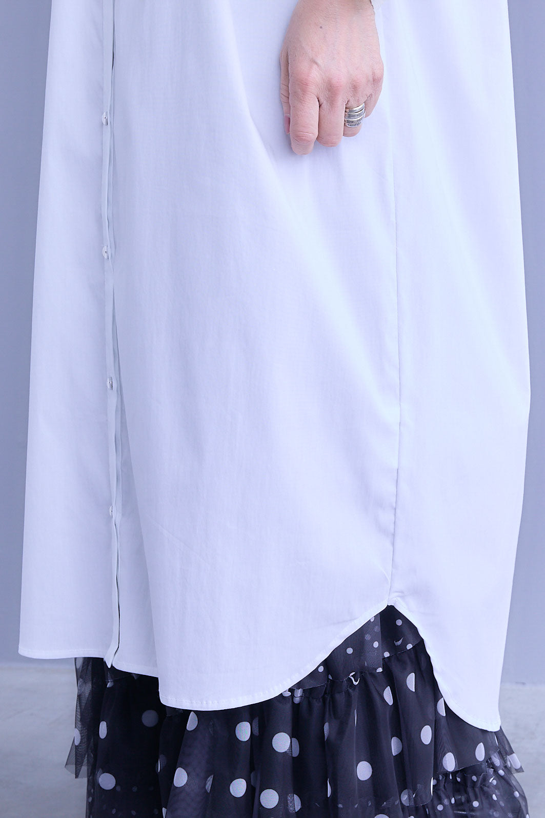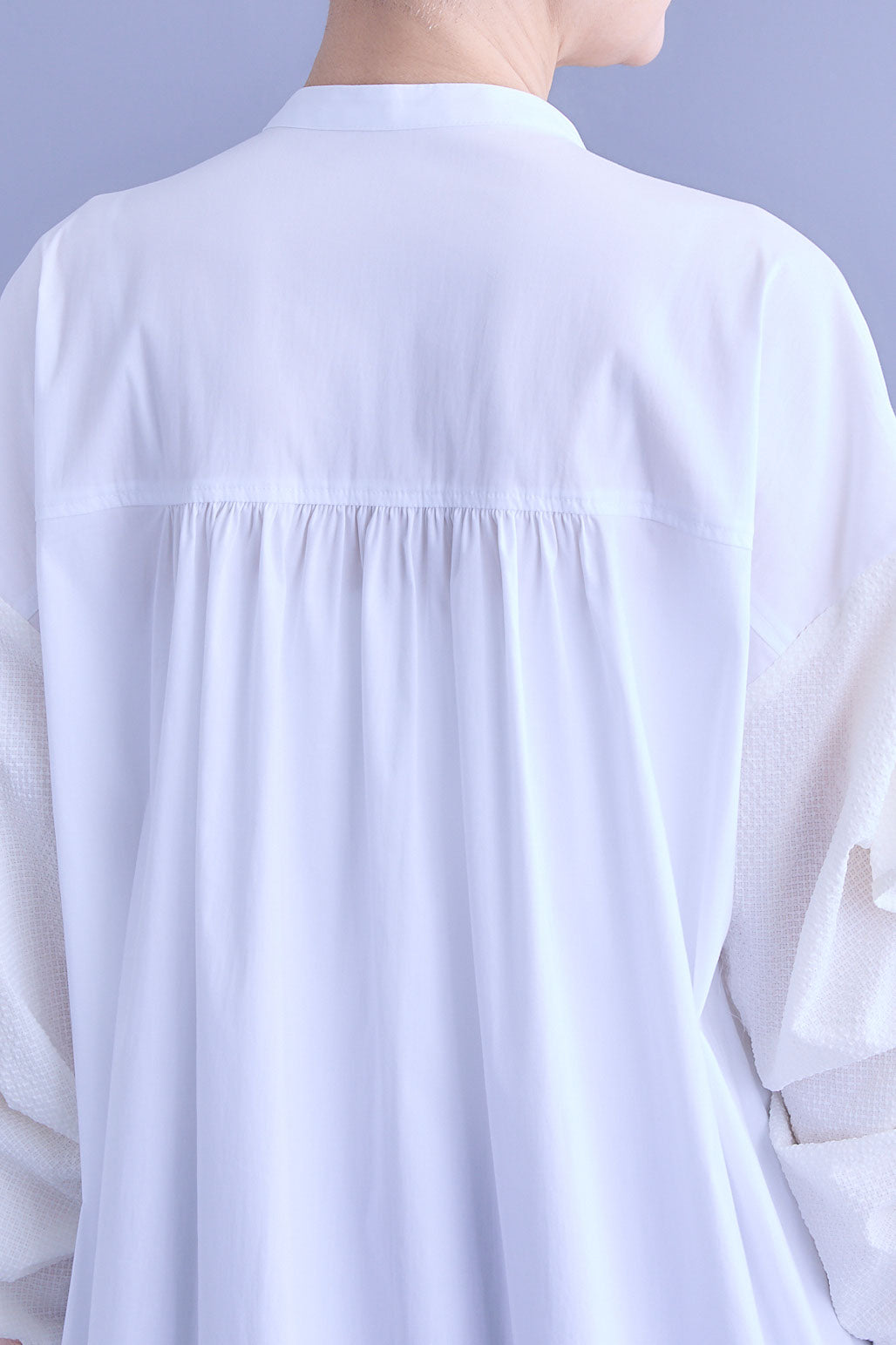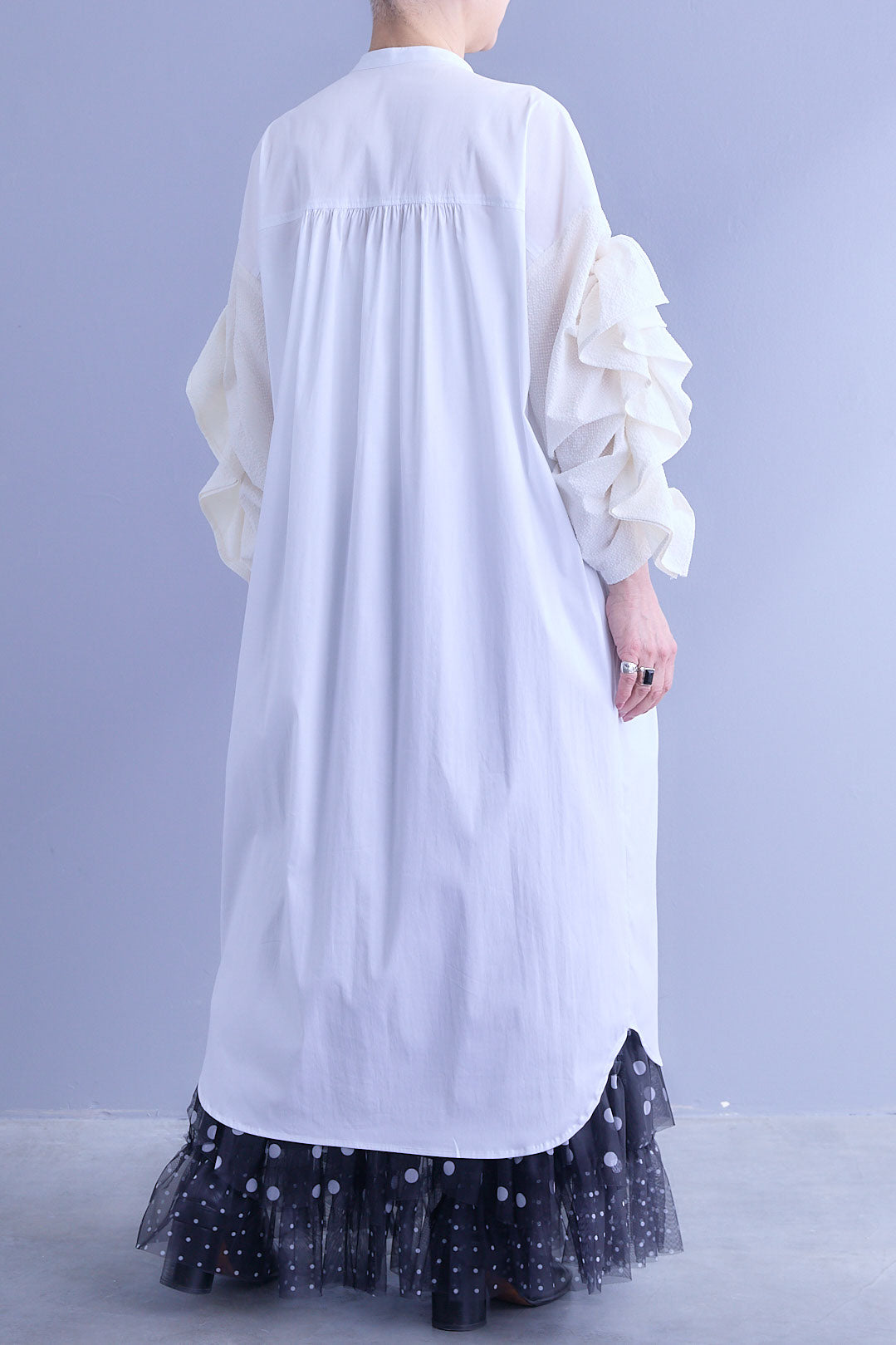 立体感のあるドローストリングスリーブが印象的なシャツワンピース。袖のシルエットを調整することで表情に変化が生まれ、シンプルながら存在感のある一枚に仕上がります。ゆとりのあるフォルムで体のラインを拾いにくく、前開き仕様で羽織りとしても活躍。パンツやスカートとのレイヤードも楽しめ、幅広いスタイリングに取り入れやすいアイテムです。