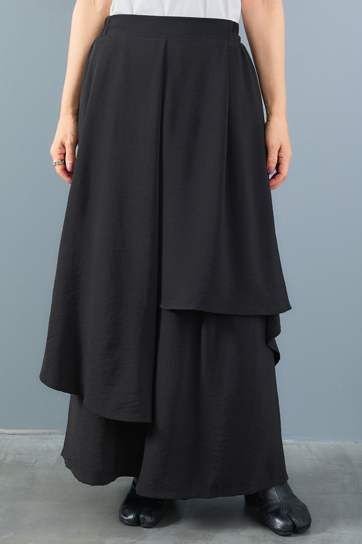立体感のあるレイヤードデザインが印象的なアシンメトリーなワイドパンツ。さまざまな長さの生地が重なり合い、動くたびに美しいドレープを描き、モードな雰囲気を演出します。ゆったりとしたシルエットでリラックス感がありながらも、ウエストはすっきりと見えるデザイン。シンプルなトップスと合わせるだけで、洗練されたスタイリングが完成する一着です。
