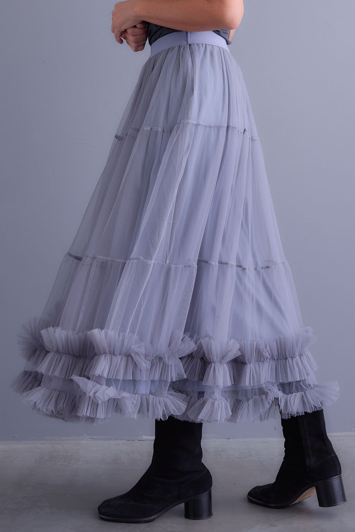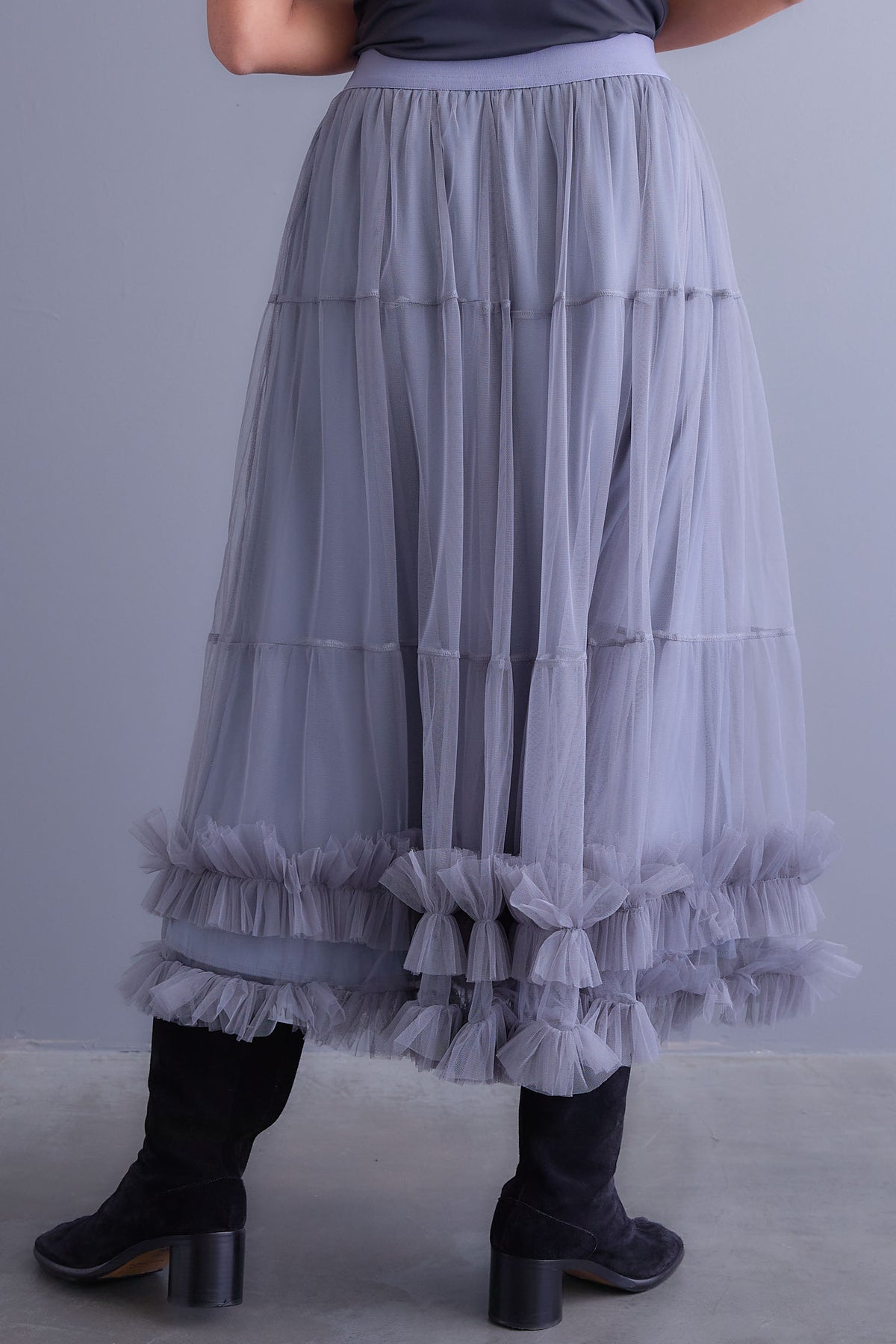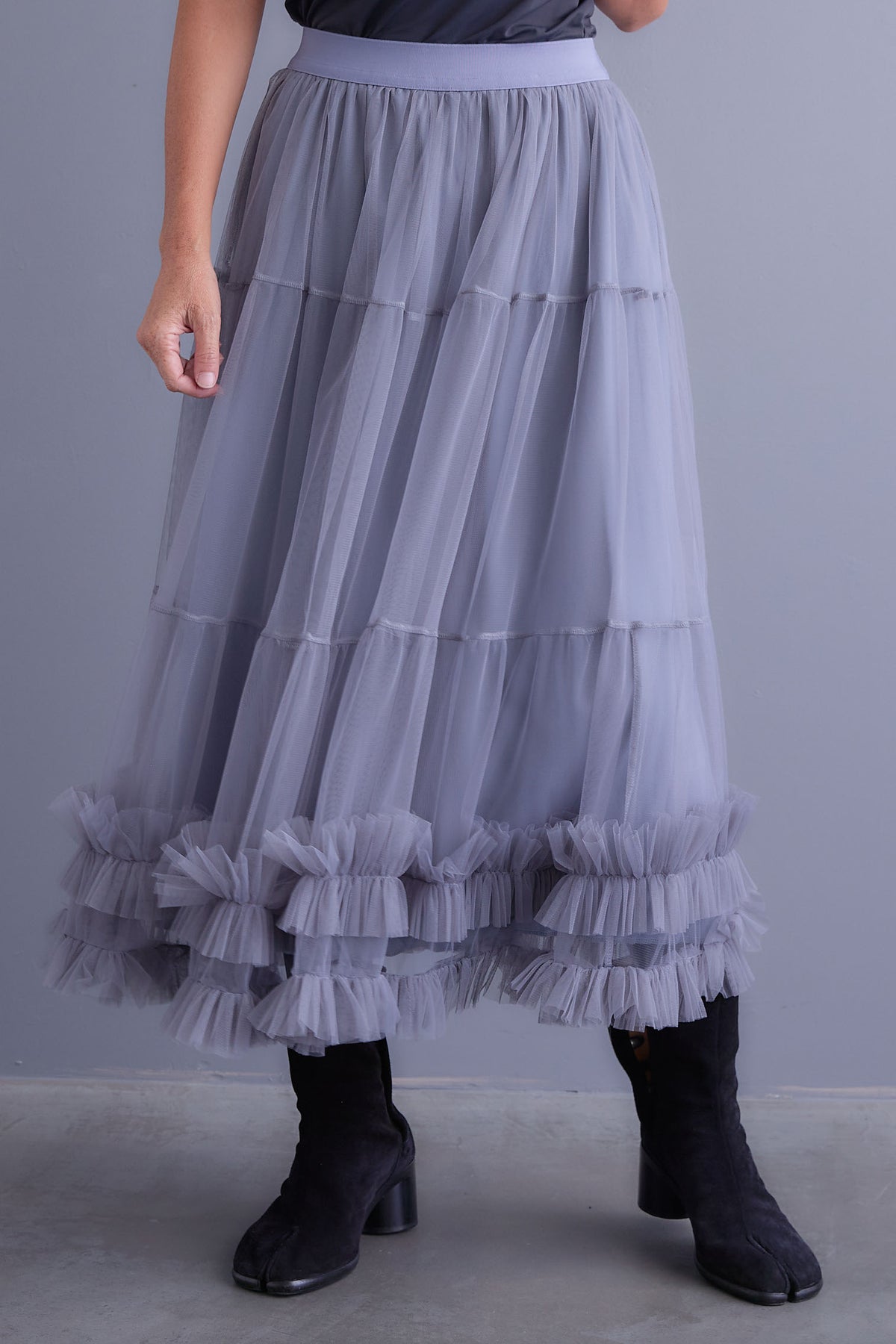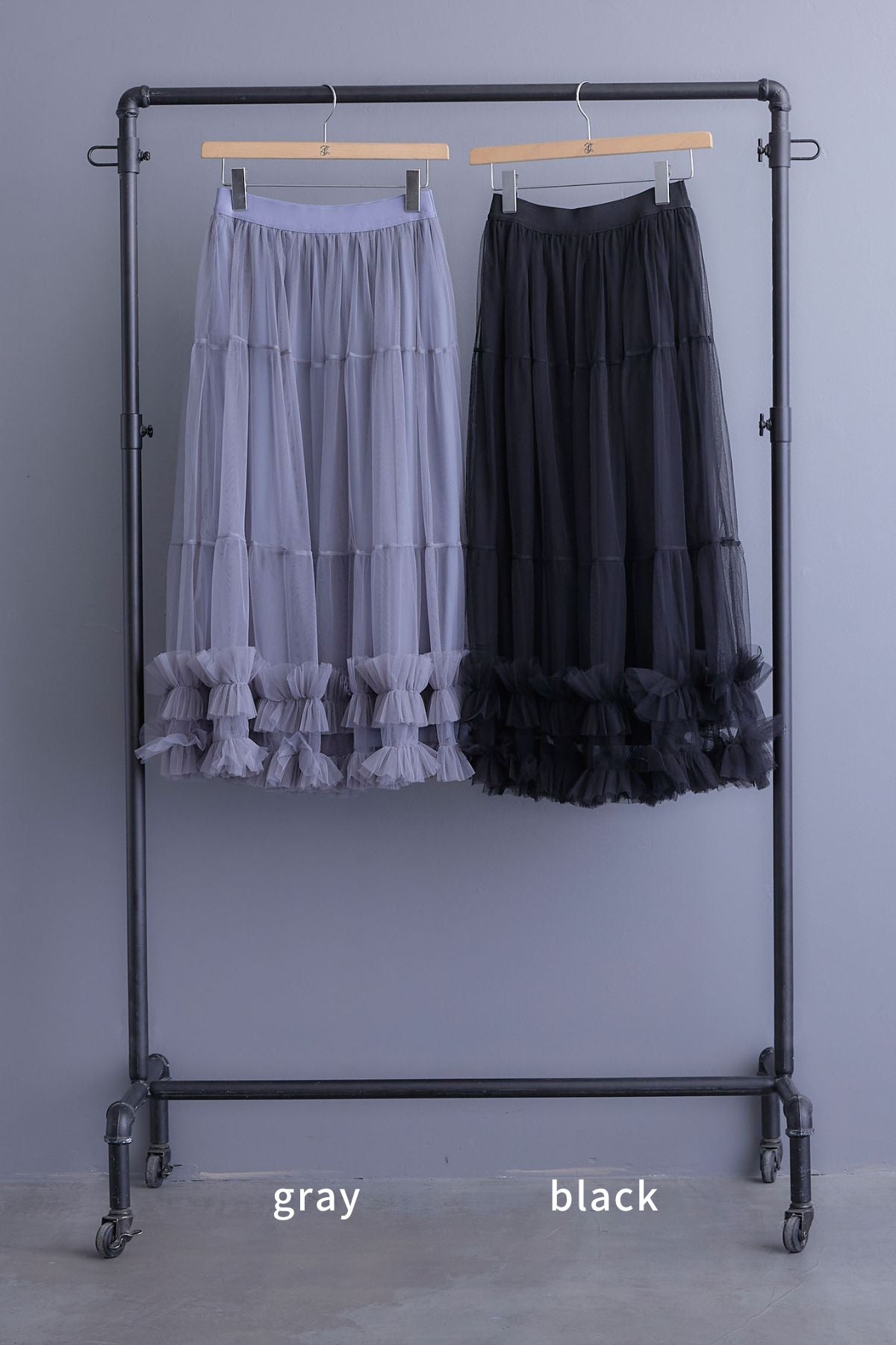 華やかなフリルとチュールが特徴的なティアードスカートです。軽やかなチュール素材が動きに合わせて揺れ、女性らしいエレガントな印象を演出します。ティアードデザインによりボリューム感があり、コーディネートの主役になる一枚です。ウエストはゴム仕様で着心地も快適。シンプルなトップスと合わせるだけで、特別感のあるスタイリングが完成します。パーティーシーンやお出かけにもぴったりなアイテムです。