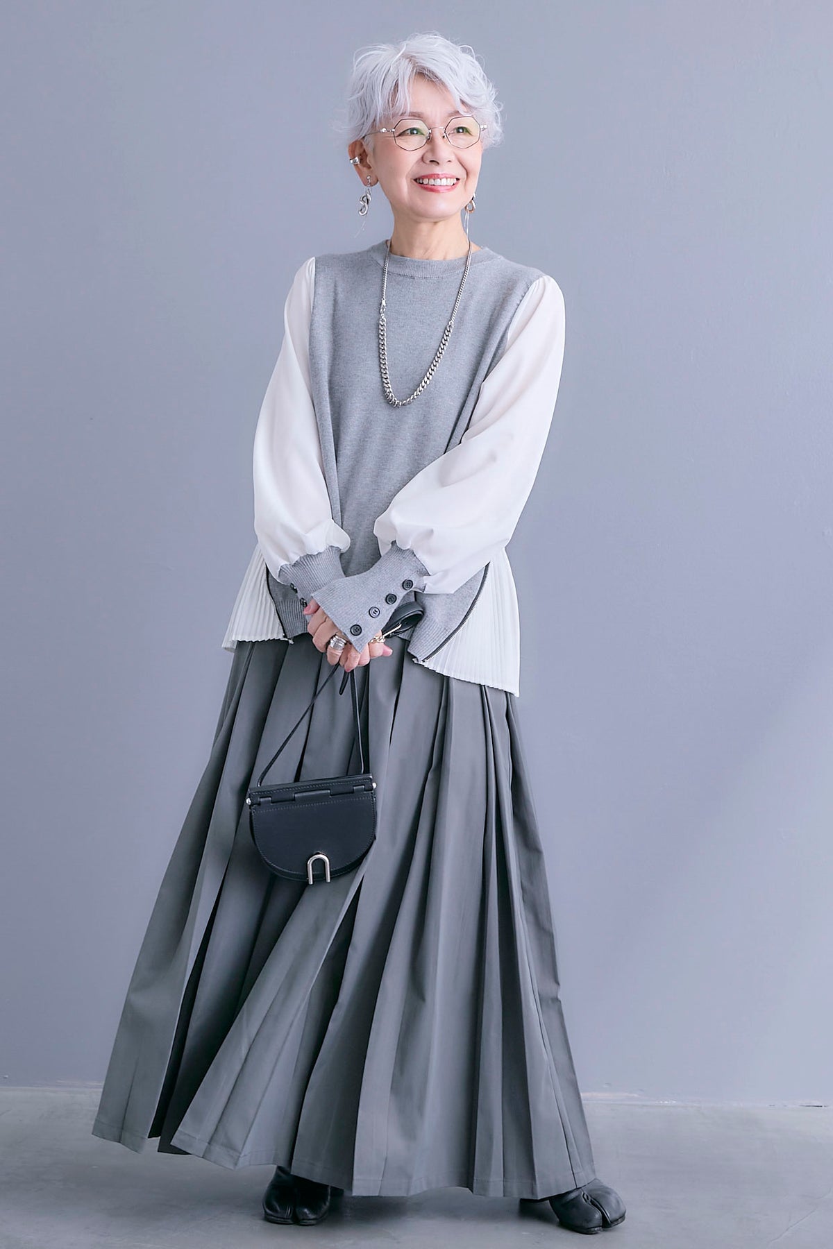 程よいハリ感のあるシャークスキン素材で仕立てたプリーツスカート。深めのタックが生み出す立体的なシルエットが上品で、動くたびに揺れる表情が魅力です。ウエストはゴム仕様で穿き心地も快適。シーズン問わず使える落ち着いたデザインで、幅広いスタイルにマッチします。
