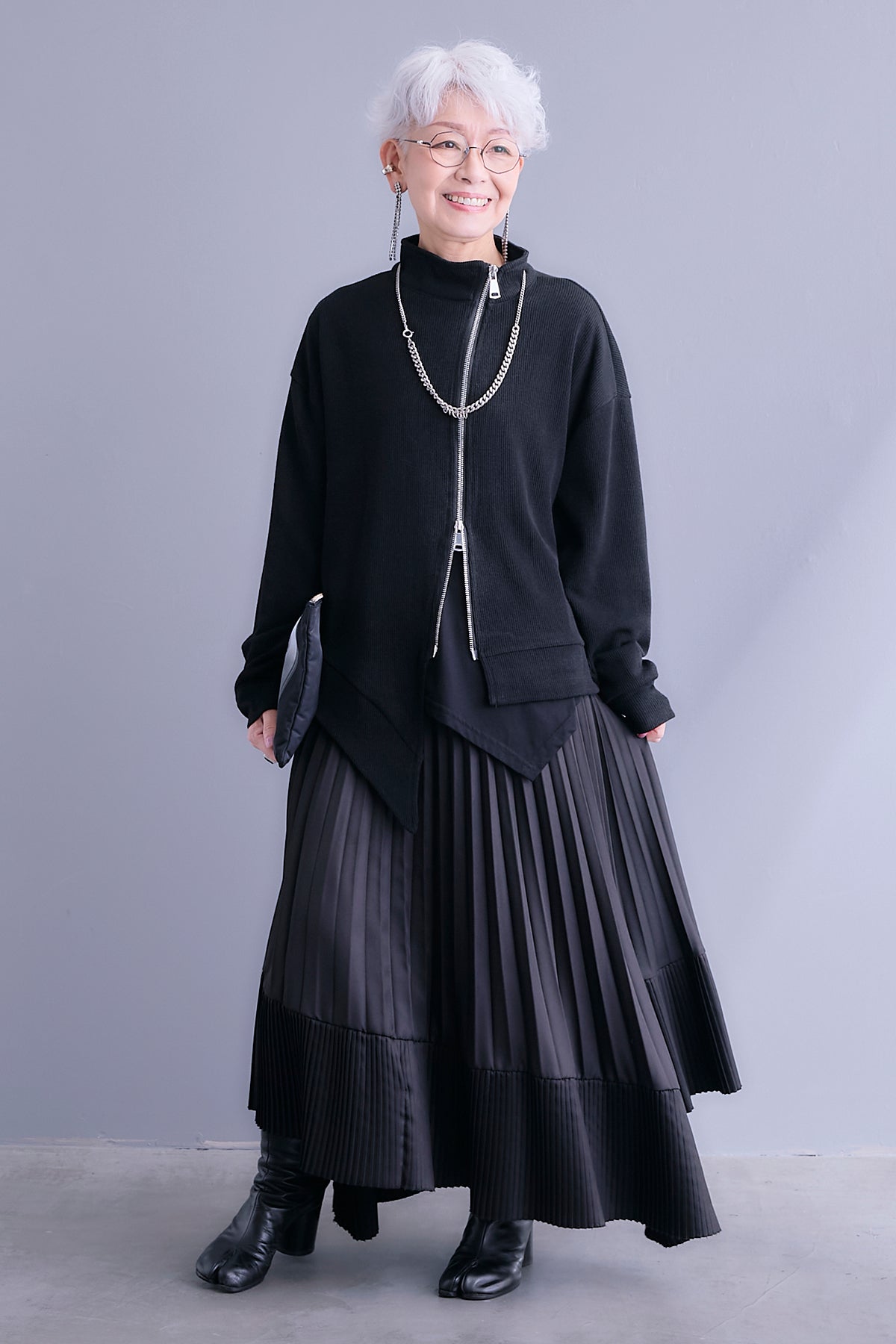 アシンメトリーなシルエットとWジップ仕様が目を引くハイネックカーディガン。ジップの開閉バランスで表情が変わり、スタイリングに自然な動きをプラスします。程よく厚みのある素材感で、羽織りとしても一枚着としても活躍。ゆとりのあるサイズ感ながら、シャープなラインで全体をすっきりとまとめてくれる一着です。