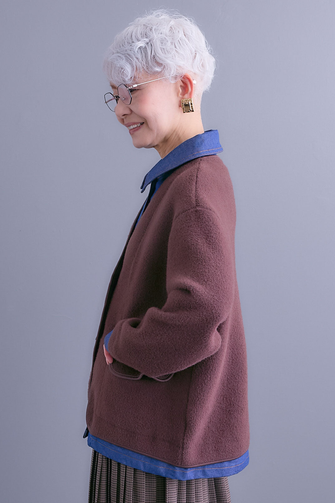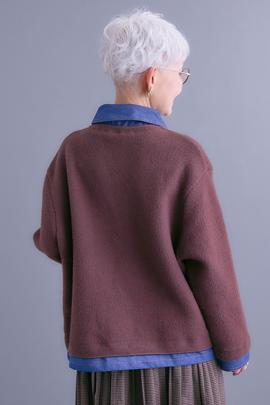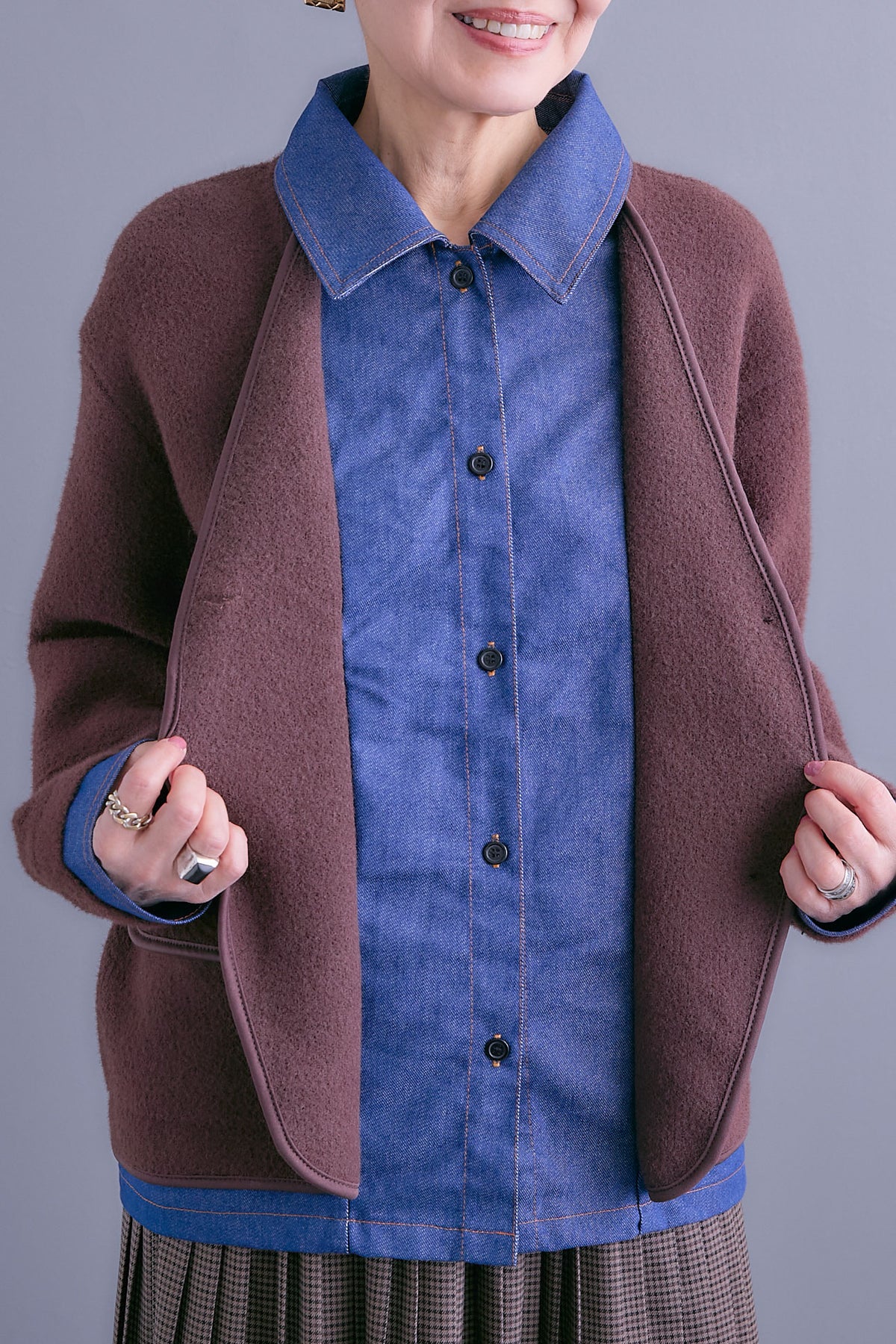 上品なブラウンとインディゴの異素材ミックスが魅力のカーディガン。やわらかな風合いのウール混ニットに、インナー風のデニム素材を大胆にドッキング。1枚でレイヤードスタイルが完成する、主役級の一着。袖口や裾からデニムの存在感がさりげなくのぞく、こなれた雰囲気のあるデザイン。デニム部分は取り外し不可。ジャケット感覚で羽織っても、ボタンを閉めてプルオーバー風にも着用可能。ヒップが隠れる丈感で、体型カバーにも。