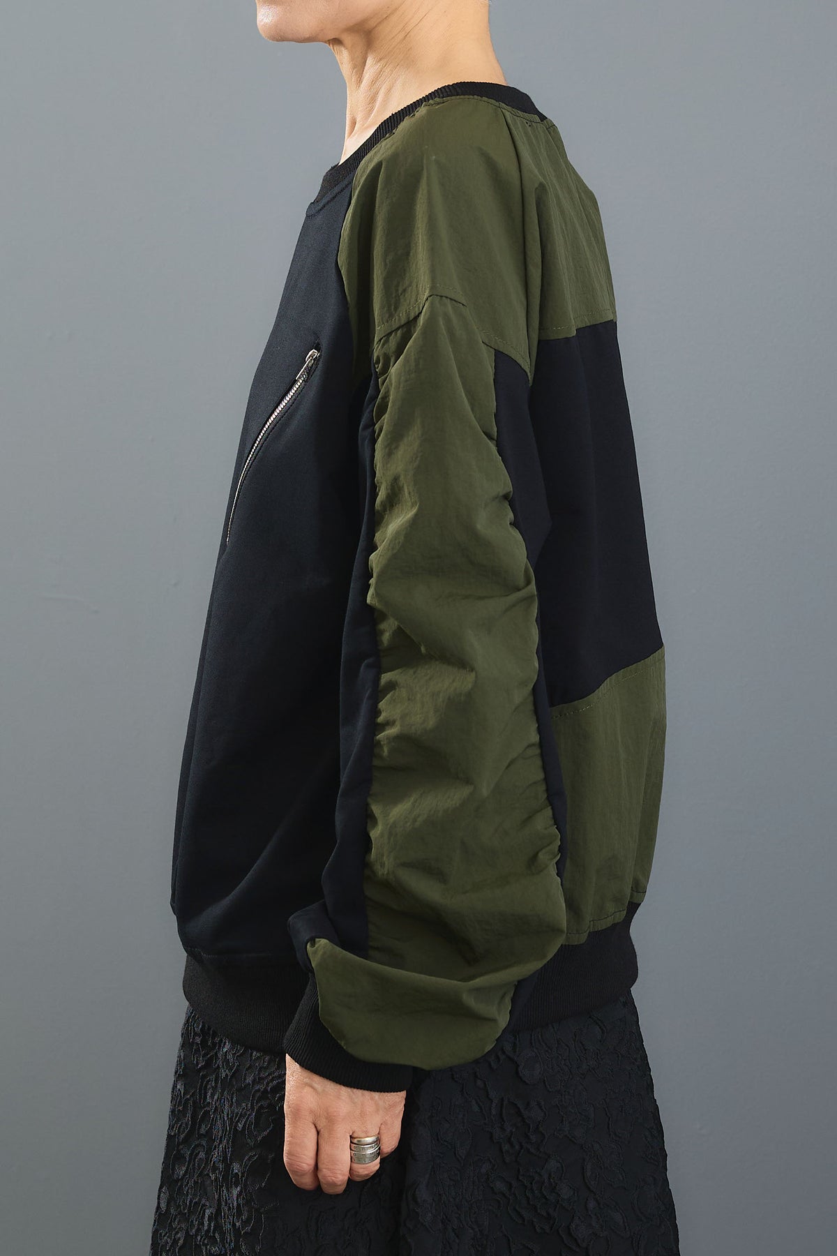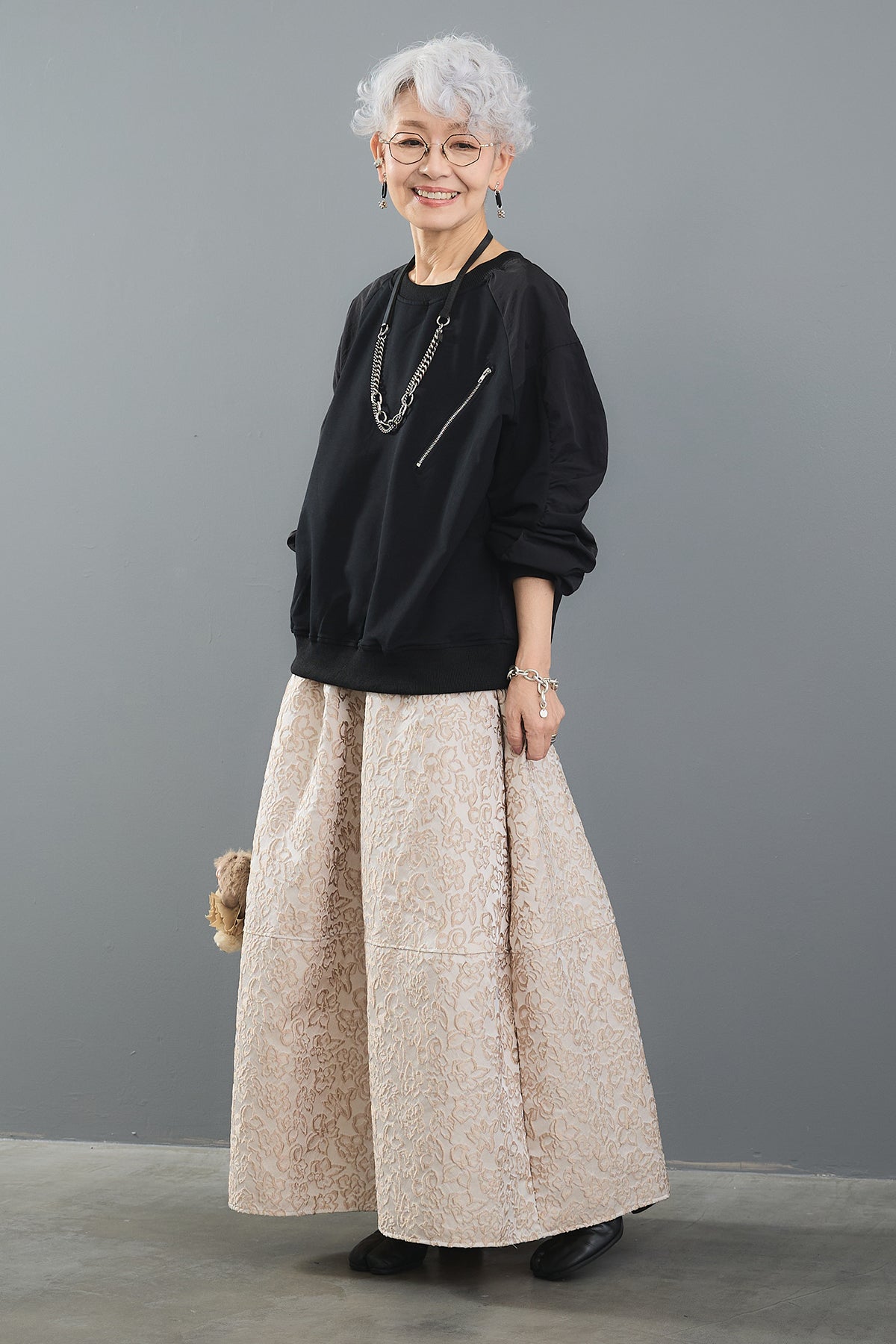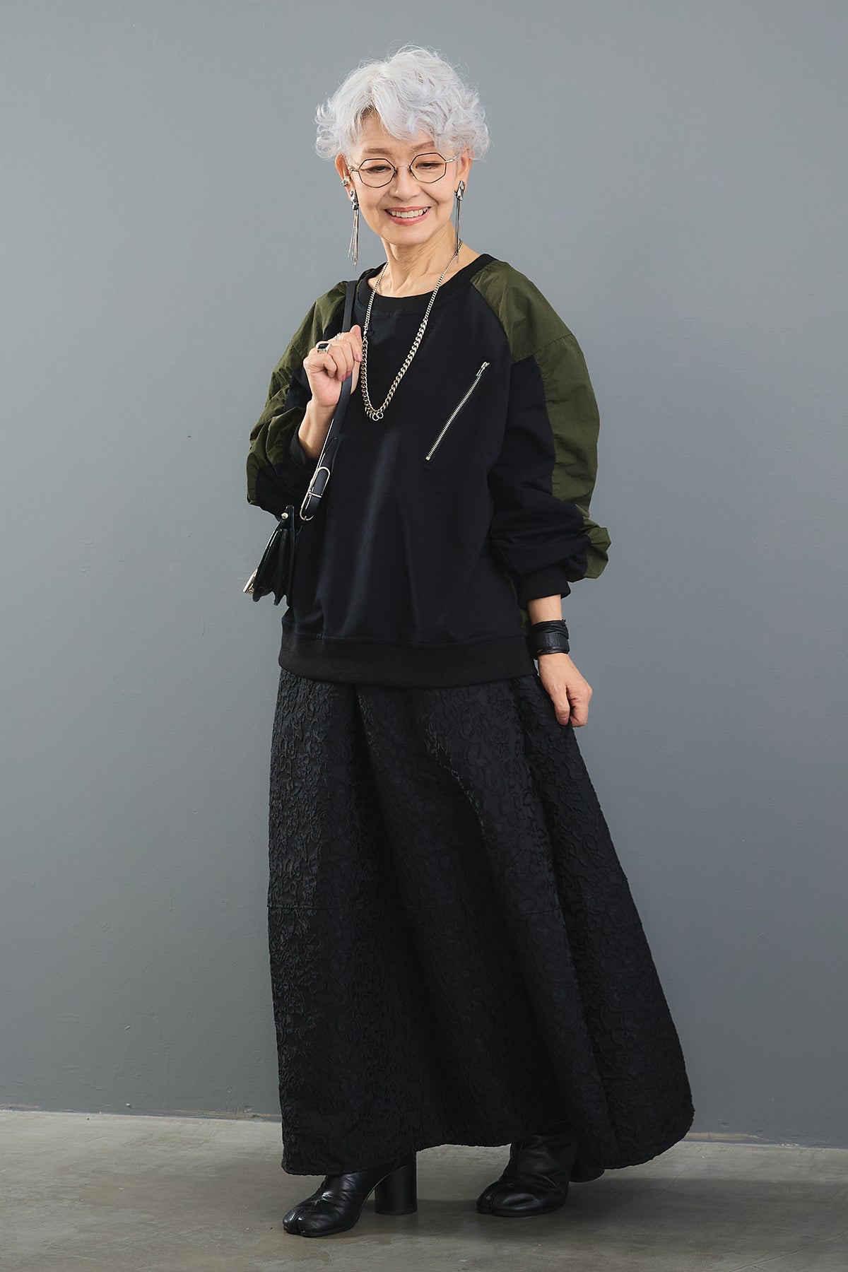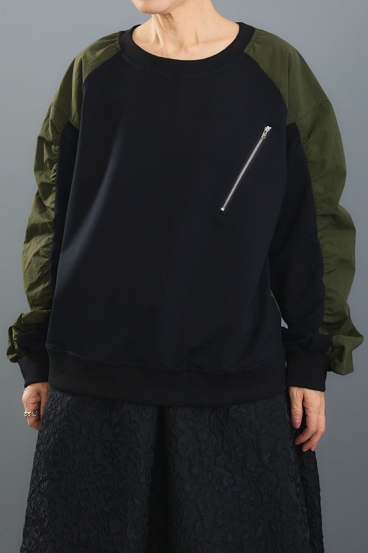 異素材切り替えとZIPディテールがポイントのギャザースリーブトップス。カジュアルなスウェットベースに、袖のギャザーとジップデザインを加えることで立体感とアクセントをプラスしています。程よくルーズなシルエットで抜け感があり、デニムはもちろん、スカートと合わせてもバランス良く決まる万能アイテム。シンプルながらもひとクセあるデザインで、デイリーコーデをアップデートしてくれる一枚です。