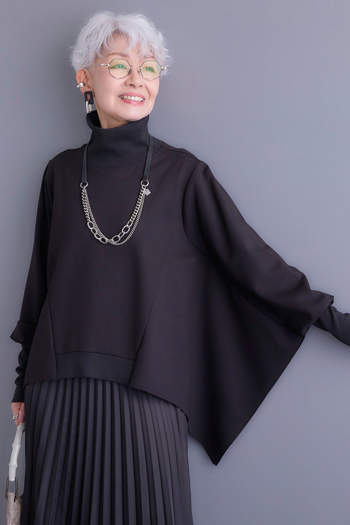 アシンメトリーなハイネックデザインが印象的なポンチョプルオーバー。ゆとりのあるシルエットで体型をカバーしつつ、立体的なフォルムがモードな雰囲気を引き立てます。さらりとした生地感で快適に着用でき、単品でもレイヤードでも活躍。洗練された印象を与える一枚です。