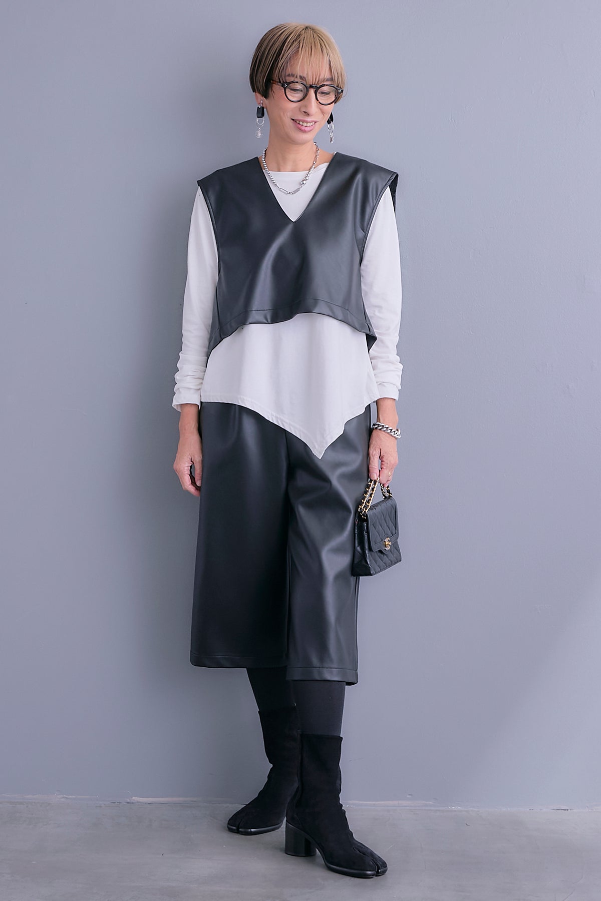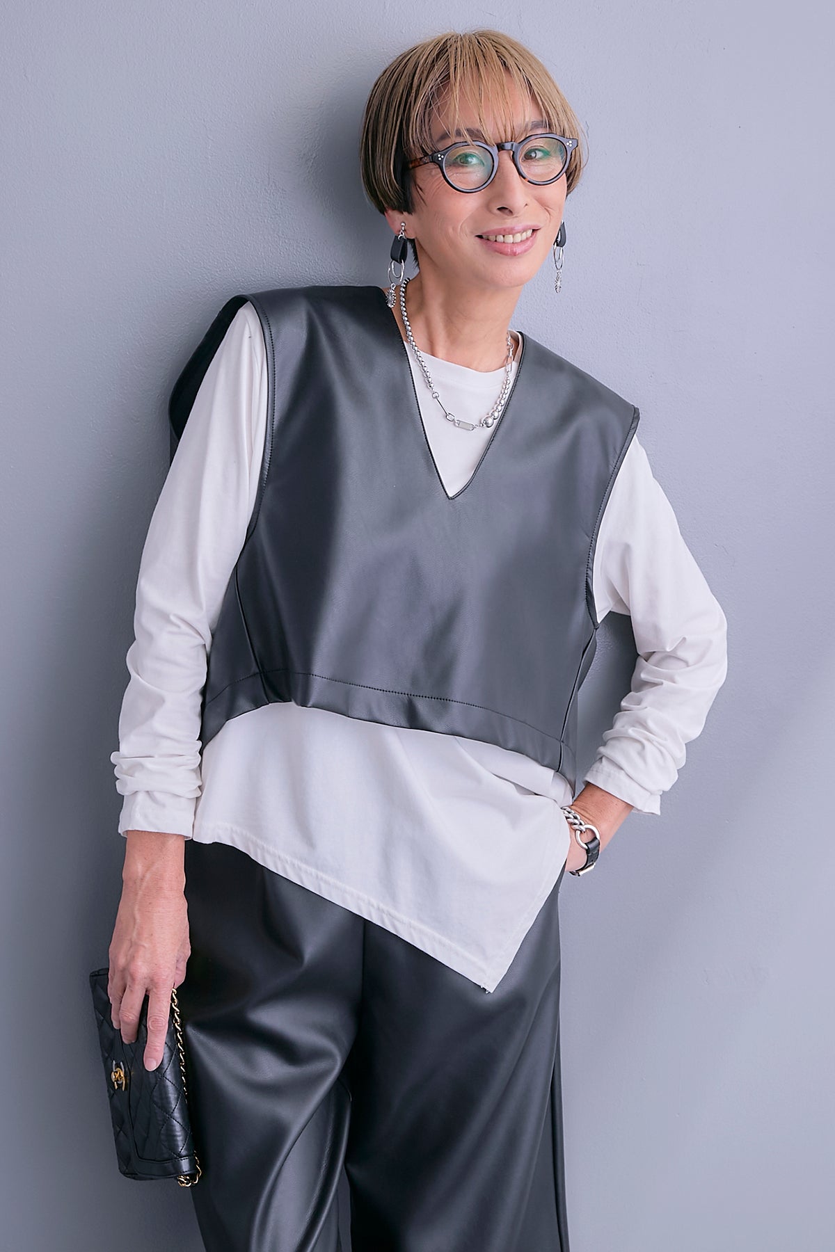 程よいハリ感のあるエコレザー素材を取り入れたバックオープンベスト。フロントはすっきりとしたVネックで、重ね着しやすいバランスに仕上げました。背中に抜けを持たせたデザインが、スタイリングに軽やかな奥行きをプラス。レイヤード次第で印象が変わり、カットソーやニットとの組み合わせも楽しめます。シンプルながら存在感があり、いつもの着こなしを更新してくれる一着です。