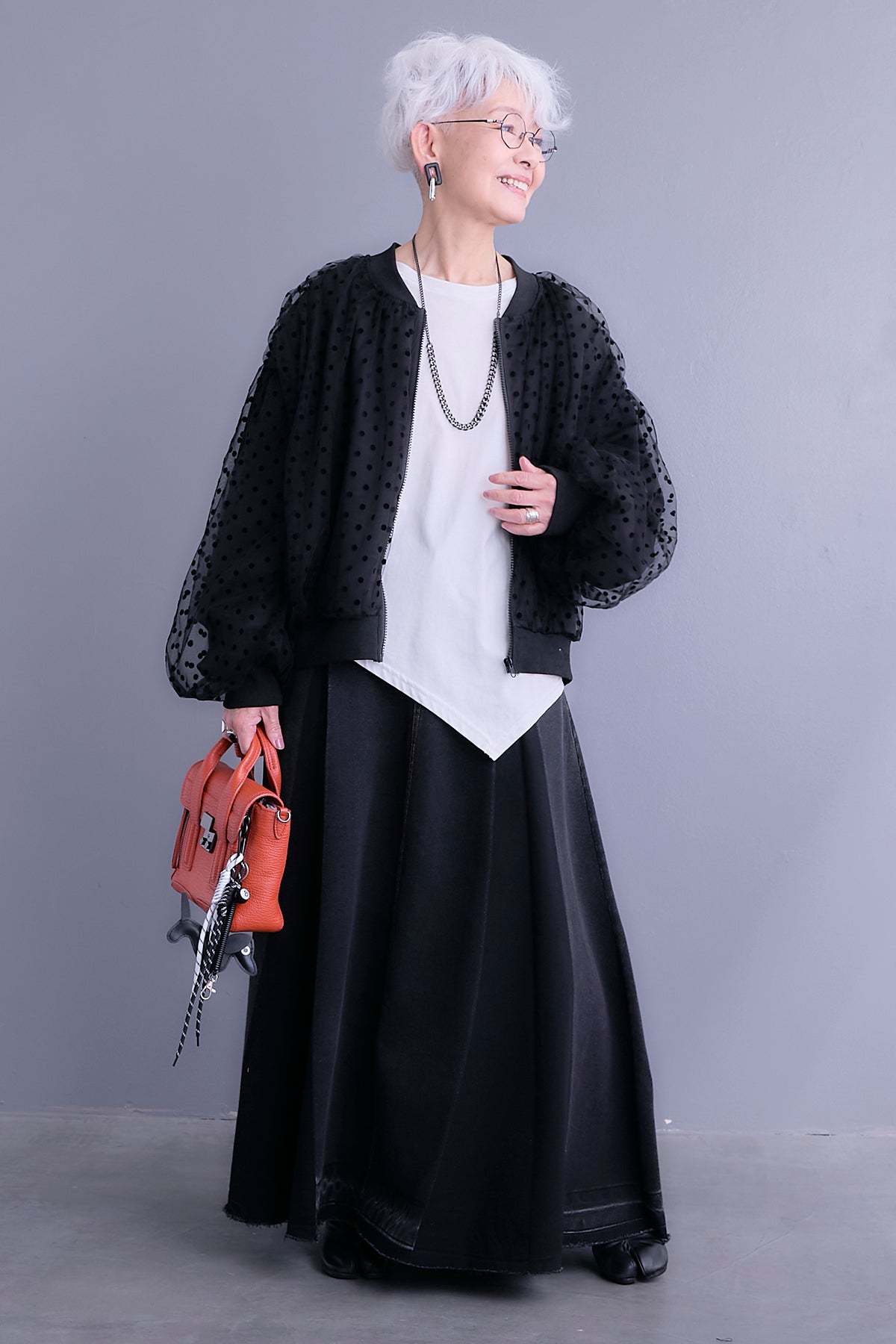 立体感のあるフロッキードットが印象的な、チュールレイヤードブルゾン。軽やかな透け感のチュールにドットフロッキーを重ねることで、奥行きのある表情とさりげない存在感をプラスした一着です。ふんわりとしたボリュームスリーブとコンパクトな丈感のバランスが、全体をすっきりとまとめつつ、スタイリングに程よいアクセントを添えてくれます。フロントはジップ仕様で、開けて羽織としても、閉じてトップス感覚でも着用可能。シンプルなボトムスに合わせるだけで、コーディネートにニュアンスが加わるデザイン性の高いアイテム。軽さがあり、季節の変わり目にも取り入れやすいのも魅力です。