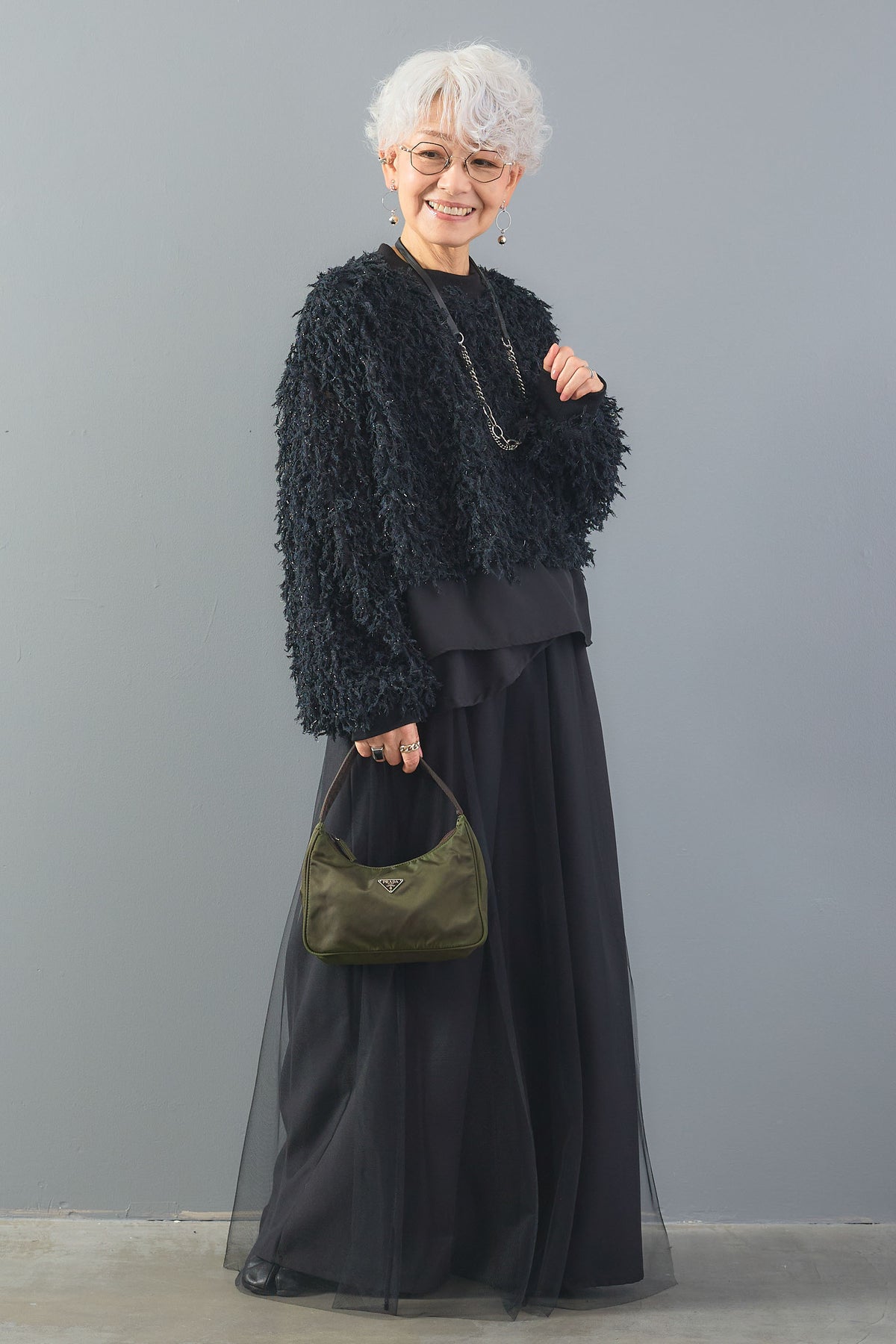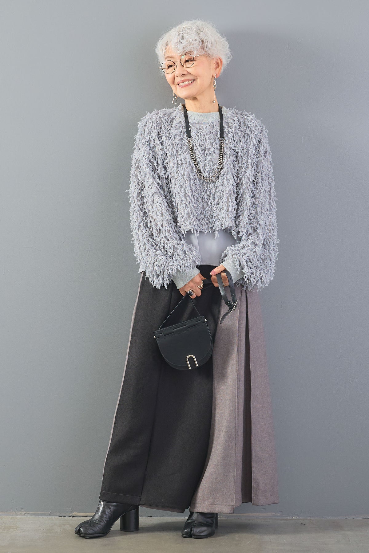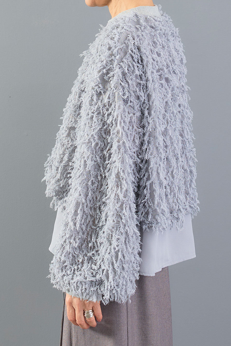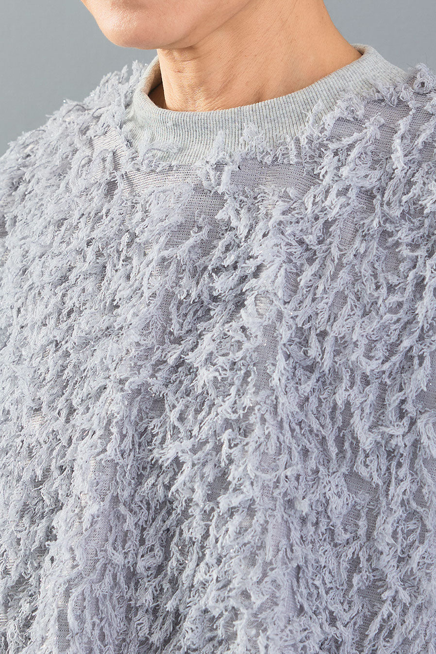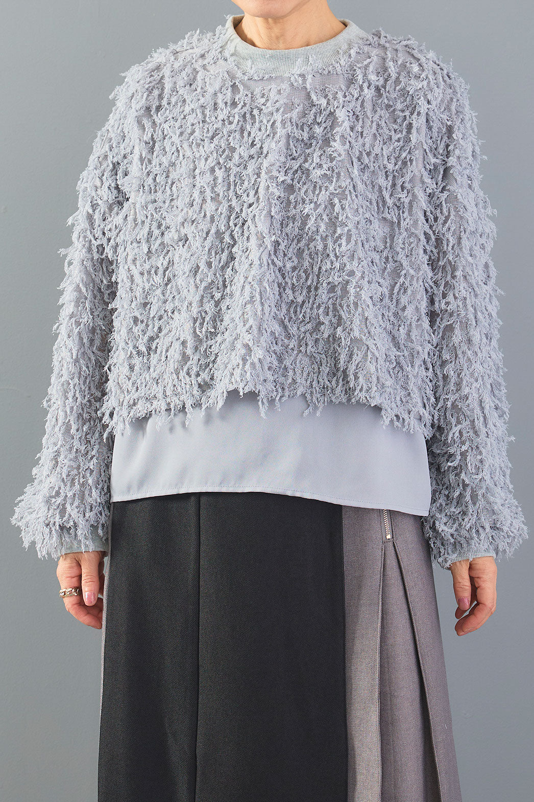 ラメ糸を織り交ぜたシャギーニットと、裾のレイヤードデザインが魅力の一枚。ふわふわとした素材感がシーズンムードを高め、動くたびに光を受けて華やかに輝きます。異素材の組み合わせが奥行きを生み、シンプルなボトムに合わせるだけで存在感のあるスタイルが完成します。