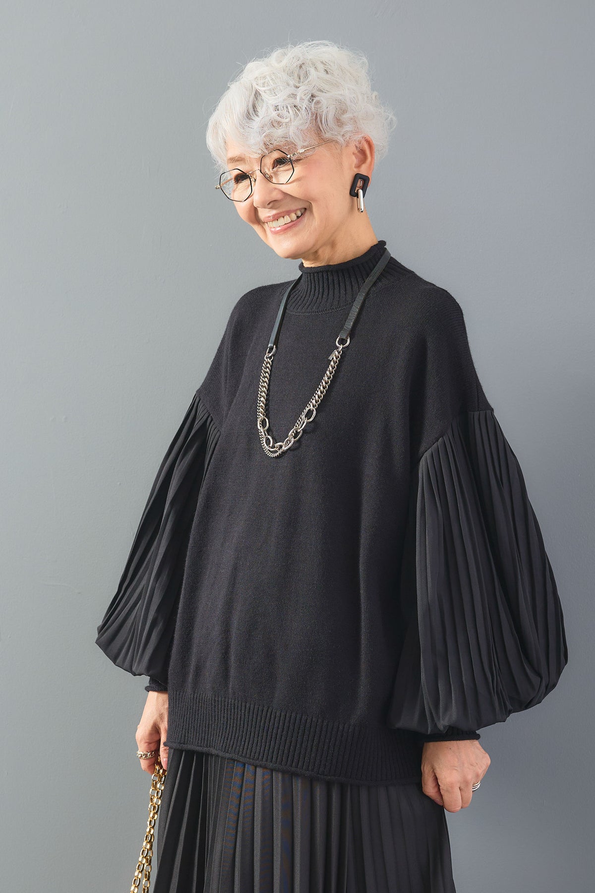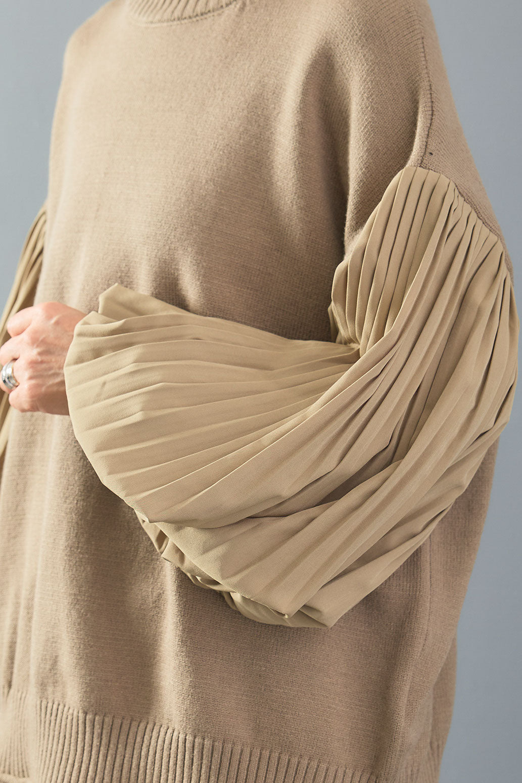 プリーツ素材を切り替えたボリュームスリーブが印象的なドッキングニット。立体感のある袖デザインが華やかさを添え、1枚で主役級の存在感を放ちます。身頃は柔らかなニットで快適な着心地。シンプルなボトムと合わせるだけで、バランスの取れた洗練スタイルが完成します。