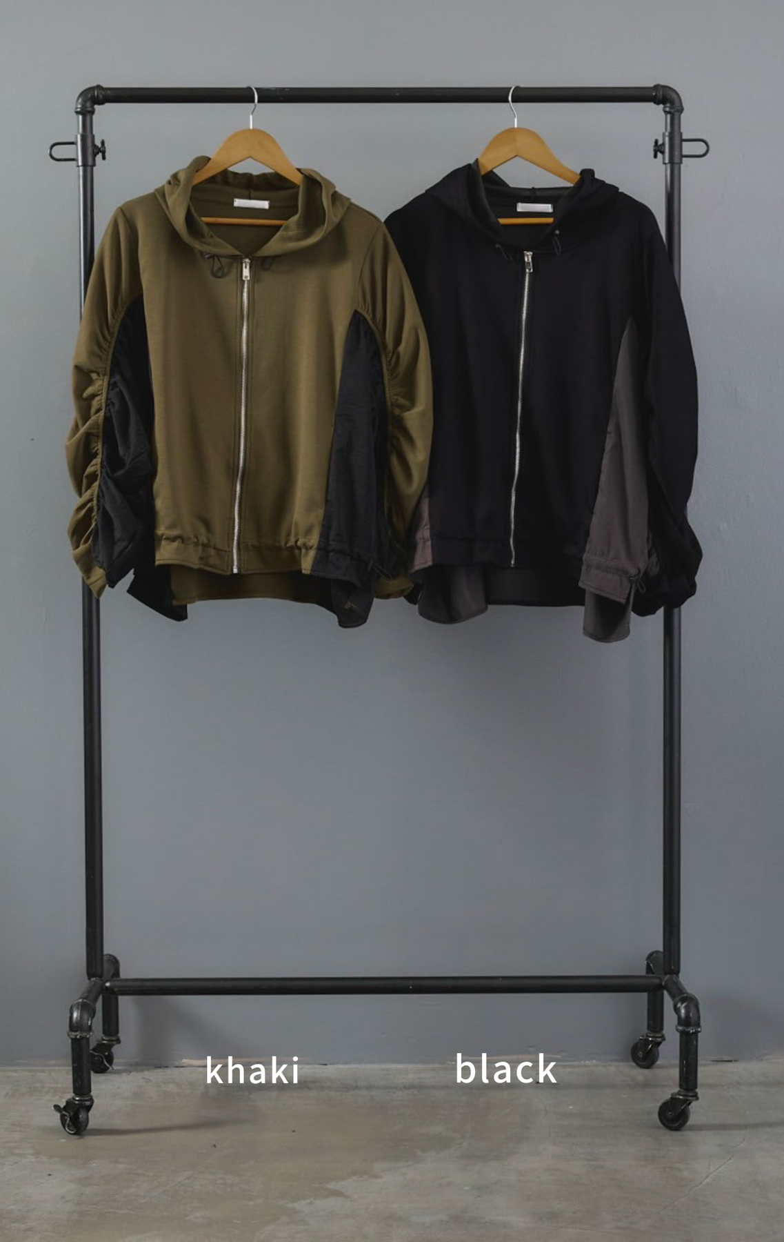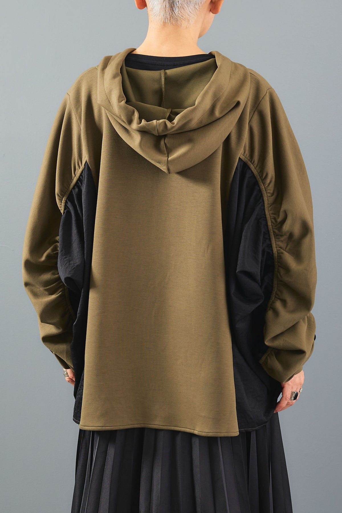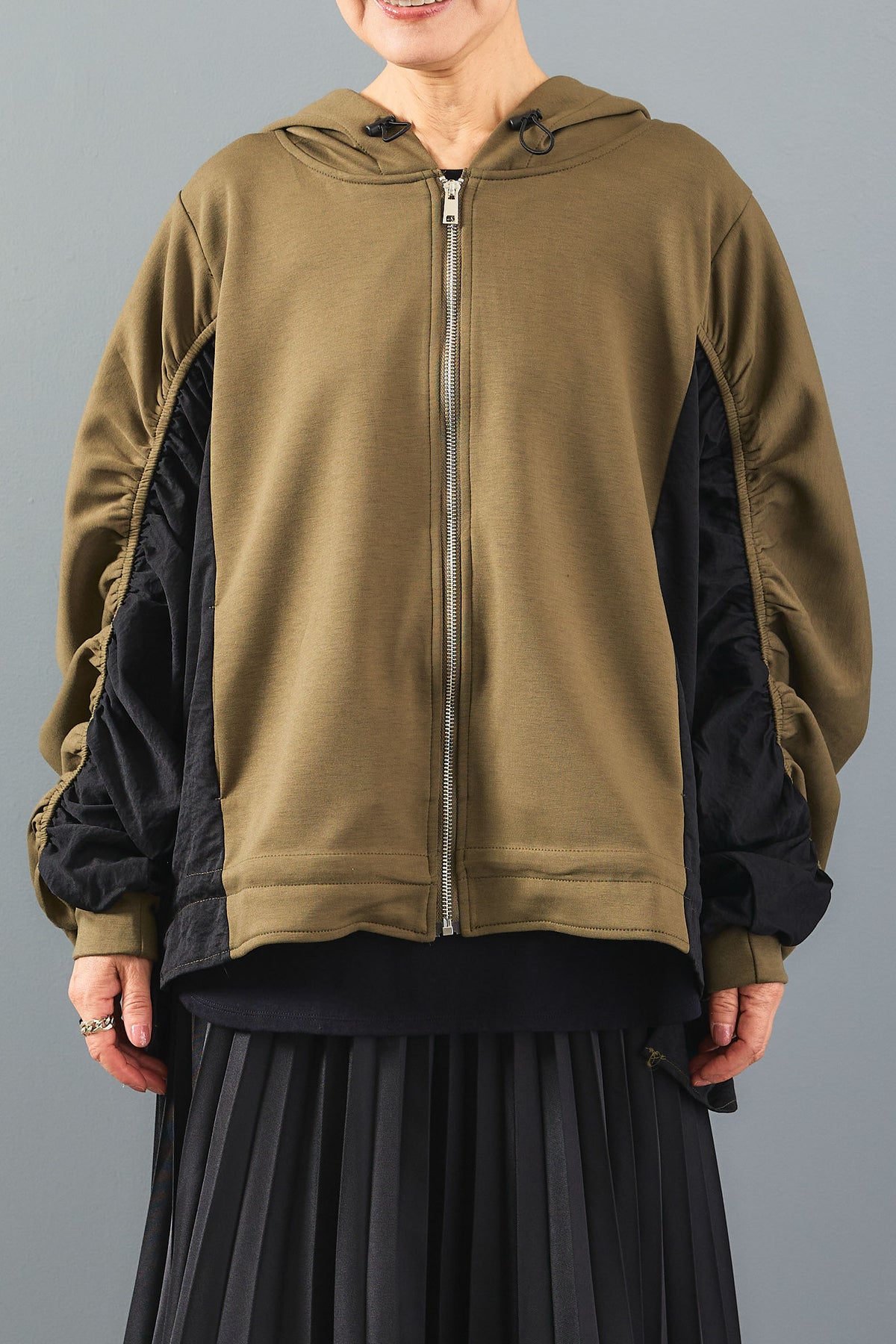 袖にシャーリングを施した立体的なシルエットが魅力のバイカラーパーカー。異素材の配色デザインが程よく個性を引き立て、カジュアルながらも印象的なスタイルに。軽やかな着心地でシーズン問わず活躍。ジップアップ仕様で着脱もスムーズな万能アウターです。