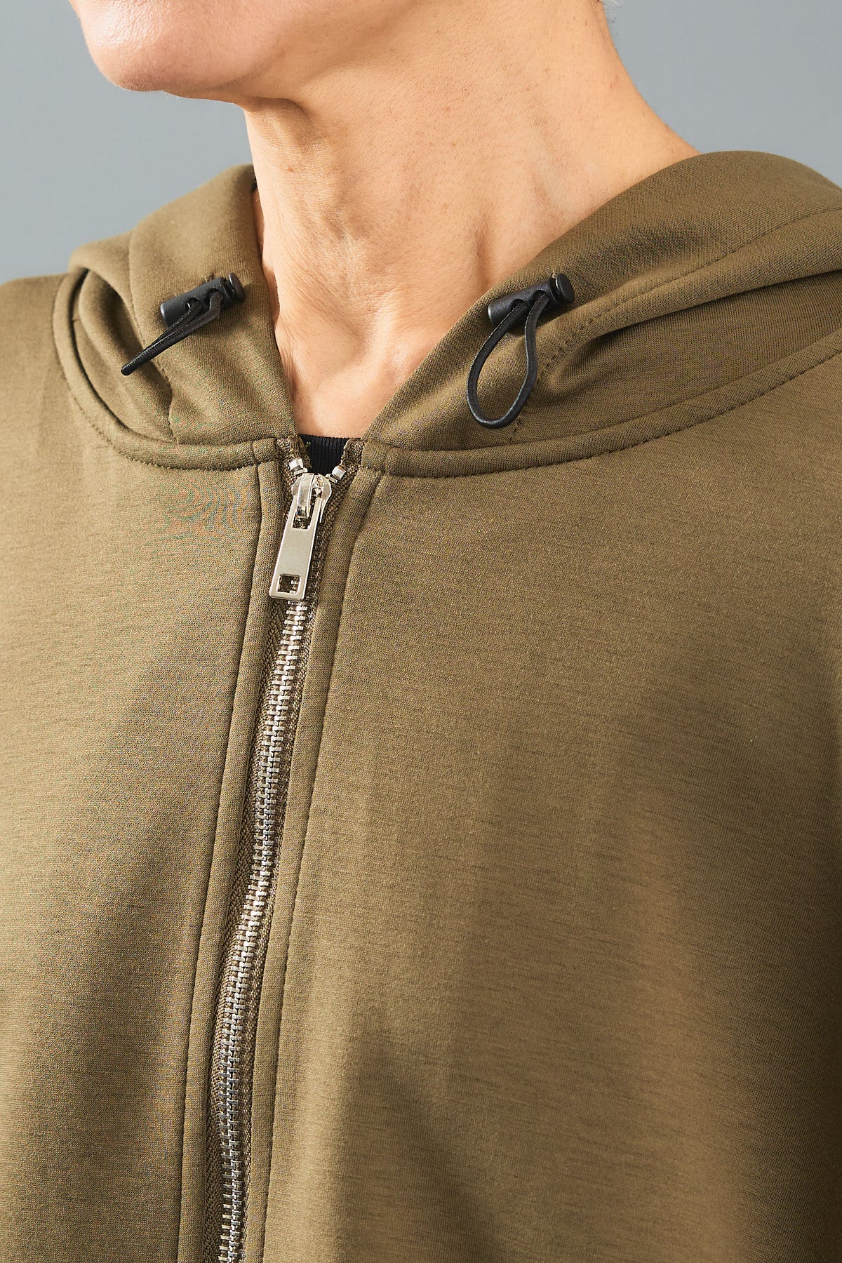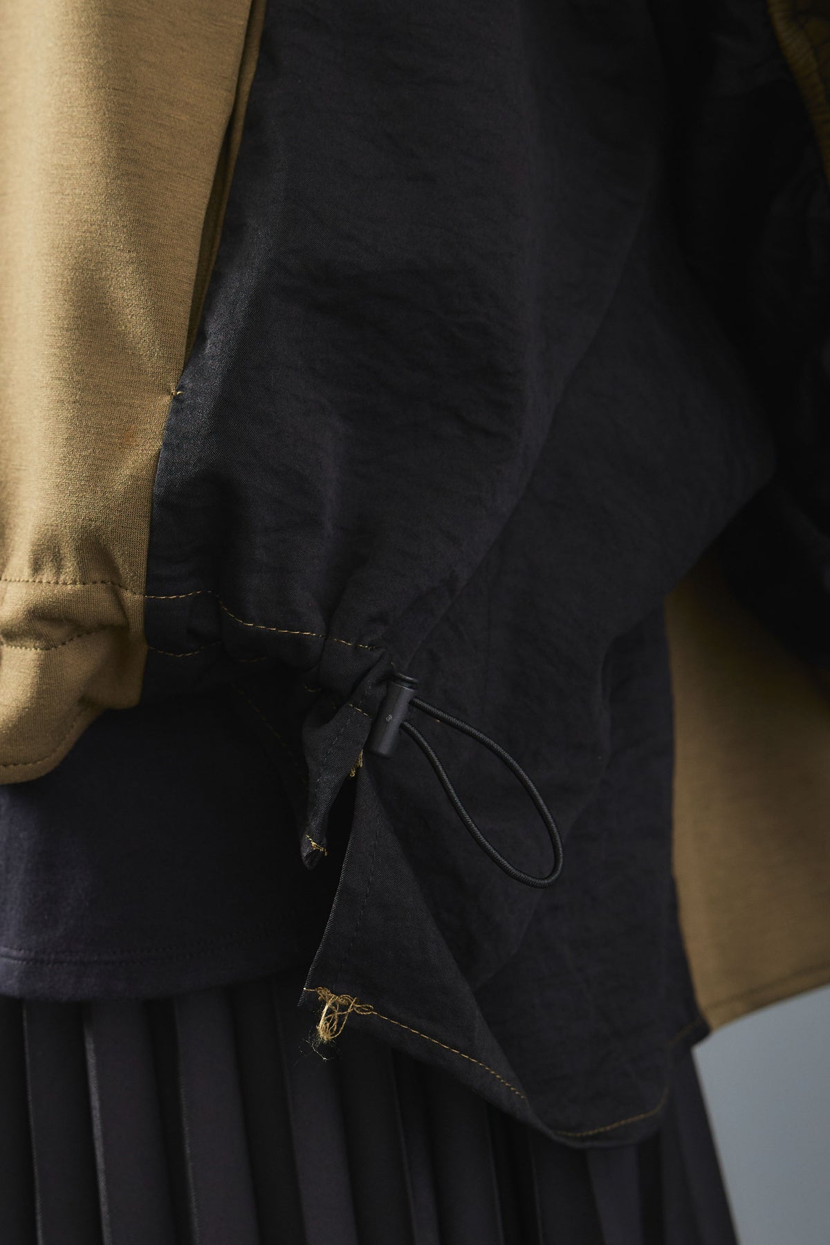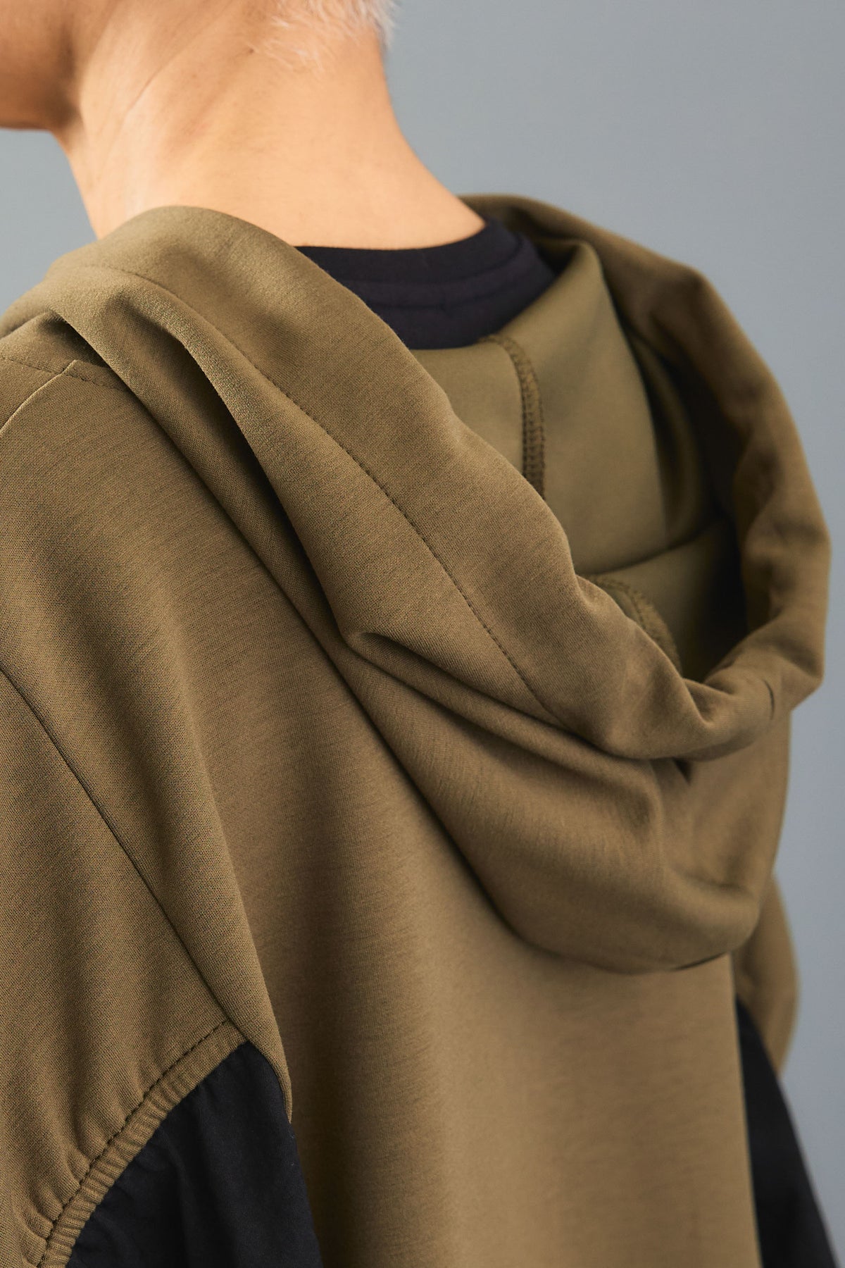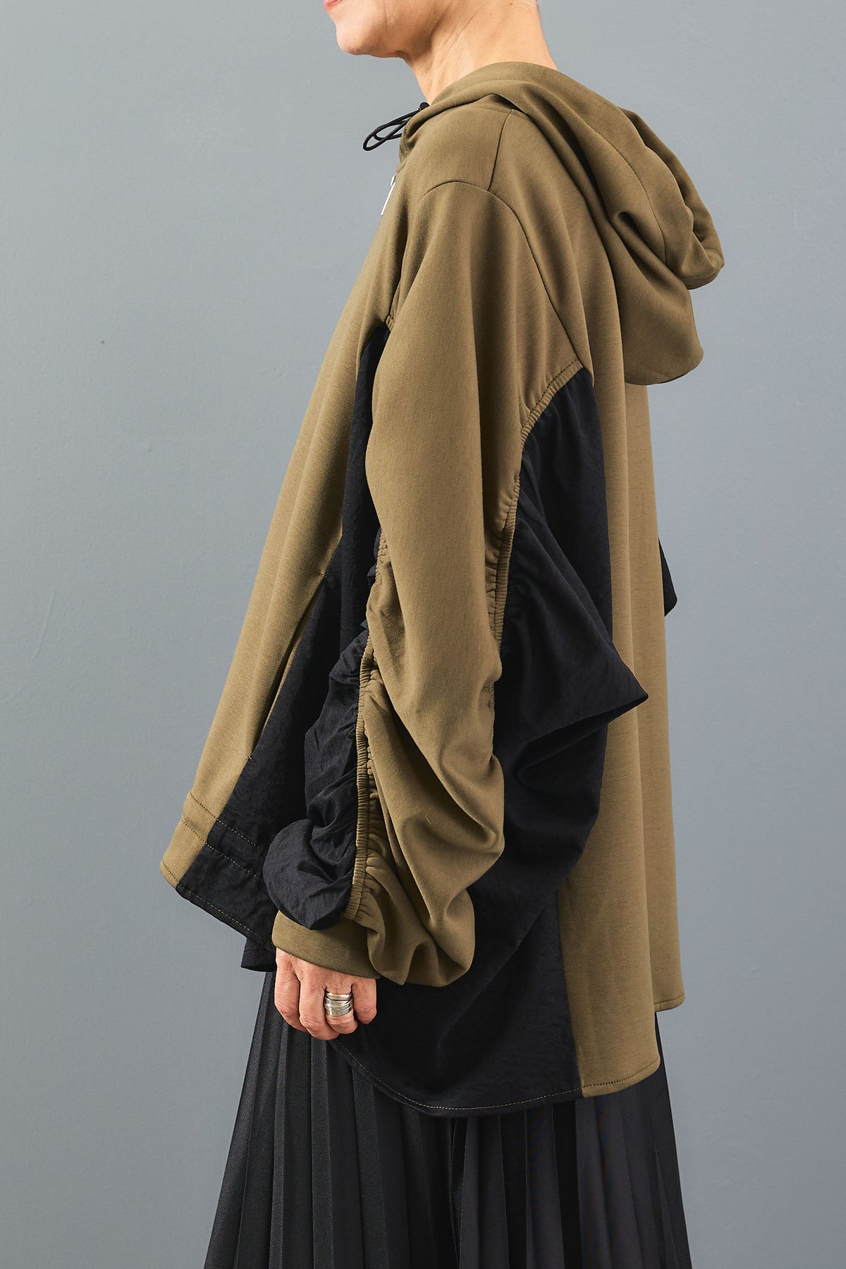 袖にシャーリングを施した立体的なシルエットが魅力のバイカラーパーカー。異素材の配色デザインが程よく個性を引き立て、カジュアルながらも印象的なスタイルに。軽やかな着心地でシーズン問わず活躍。ジップアップ仕様で着脱もスムーズな万能アウターです。
