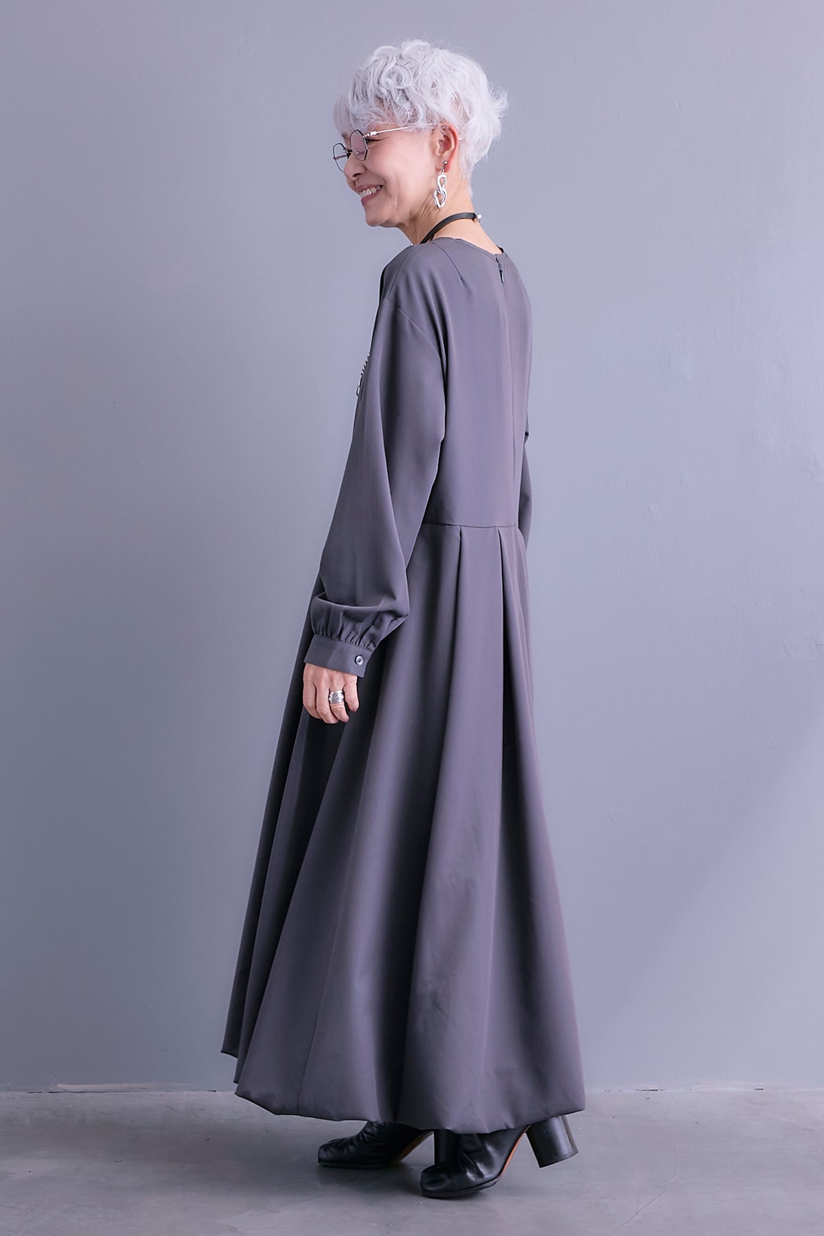 ふんわり広がるバルーンシルエットが印象的なワンピース。身体のラインを拾いにくい程よいハリ感のある素材で、さらっと着るだけで立体的なシルエットが完成します。袖口にはギャザーを添えて、メリハリのある表情に。一枚で決まる存在感がありながらも、装飾を抑えたシンプルなデザインで幅広いシーンにフィット。ショートブーツやスニーカーとも相性が良く、季節に合わせたスタイリングが楽しめるアイテムです。