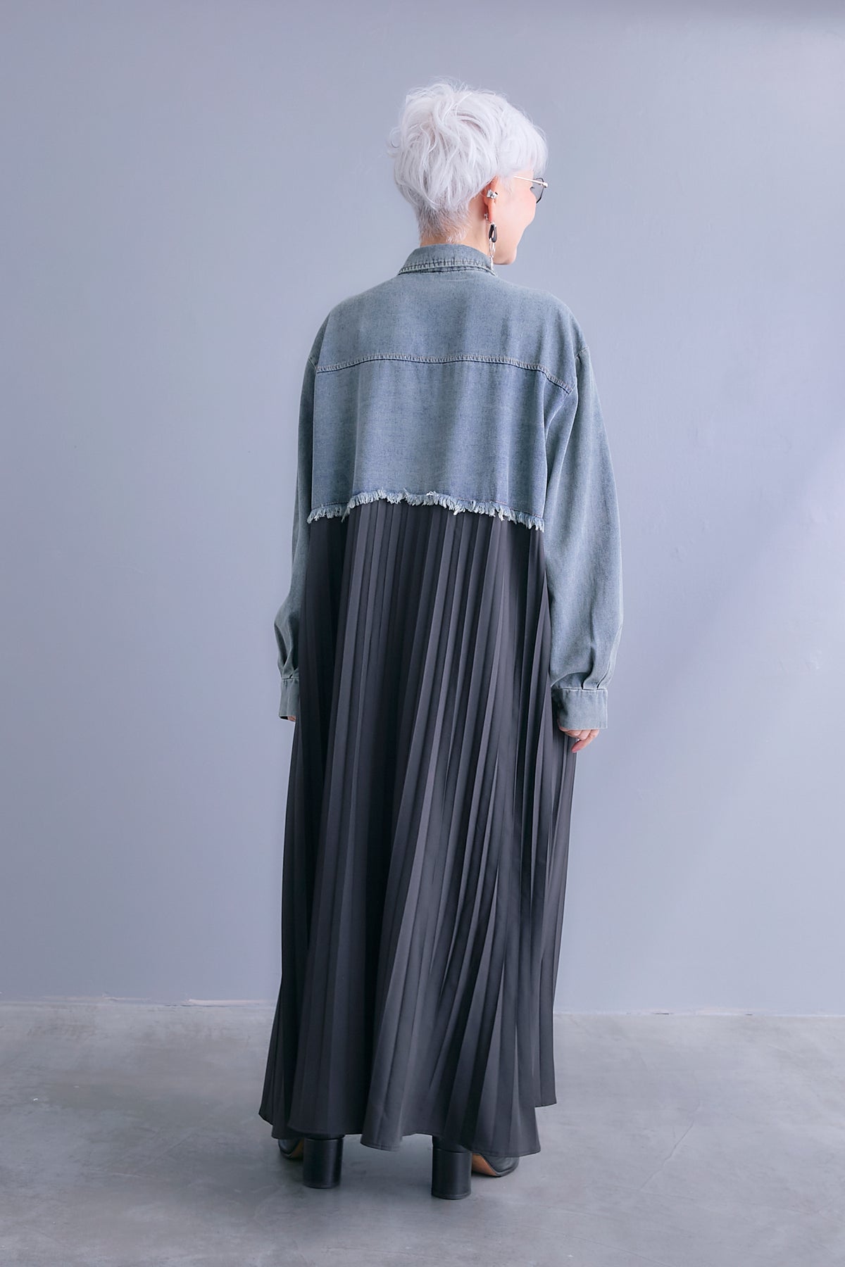 デニムジャケットとプリーツスカートをドッキングした、1枚で完成度の高いワンピース。上身頃はデニムならではの程よいカジュアル感があり、裾のカットオフデザインがさりげないアクセントに。下身頃は細かなプリーツが動くたびに揺れ、縦ラインを強調。異素材のコントラストが奥行きのある着こなしを叶えます。