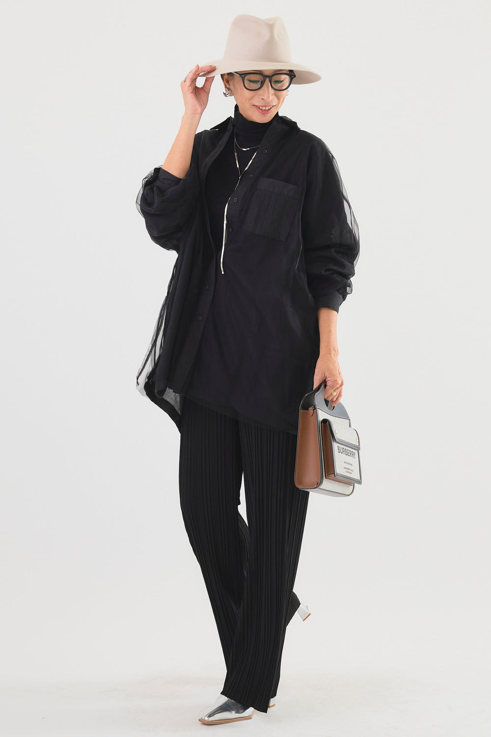 【即納】ピンストライプ×チュールレイヤードパンツ