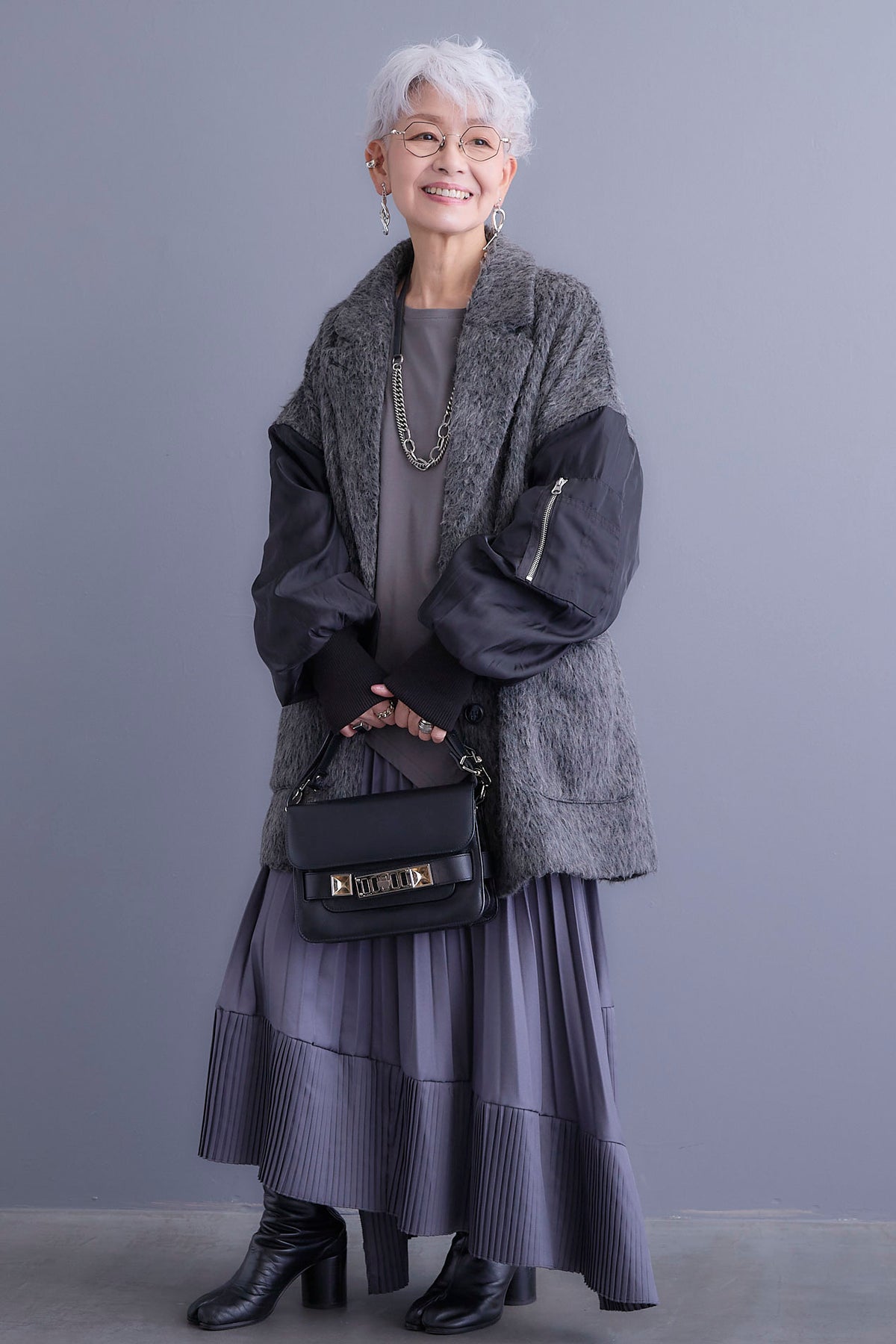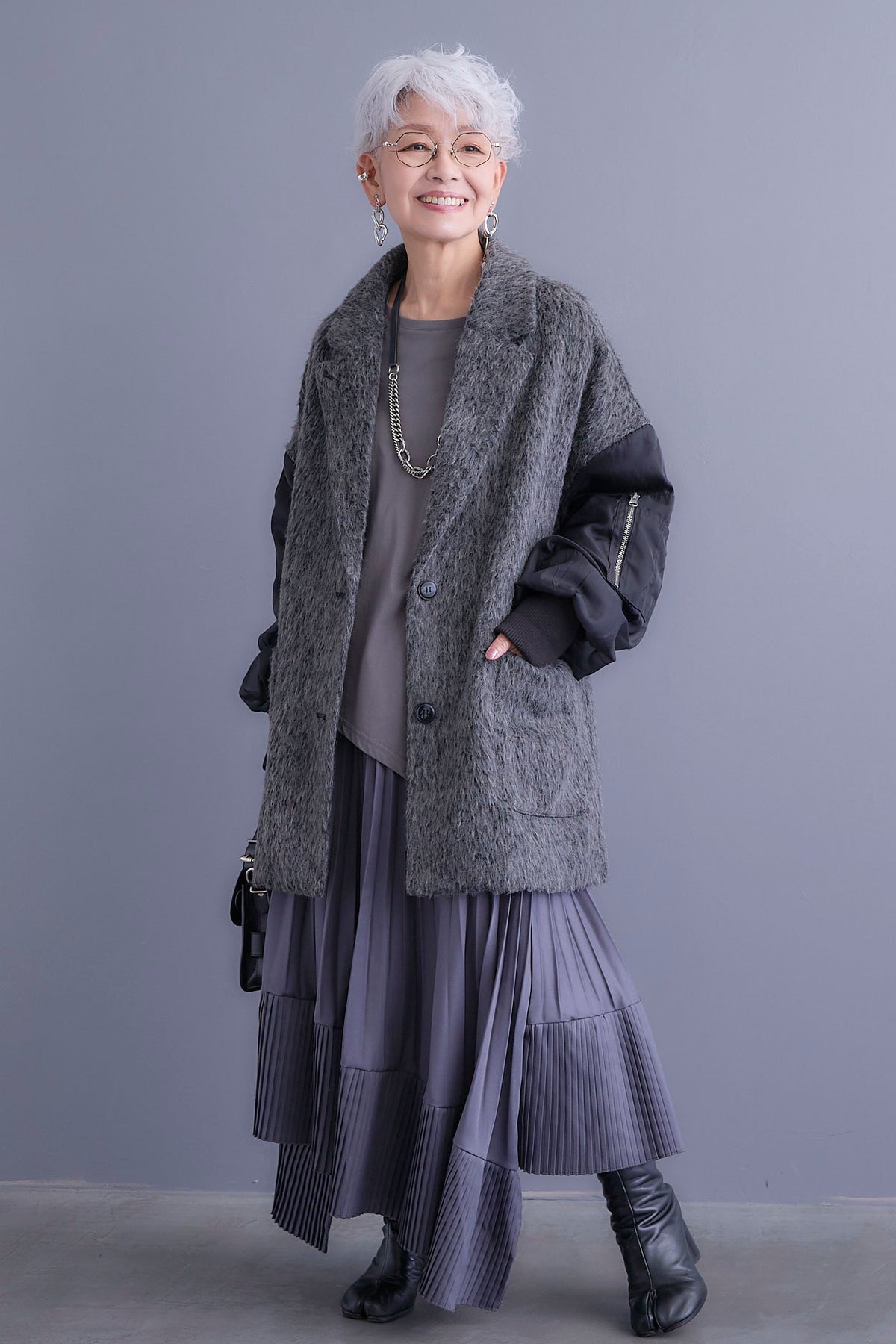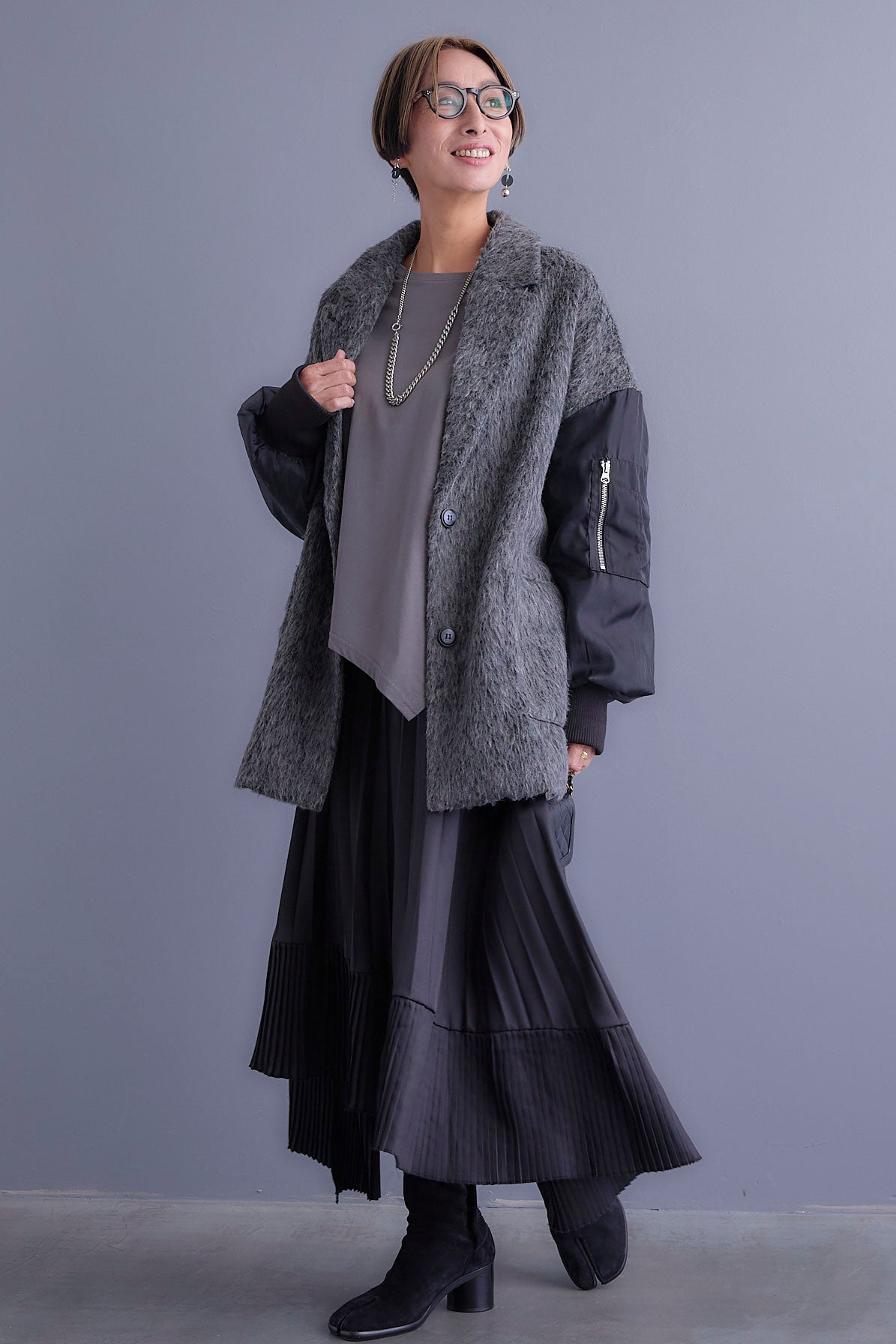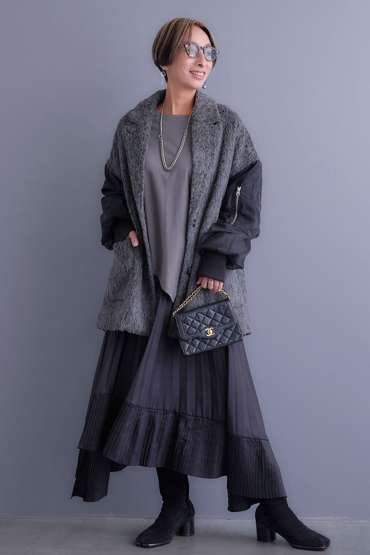 【新色追加】【SET】アシンメトリーロンT+チュールレイヤードMA-1シャギーオーバーコート+アシンメトリープリーツスカート(3set)