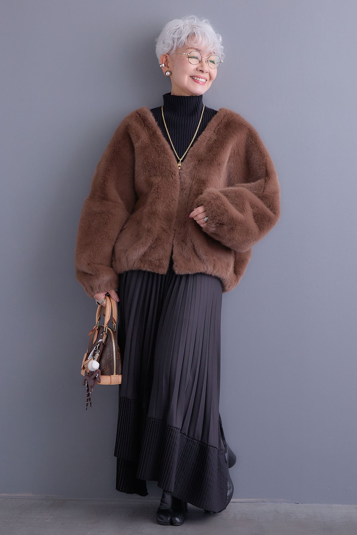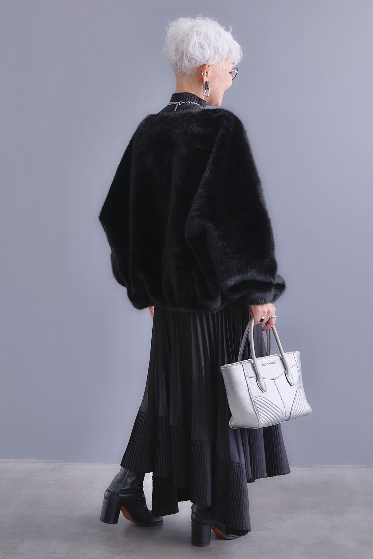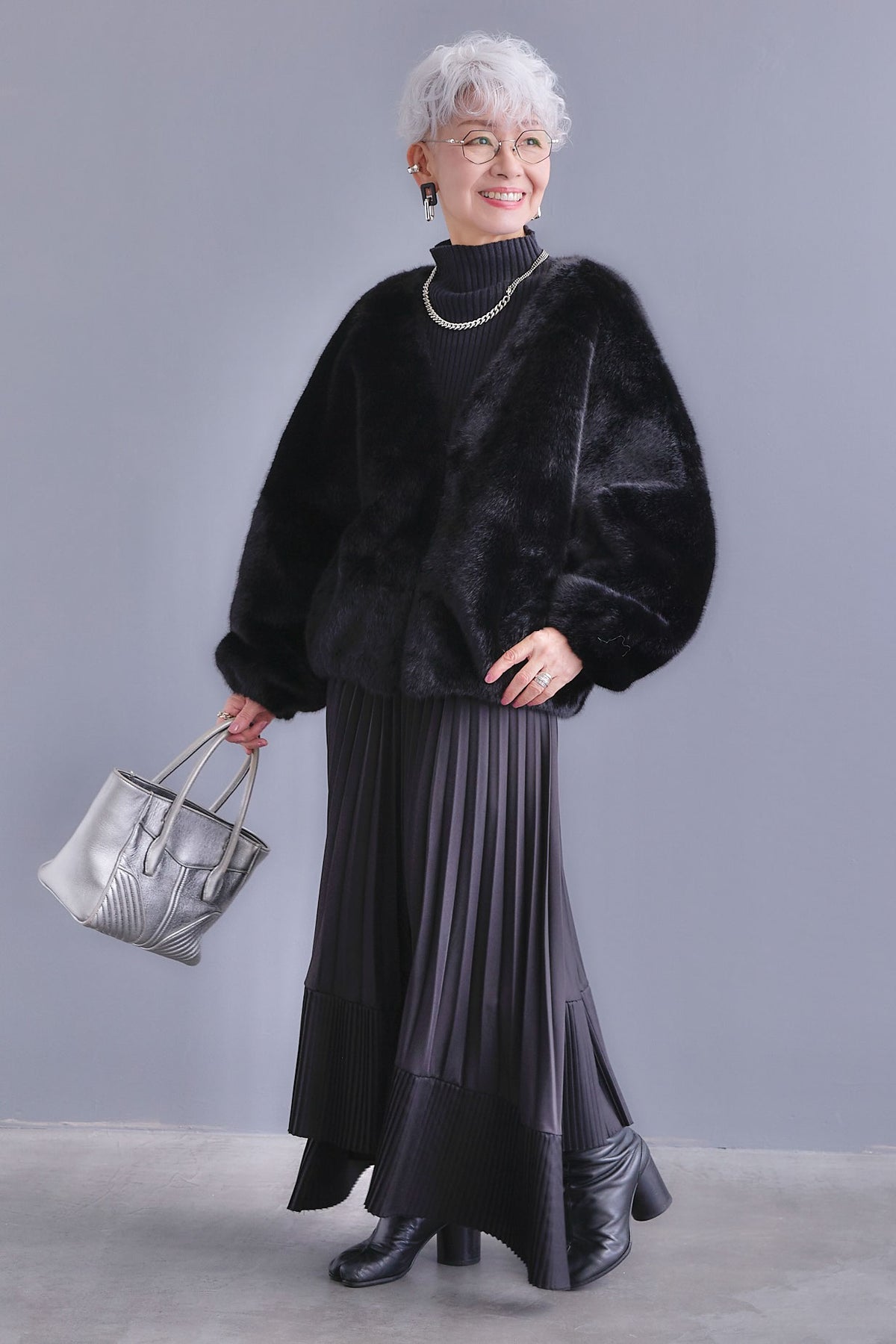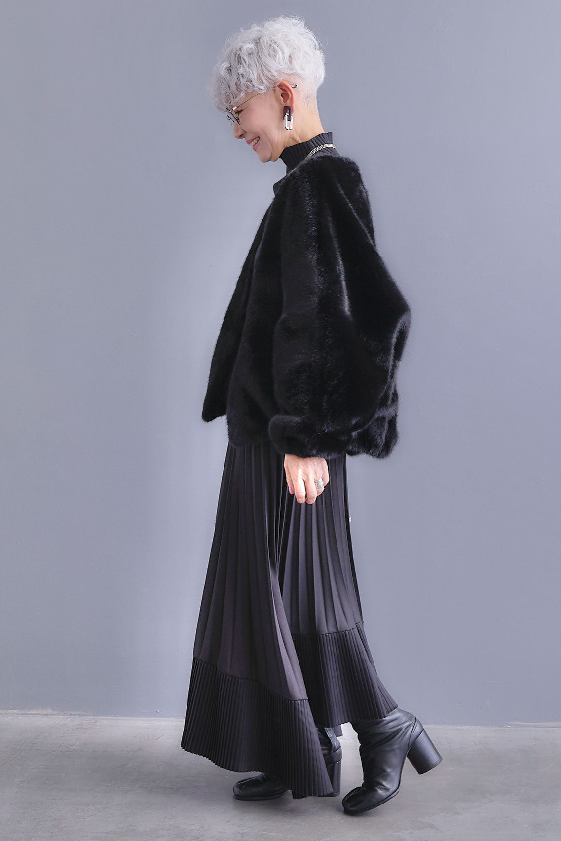 【SET】ボリュームスリーブハイネックリラクシーニット+ノーカラーラウンドシルエットファーコート+アシンメトリープリーツスカート(3set)
