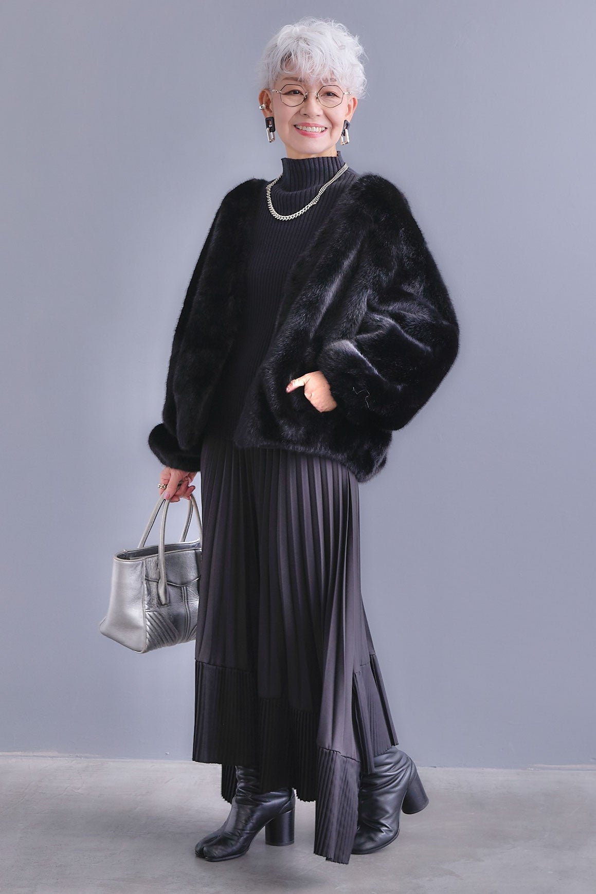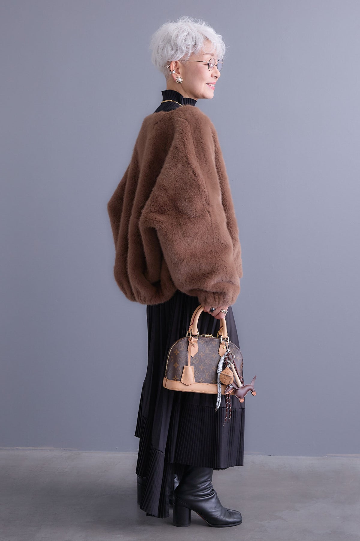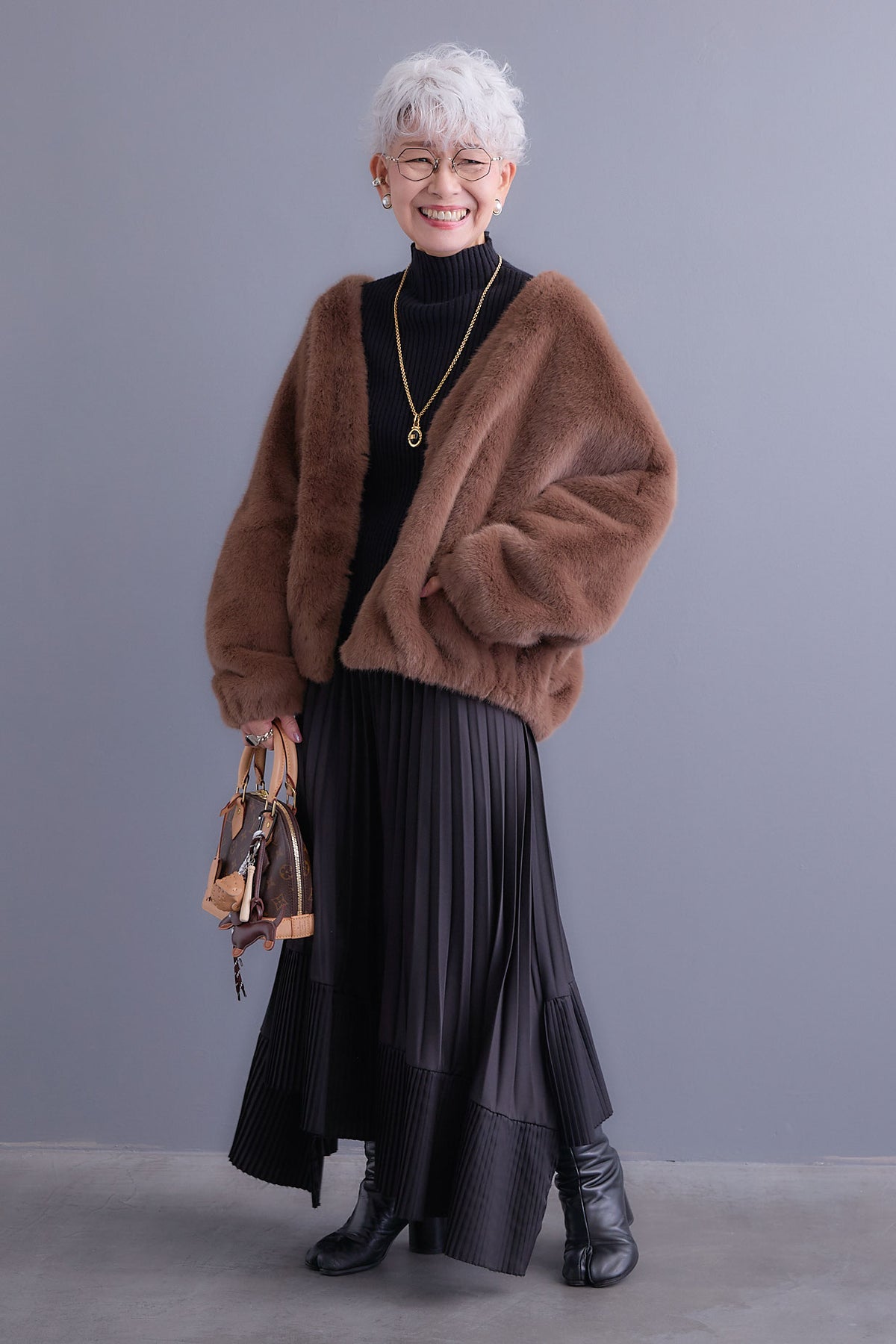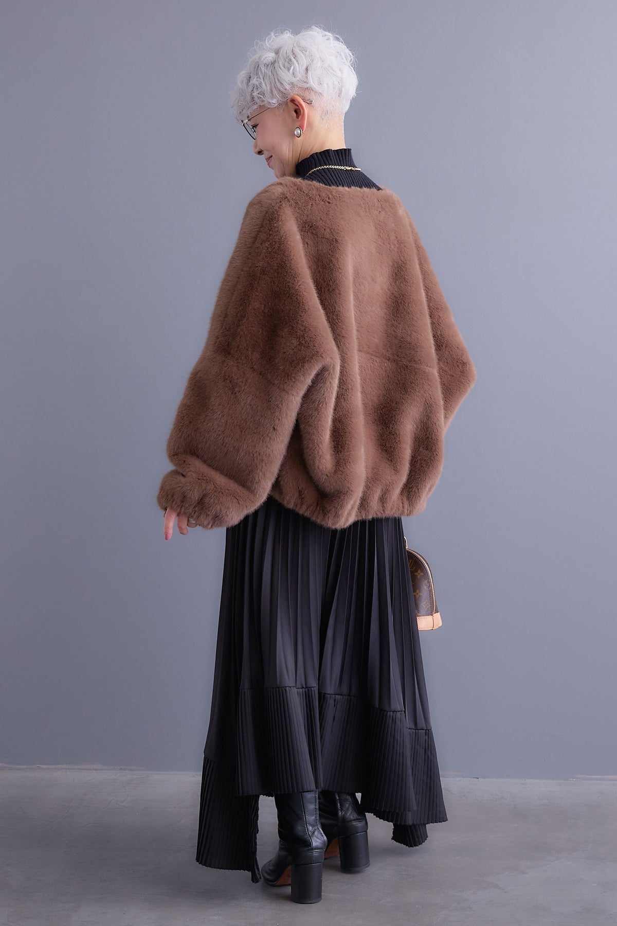 【SET】ボリュームスリーブハイネックリラクシーニット+ノーカラーラウンドシルエットファーコート+アシンメトリープリーツスカート(3set)