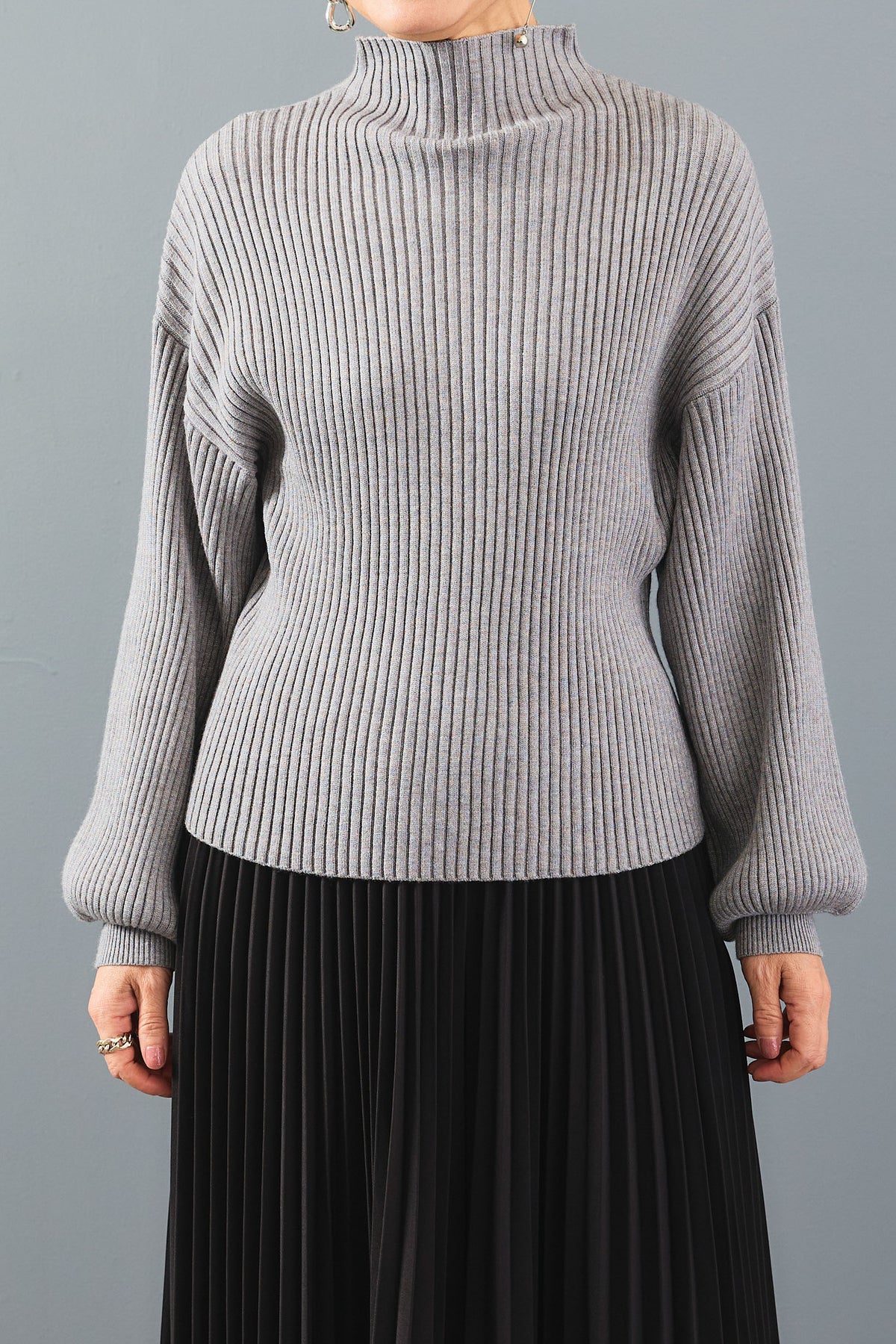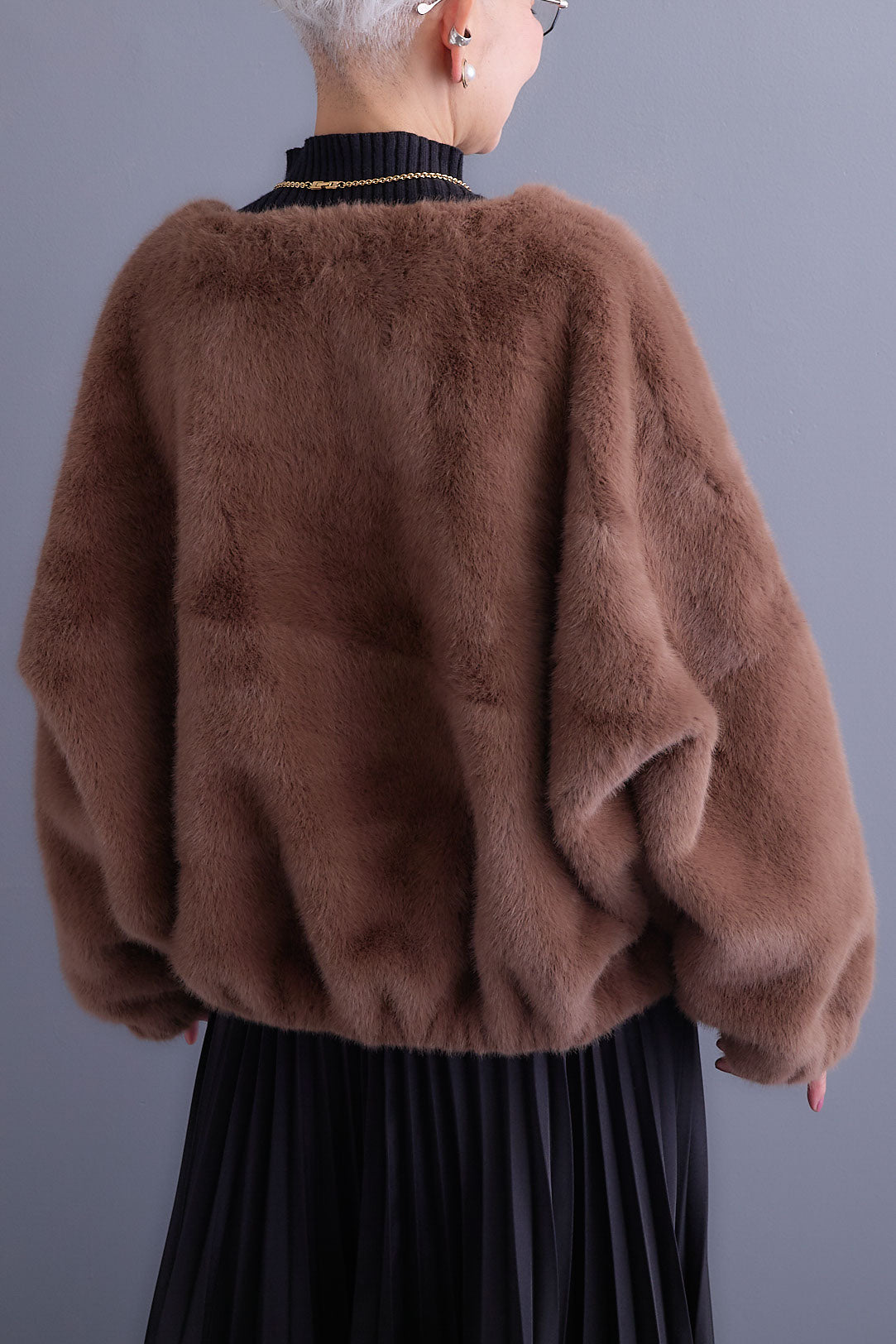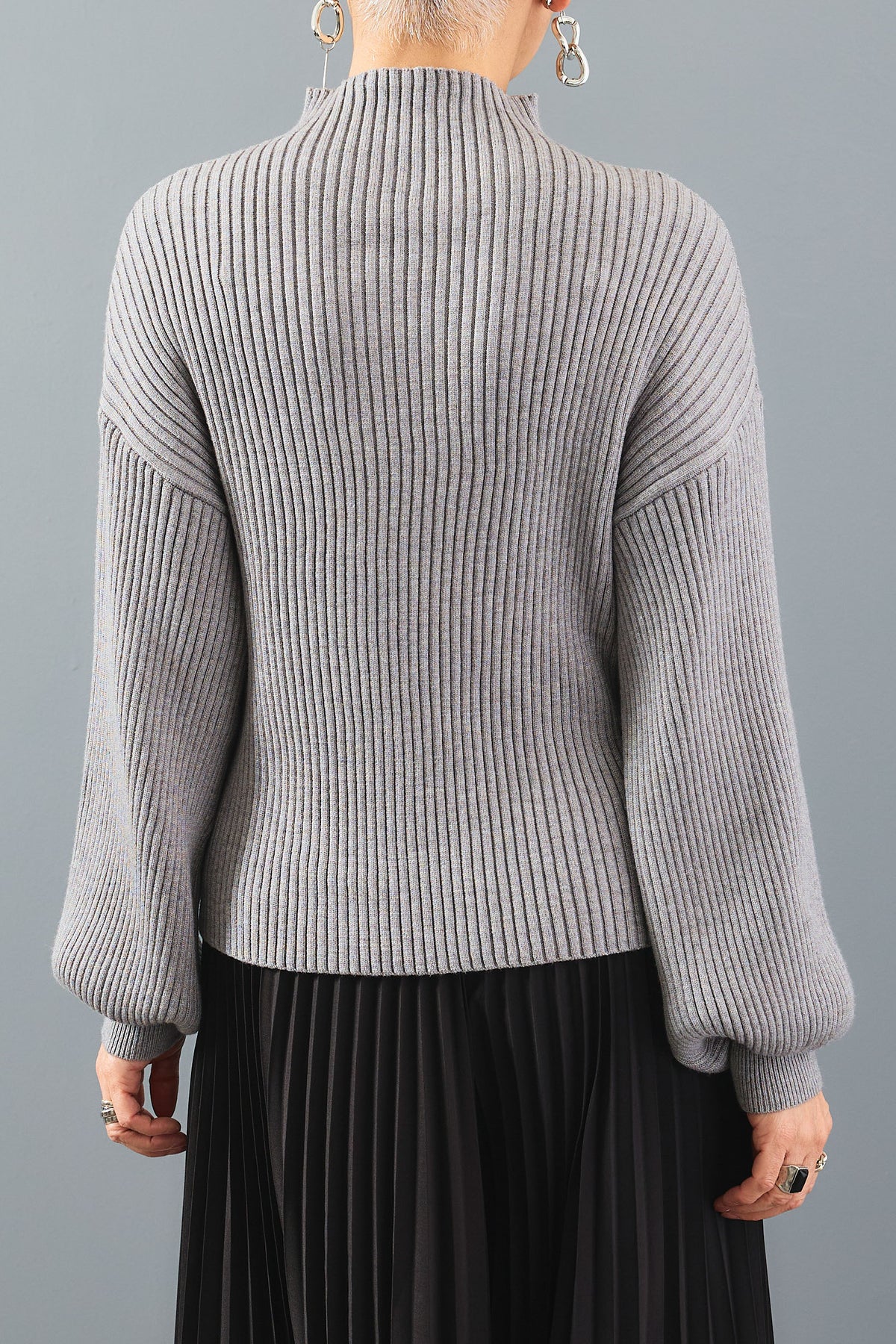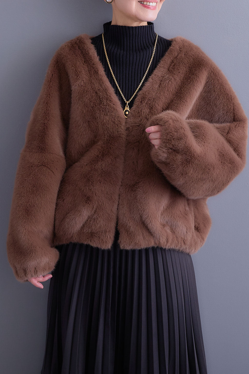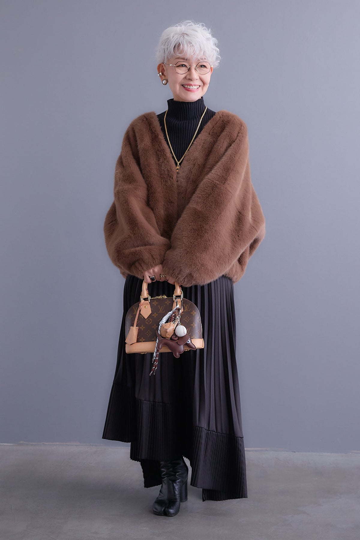 【SET】ボリュームスリーブハイネックリラクシーニット+ノーカラーラウンドシルエットファーコート+アシンメトリープリーツスカート(3set)