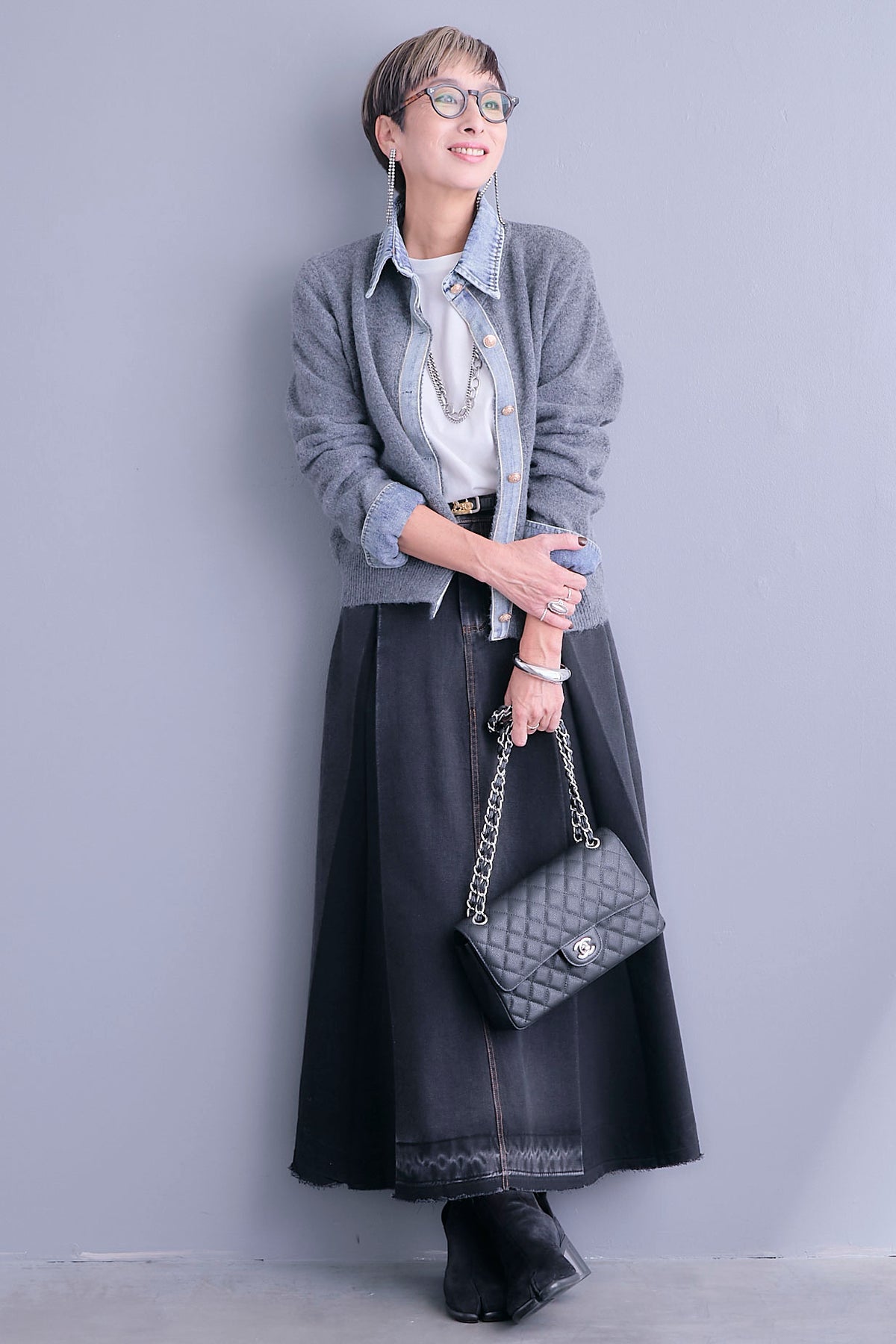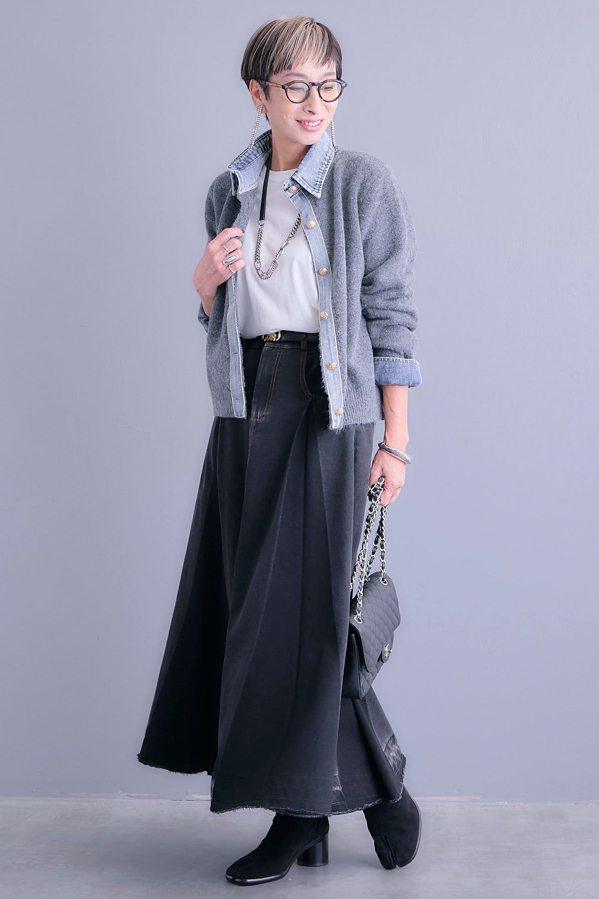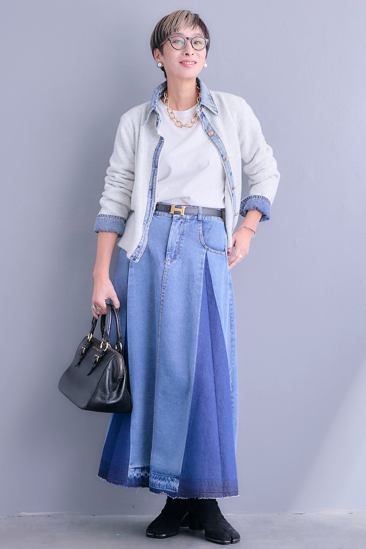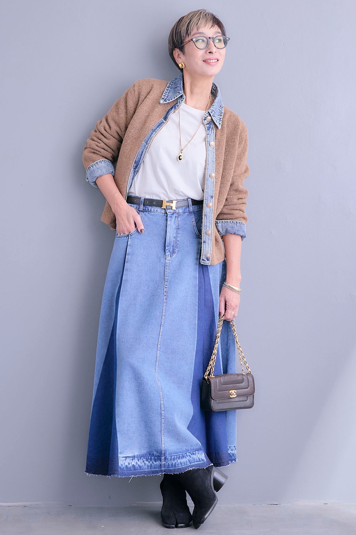 【SET】デニムコンビニットカーディガン+プリーツタックデニムスカート(2set)