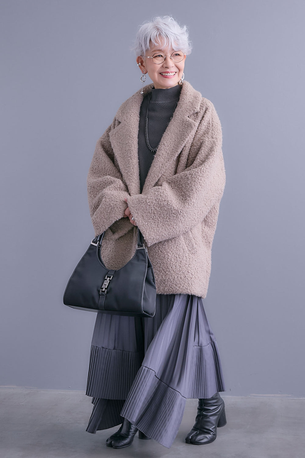【SET】アシンメトリーオーバーニット+ブークレーテーラードコート+アシンメトリープリーツスカート(3set)