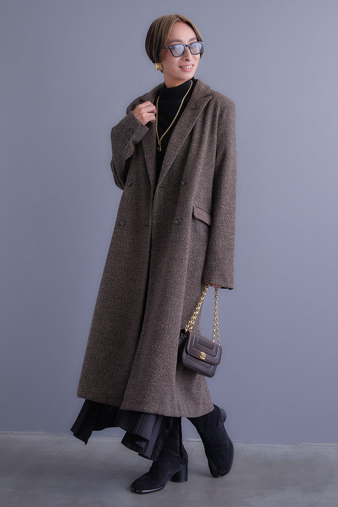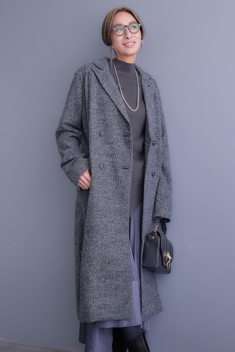【SET】アシンメトリーオーバーニット+ツイードロングチェスターコート+アシンメトリープリーツスカート(3set)