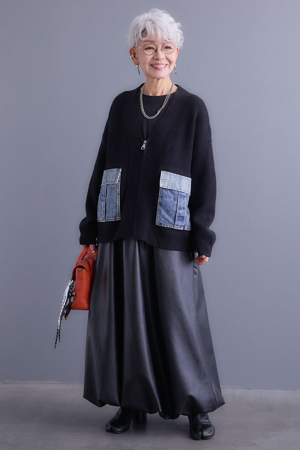 【SET】デニムポケットZIPニットカーディガン+バルーンシルエットエコレザースカート(2set)