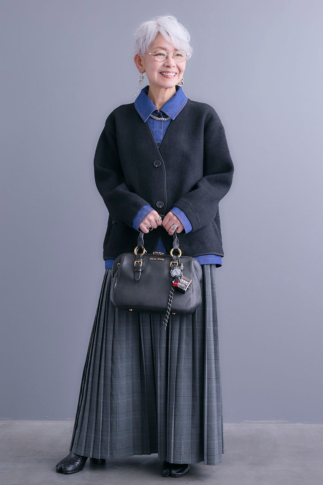 【SET】デニムレイヤードデザインカーディガン+グレンチェックプリーツスカート(2set)