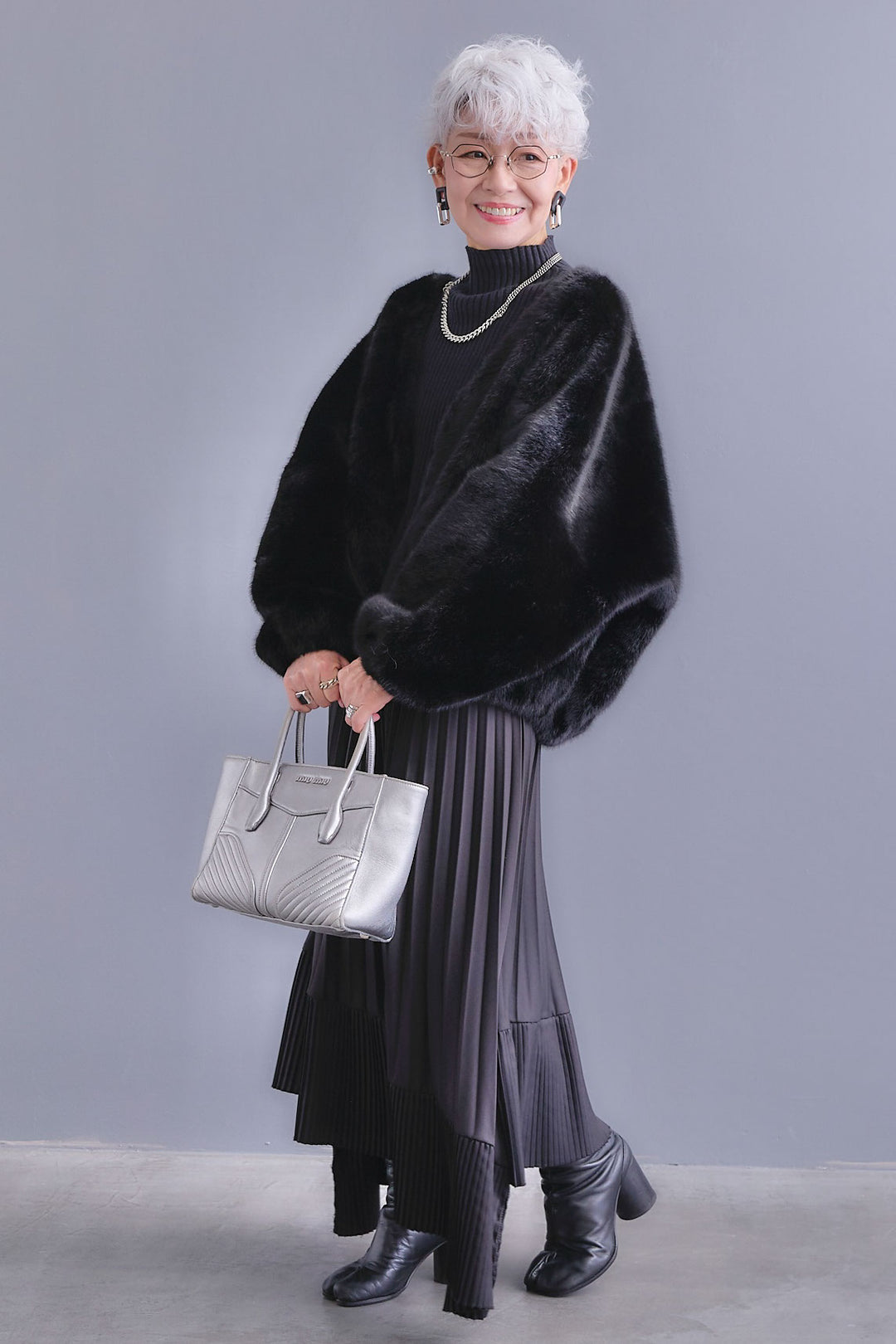 【SET】ボリュームスリーブハイネックリラクシーニット+ノーカラーラウンドシルエットファーコート+アシンメトリープリーツスカート(3set)