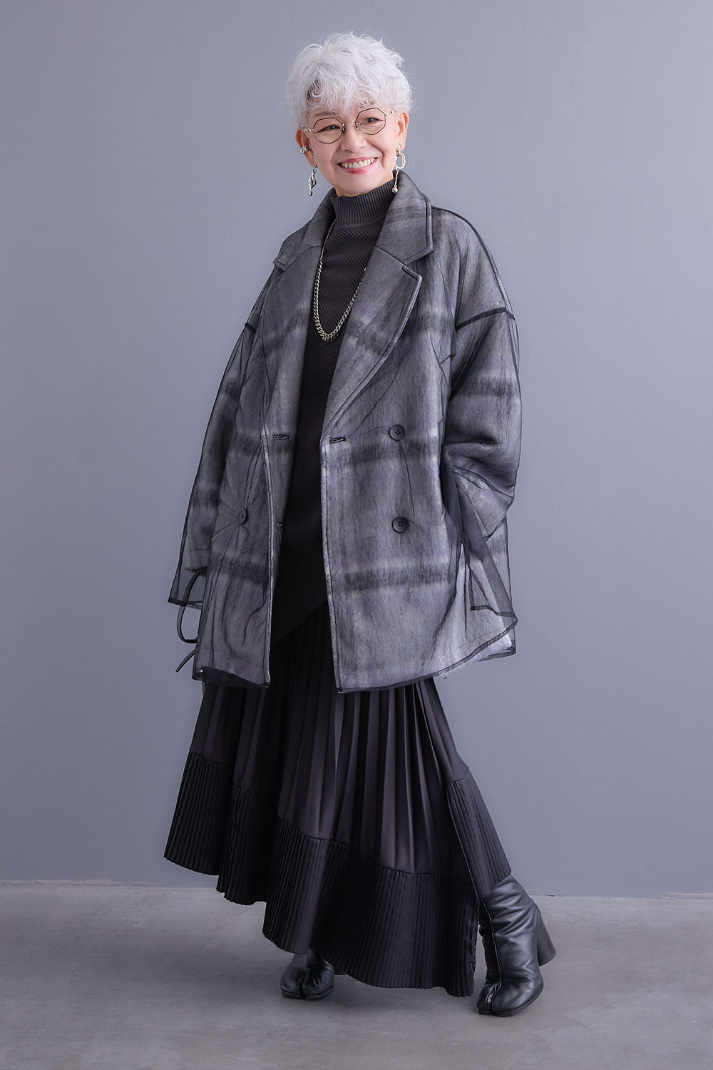 【SET】アシンメトリーオーバーニット+チュールレイヤードシャギーチェックコート+アシンメトリープリーツスカート(3set)
