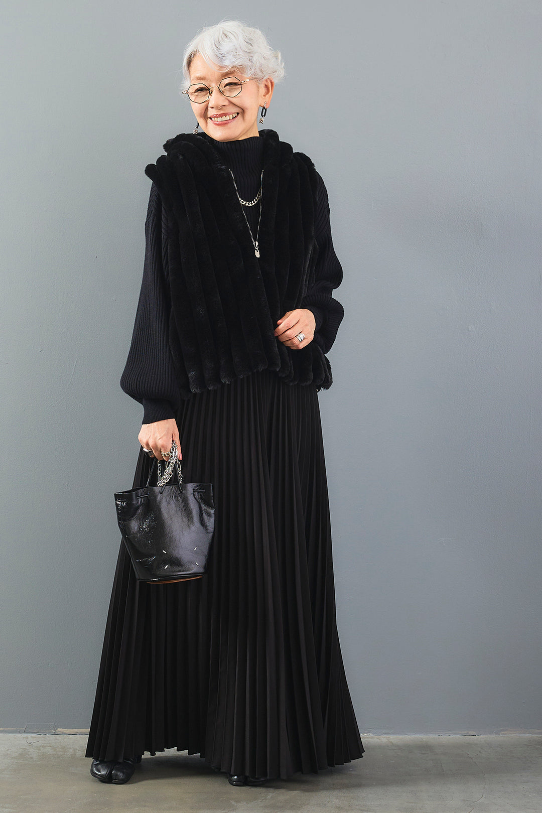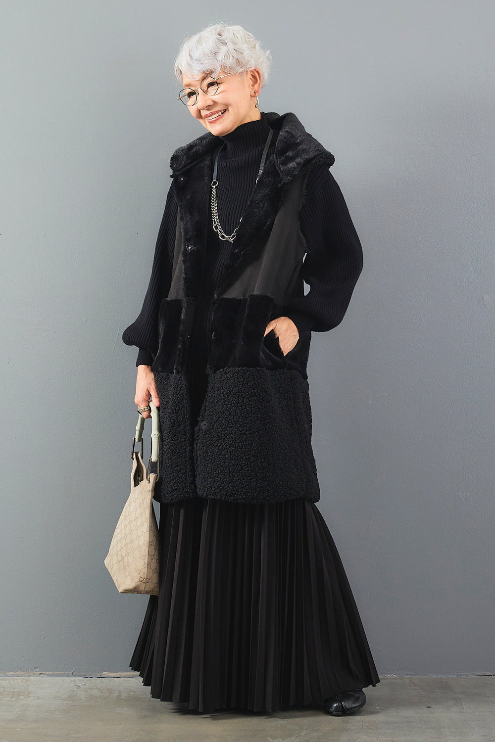 【SET】ボリュームスリーブハイネックリラクシーニット+スエードファーミディベスト+プリーツフレアパンツ(3set)