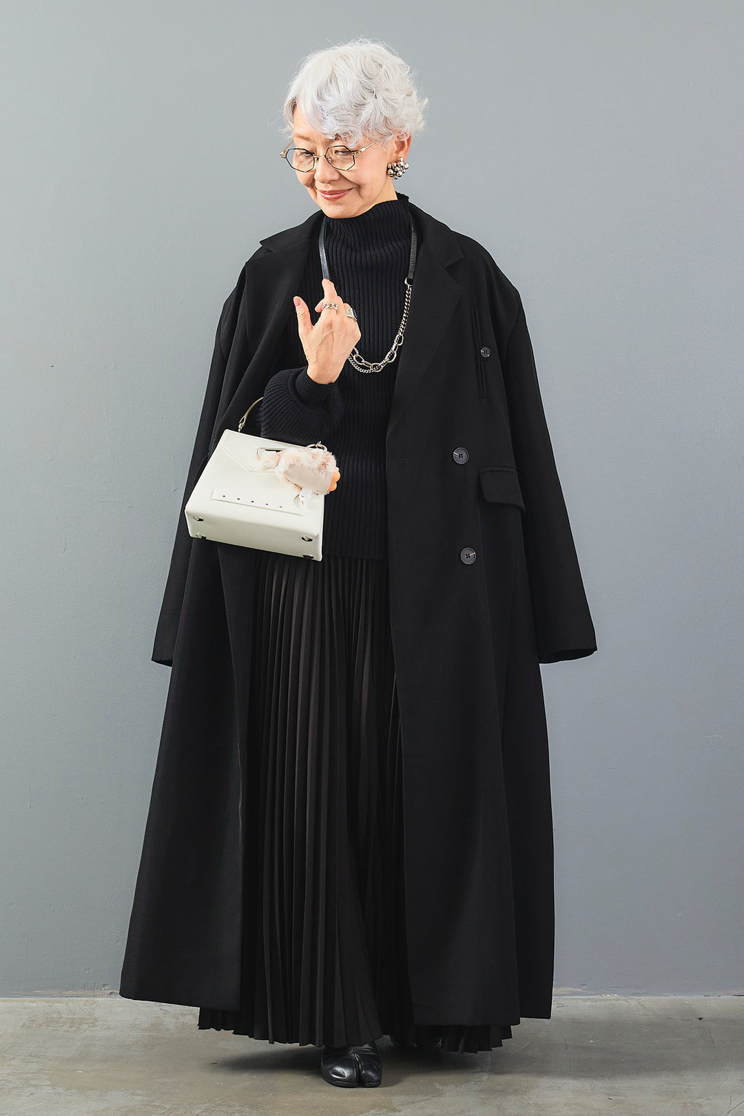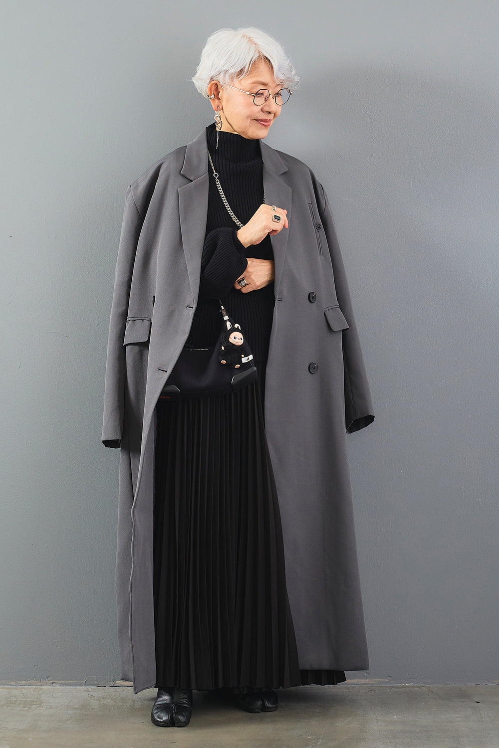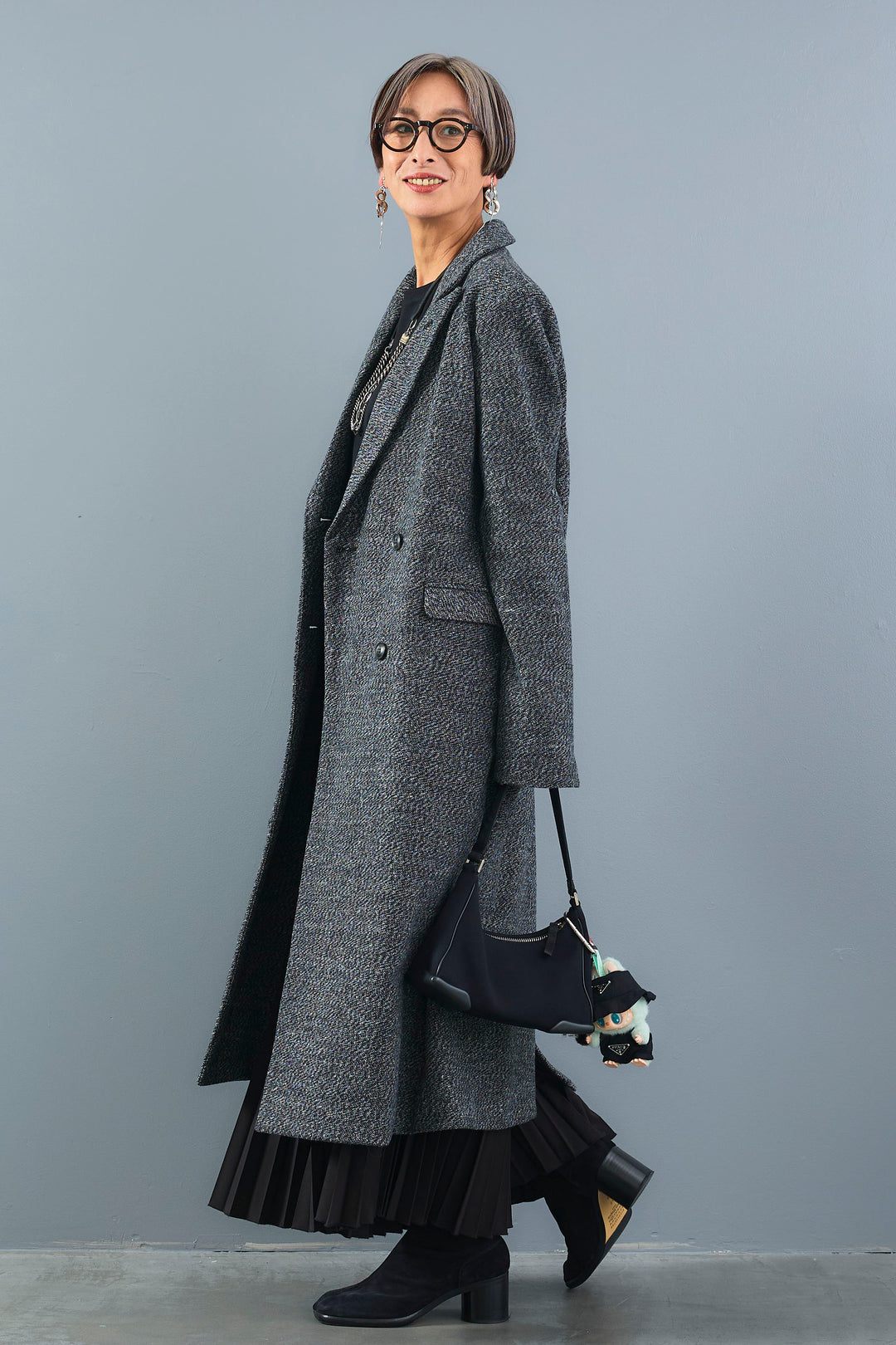 【SET】アシンメトリーロンT+ツイードロングチェスターコート+プリーツフレアパンツ(3set)