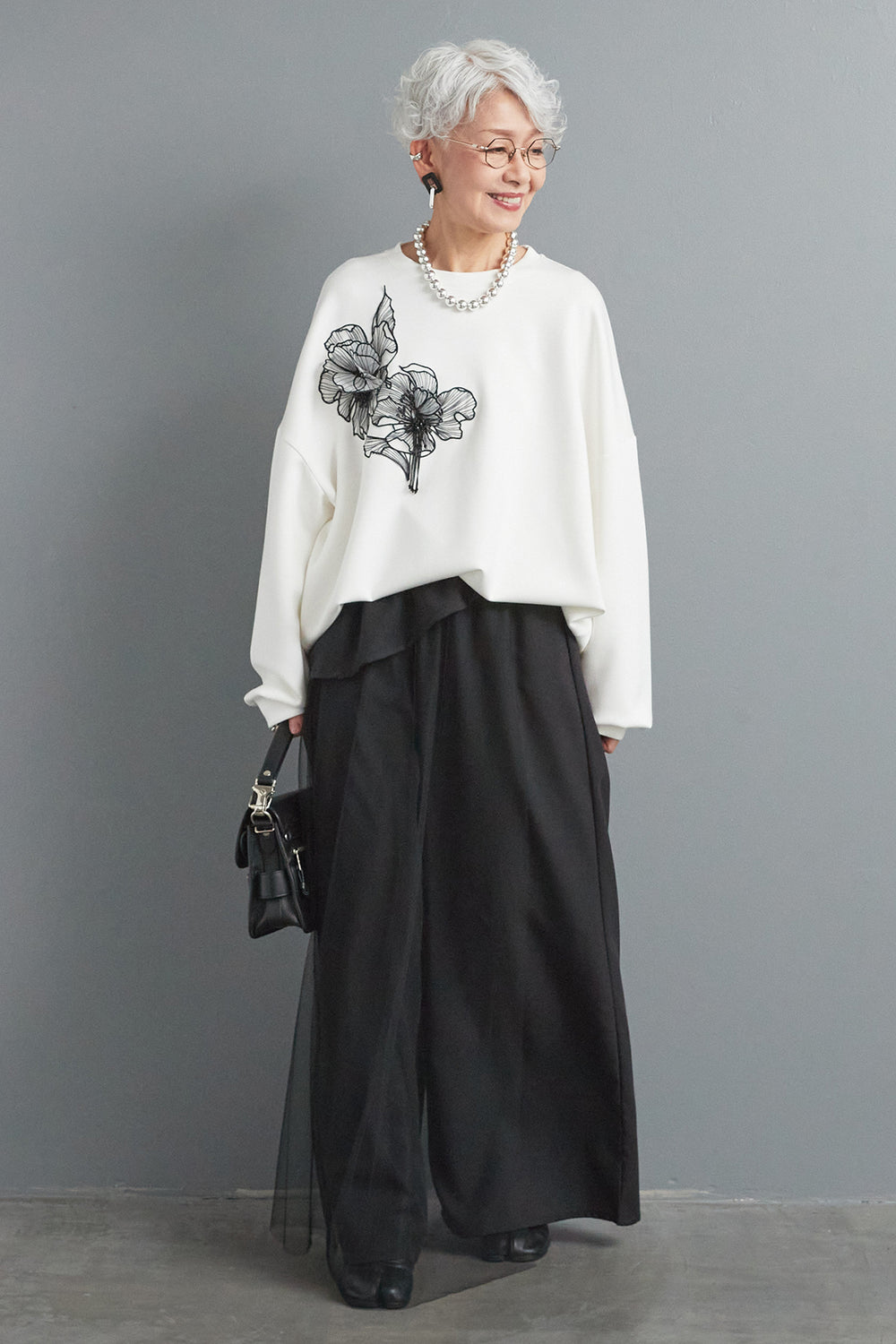 【SET】チュールフラワーデザインプルオーバー+アシメチュールレイヤードワイドパンツ(2set)