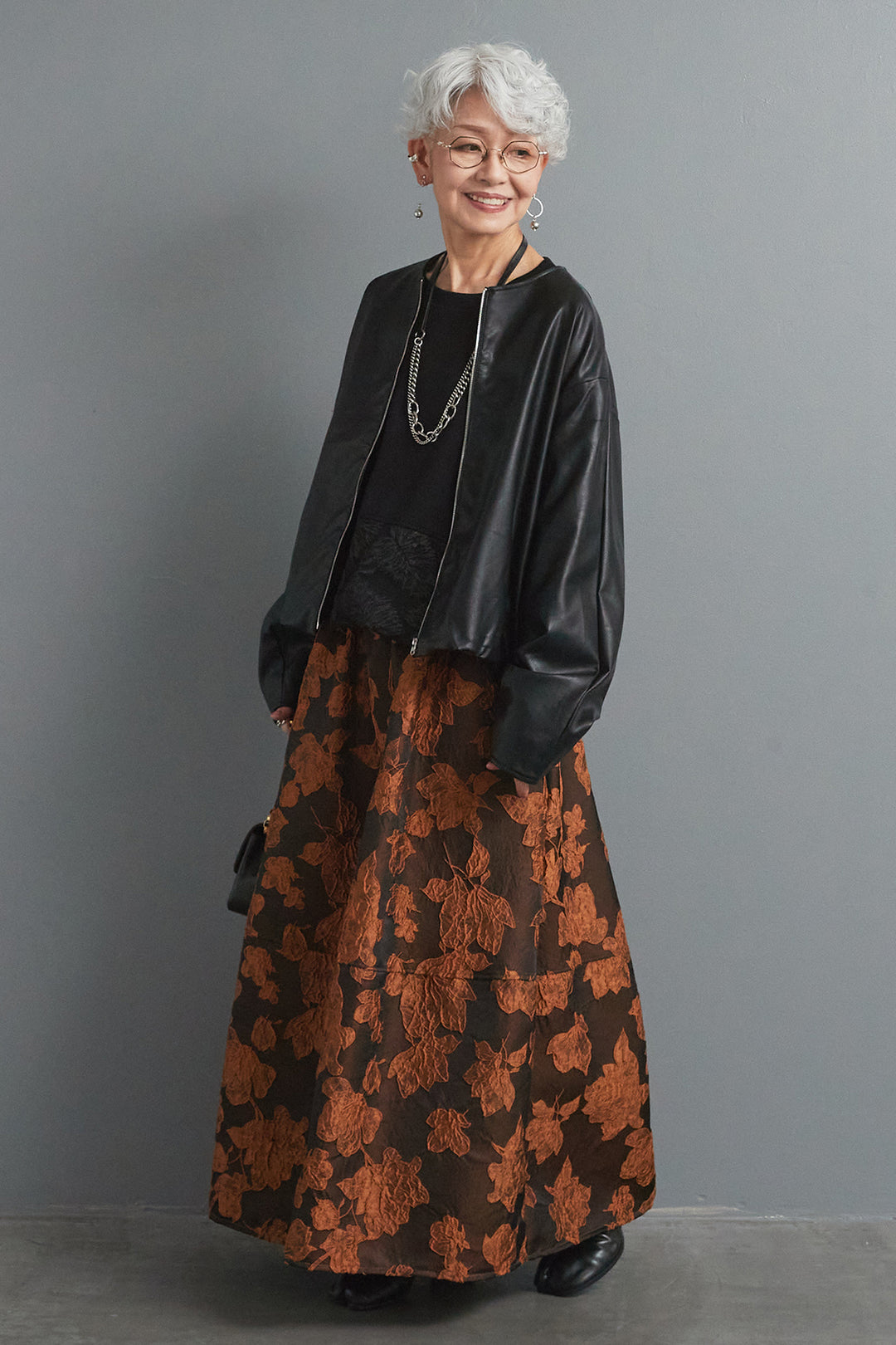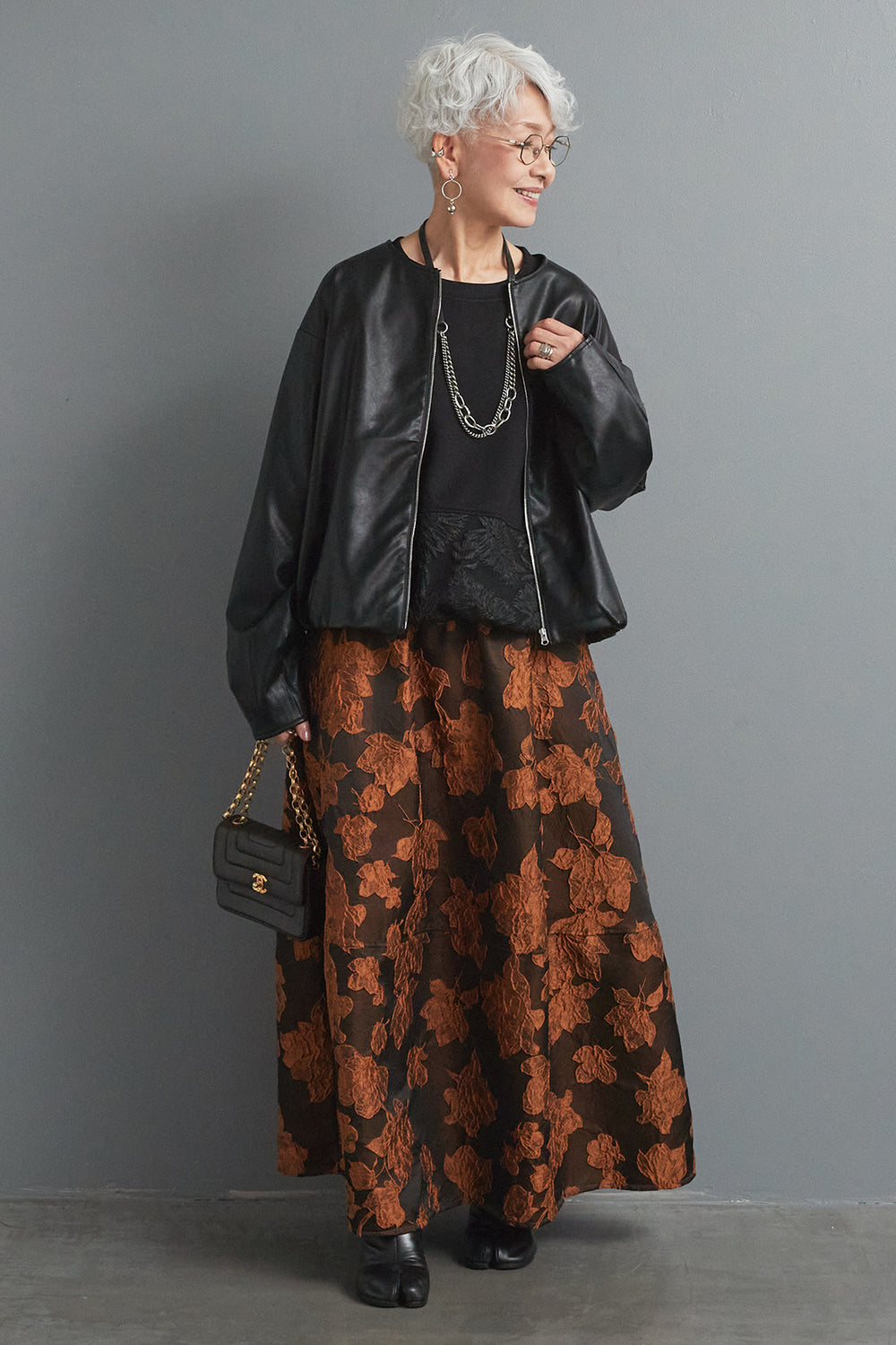 【SET】ジャガードバルーンシルエットプルオーバー+ラウンドシルエットエコレザーノーカラージャケット+ジャガードフラワースカート(3set)