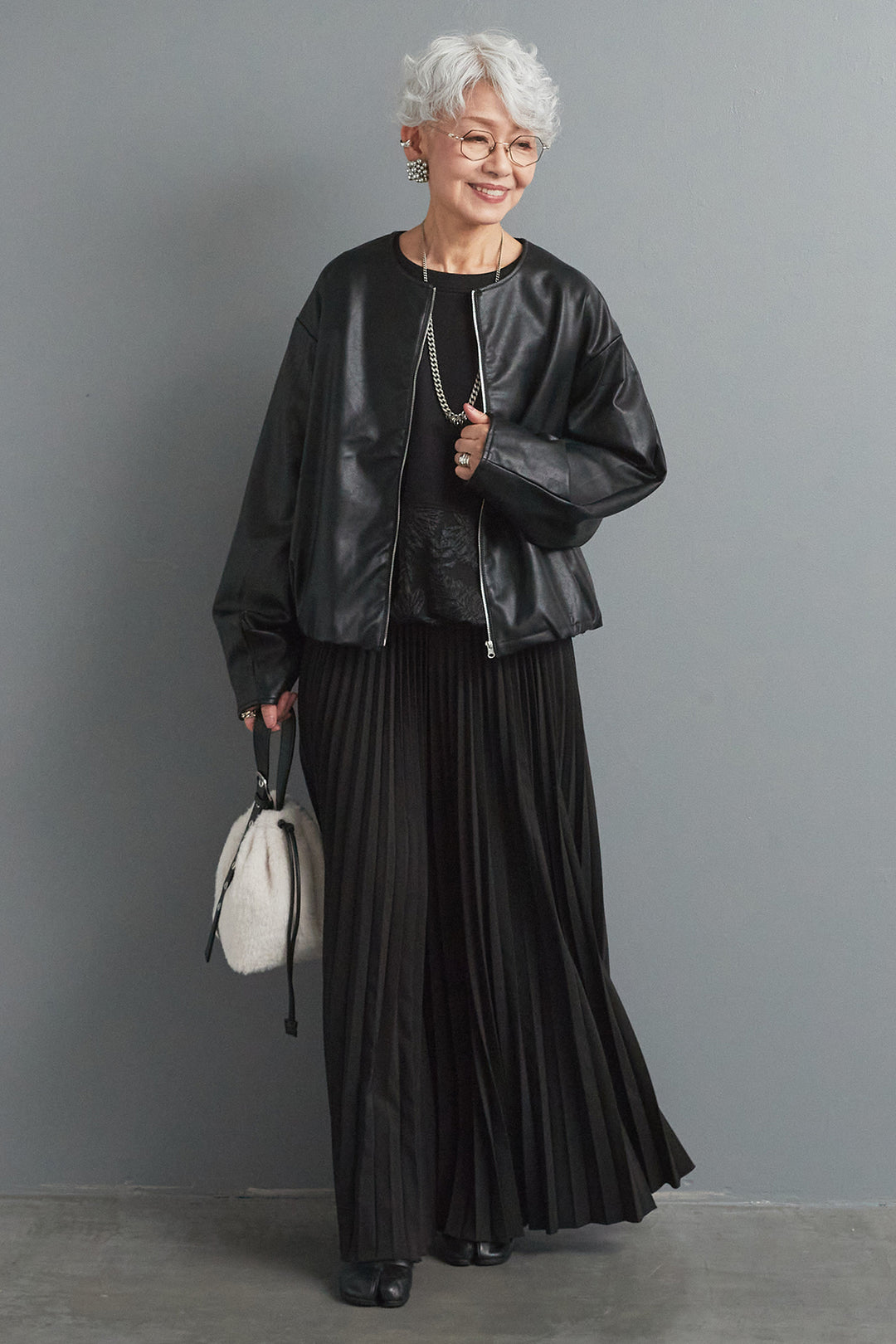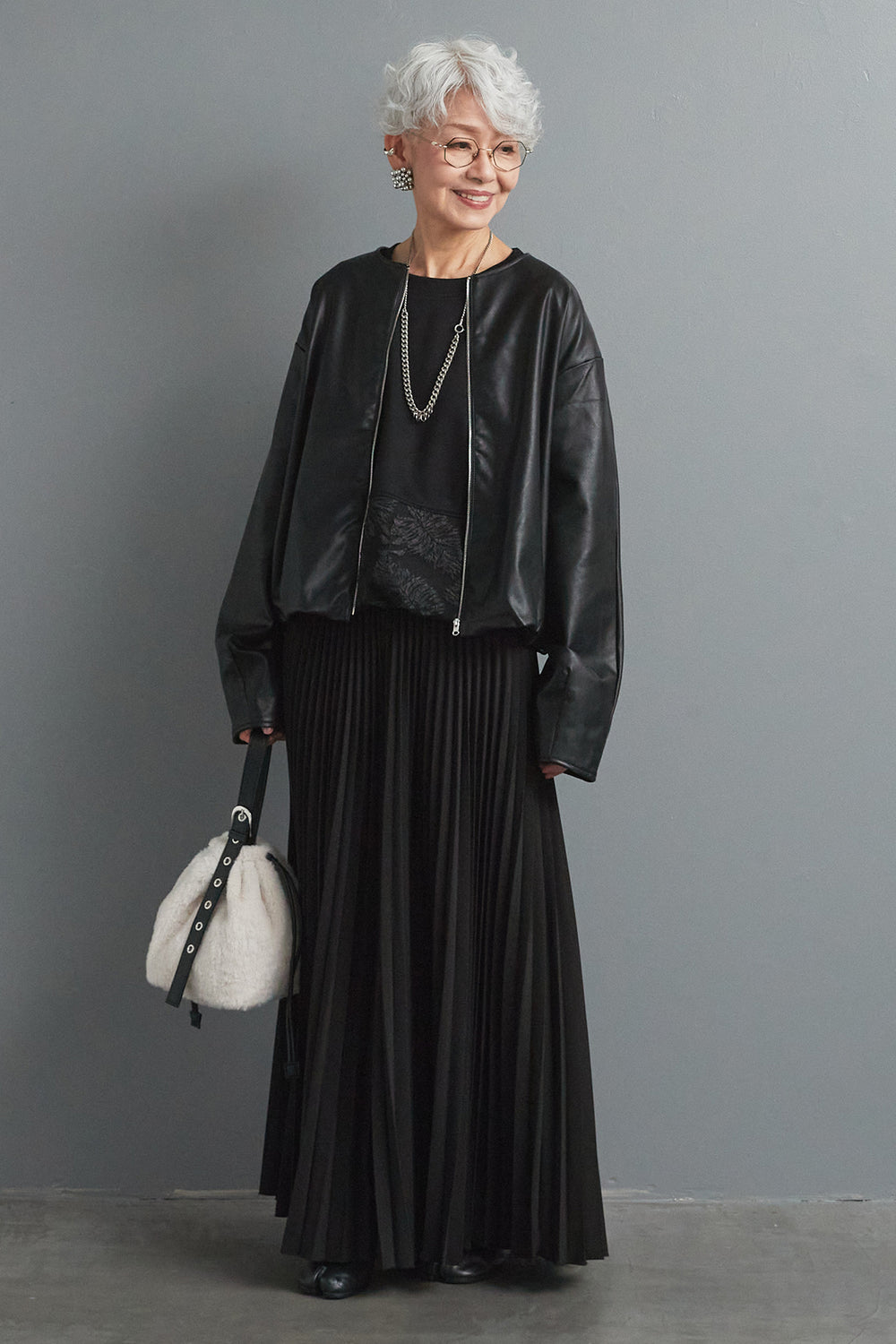 【SET】ラメシアーハイネックロンT+ノーカラーミニマルドルマンジャケット+エコレザーティアードフレアロングスカート(3set)