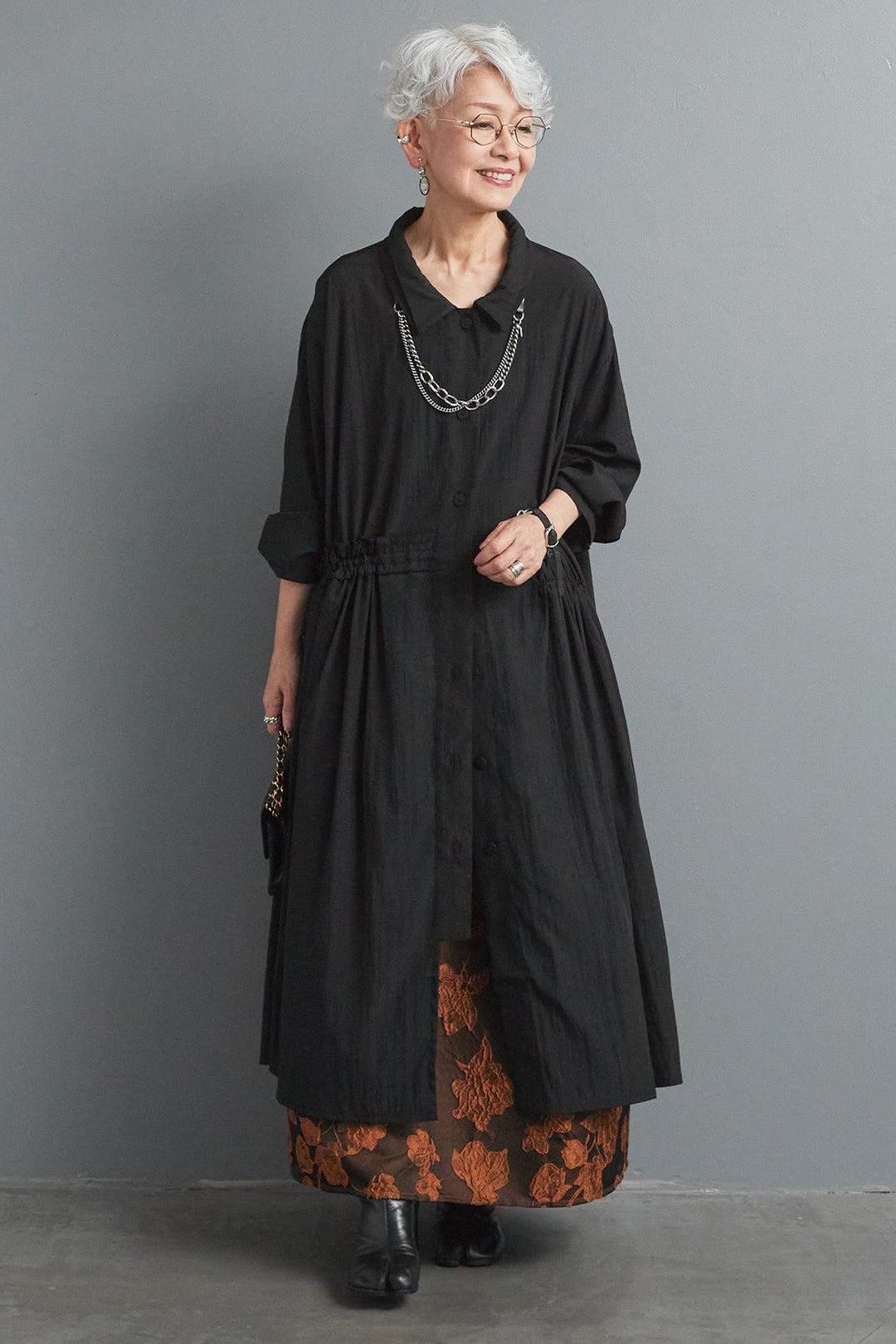 【SET】ダブルカラーアシメギャザーシャツワンピース+ジャガードフラワースカート(2set)