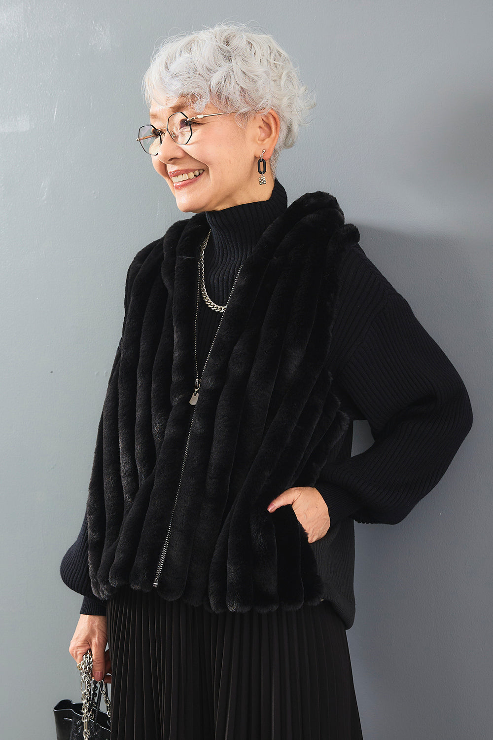 【SET】ボリュームスリーブハイネックリラクシーニット+ストライプファーフードベスト+プリーツフレアパンツ(3set)