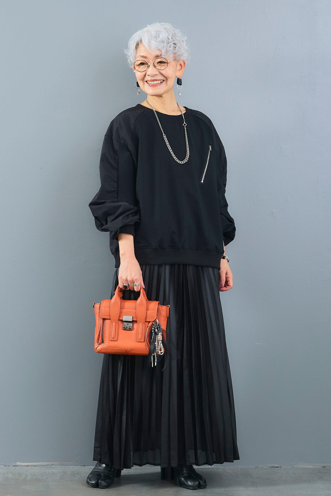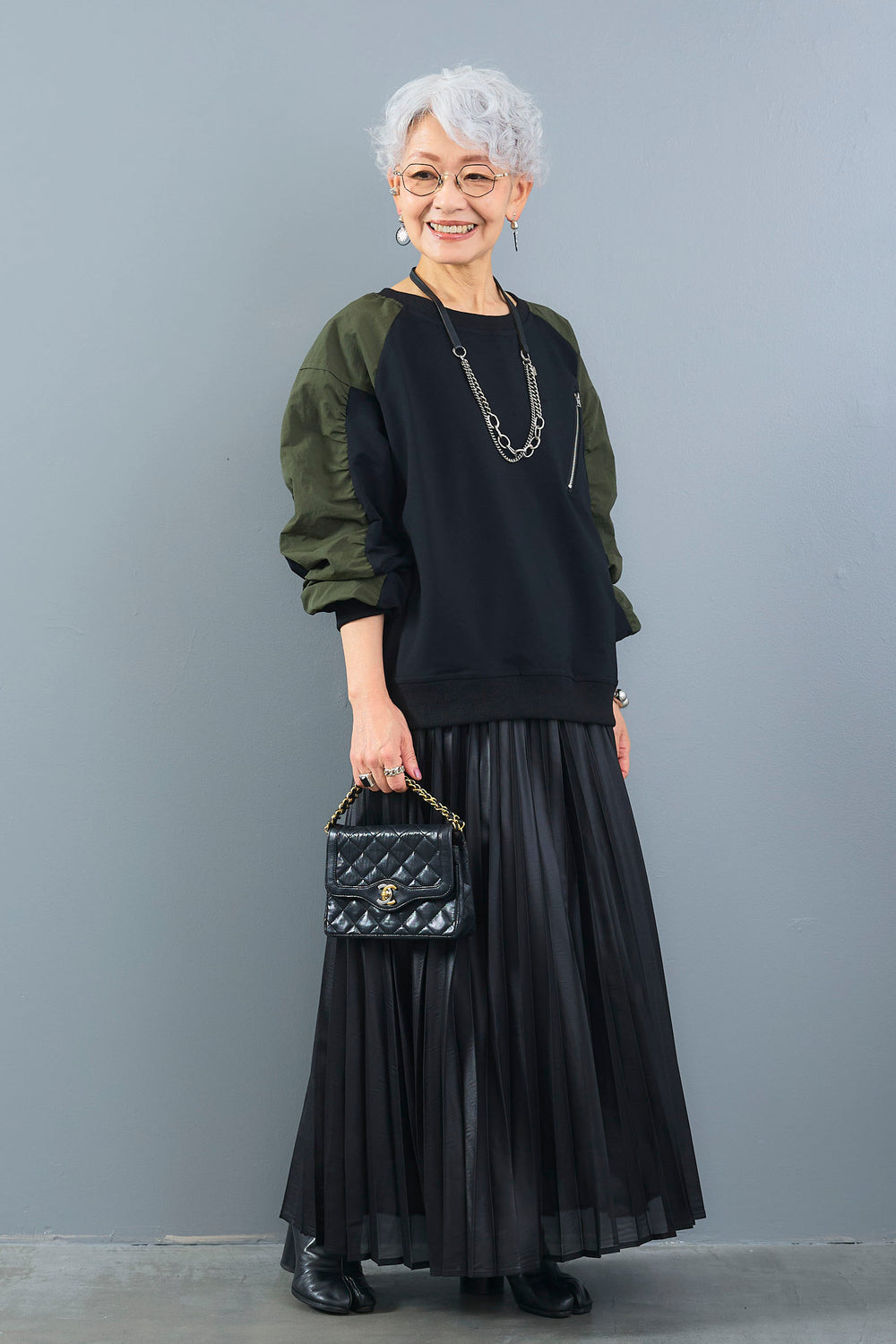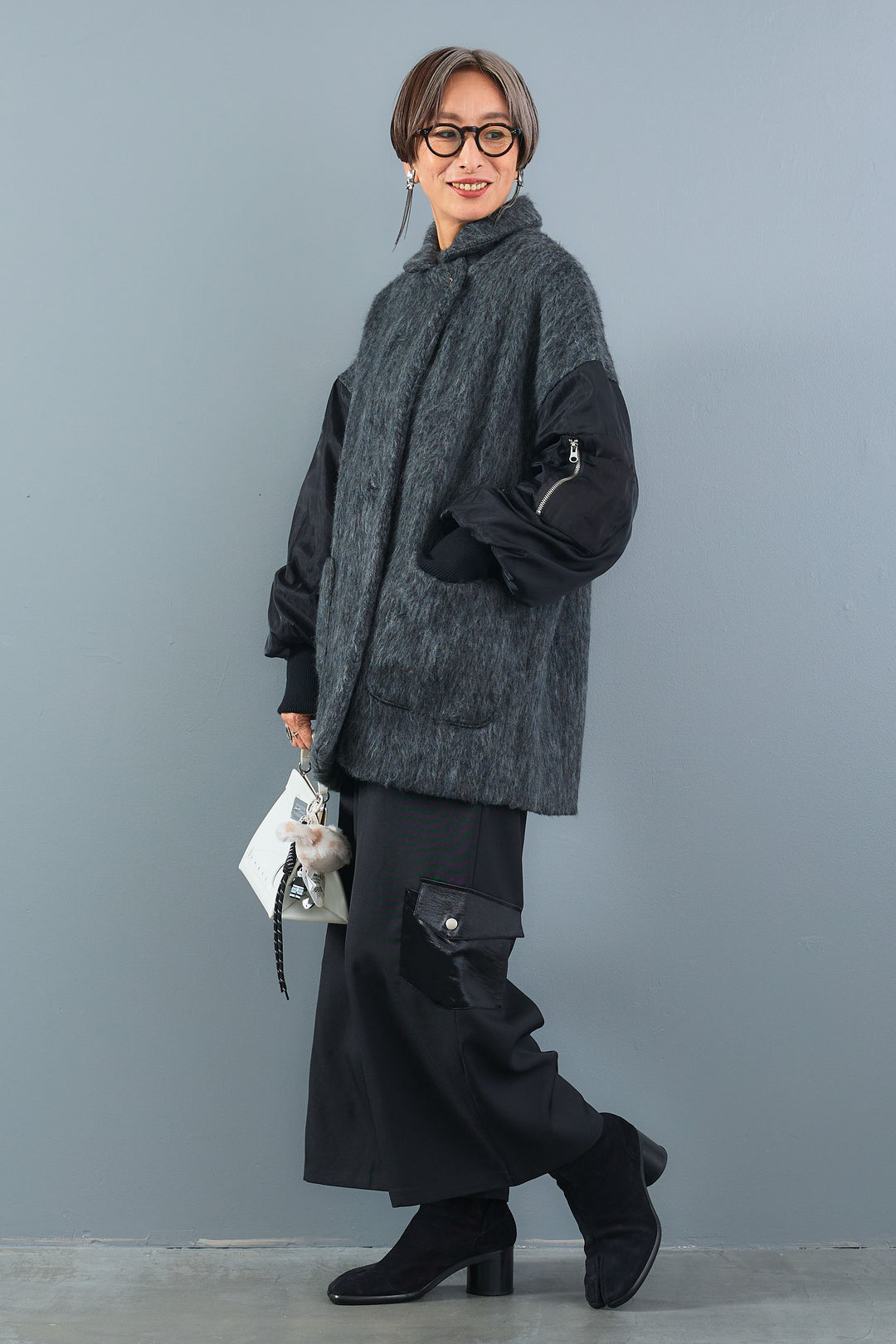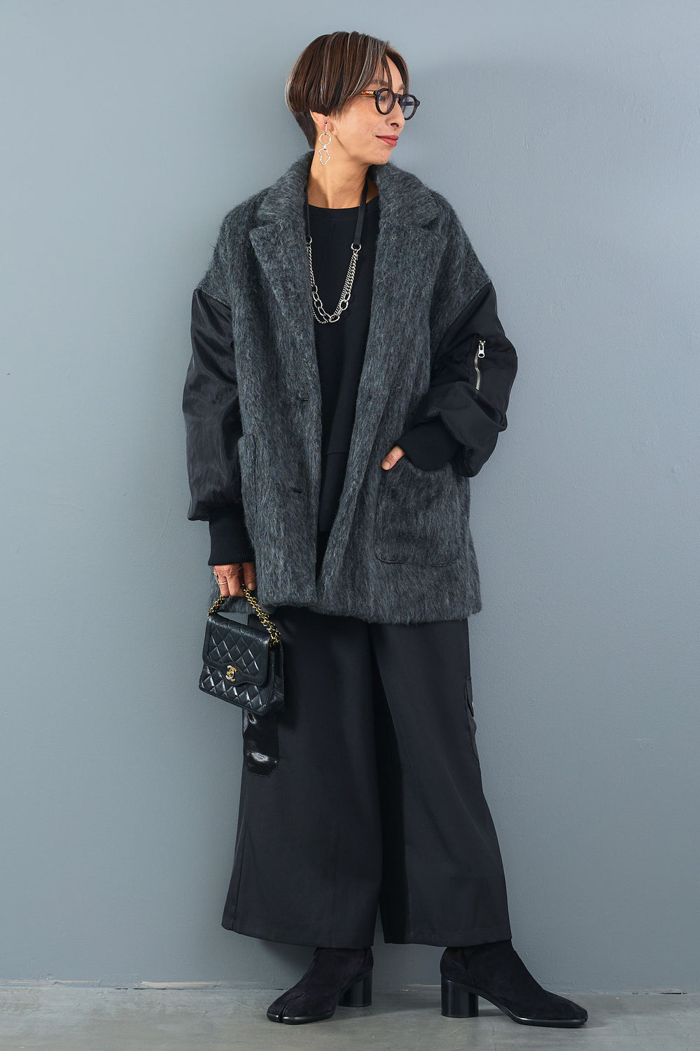 【SET】ZIPデザインアシンメトリープルオーバー+チュールレイヤードMA-1シャギーオーバーコート+パテントデザインワイドパンツ(3set)